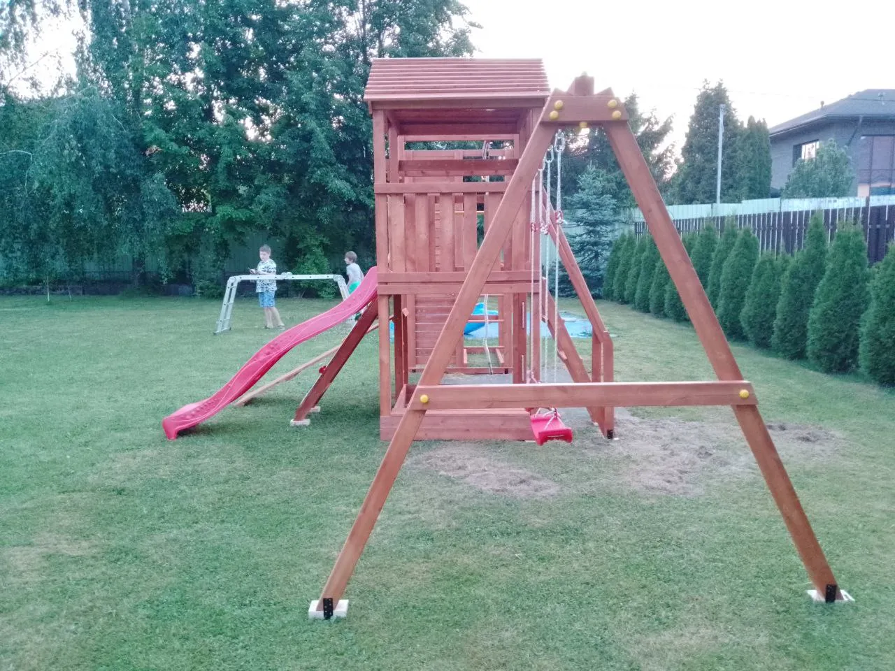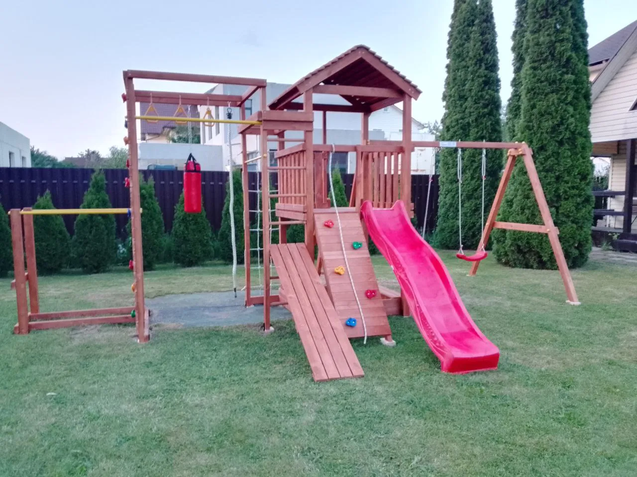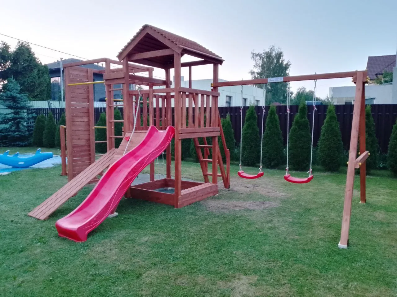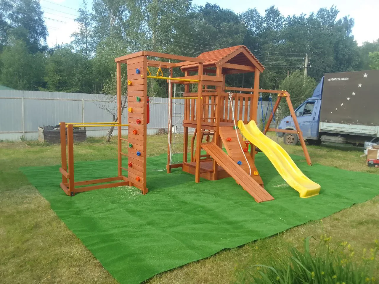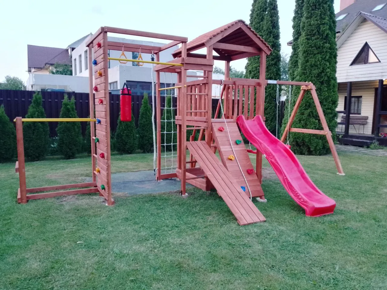 Комплекс выполнен из качественной древесины, обработанной для защиты от внешних воздействий. Все соединения надежно закреплены, а болтовые соединения закрыты пластиковыми заглушками.