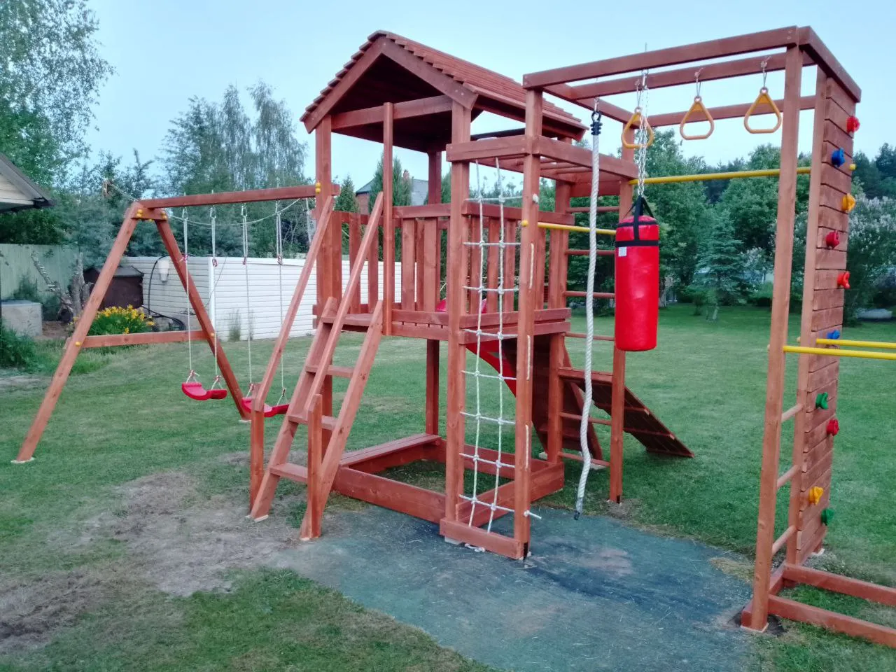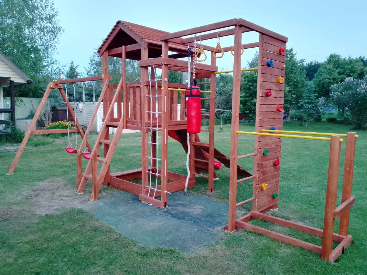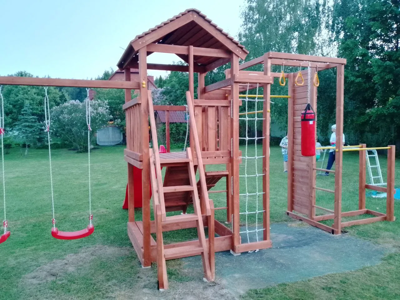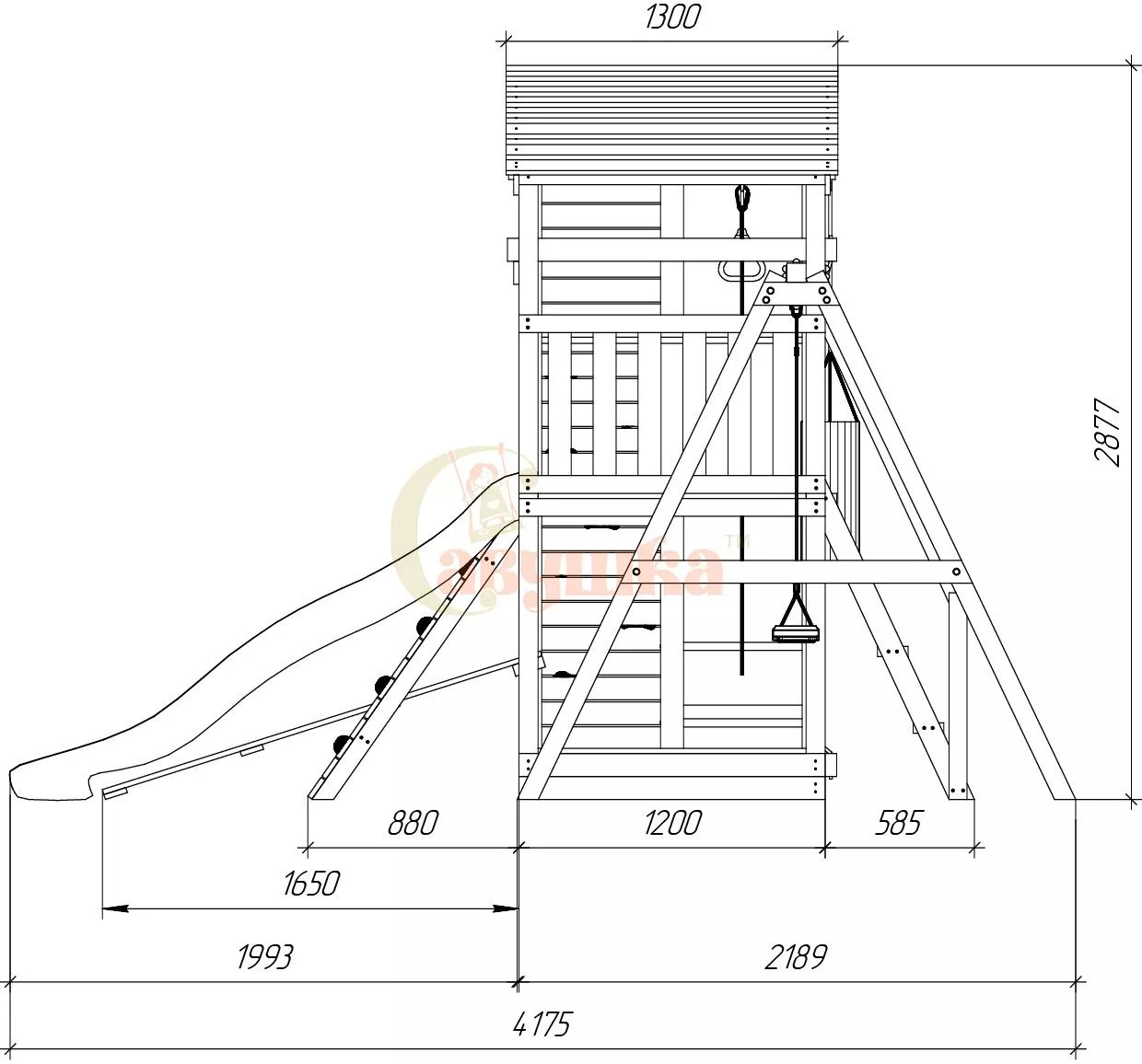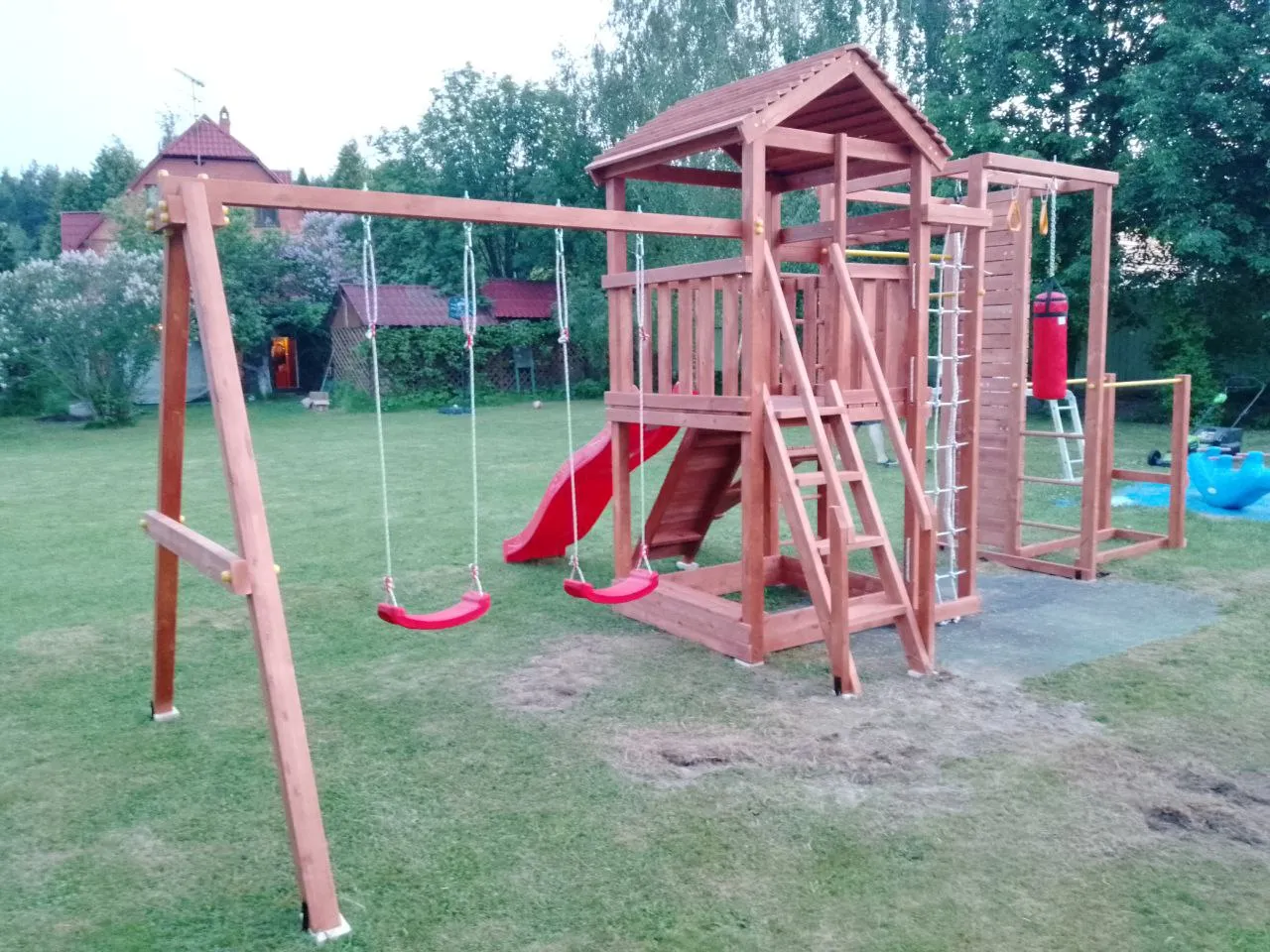 Комплекс выполнен из качественной древесины, обработанной для защиты от внешних воздействий. Все соединения надежно закреплены, а болтовые соединения закрыты пластиковыми заглушками.