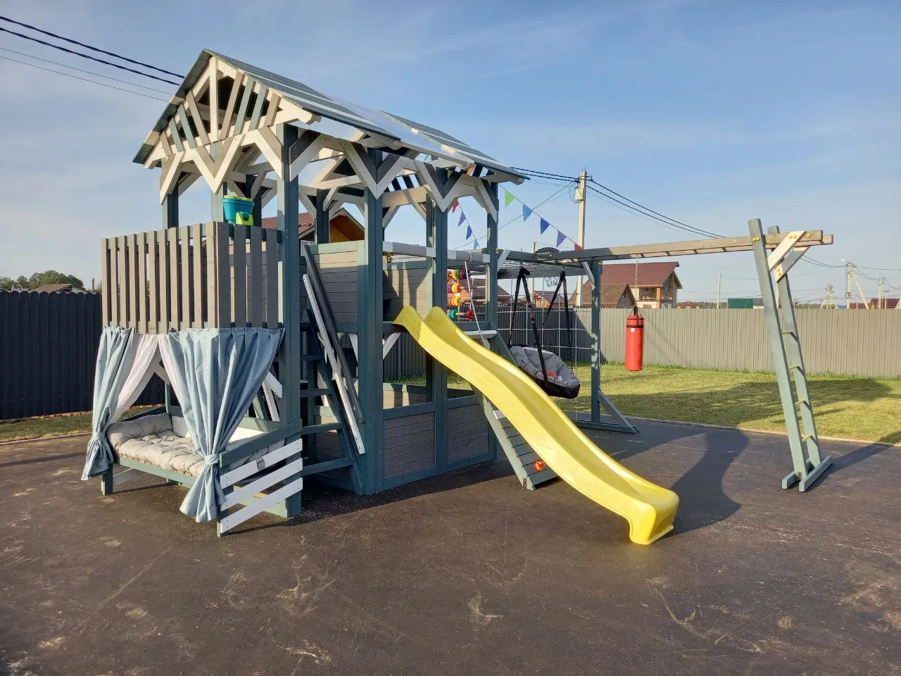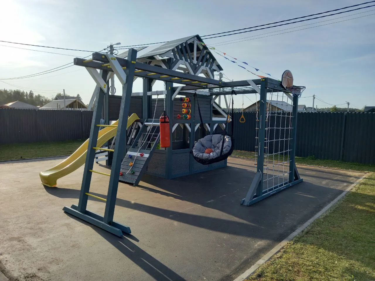 - Глубокая песочница 1,7×0,8 м — для замков и куличей мечты.