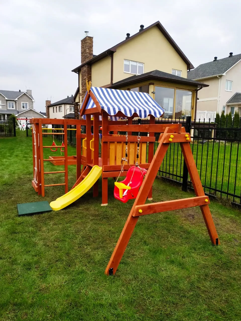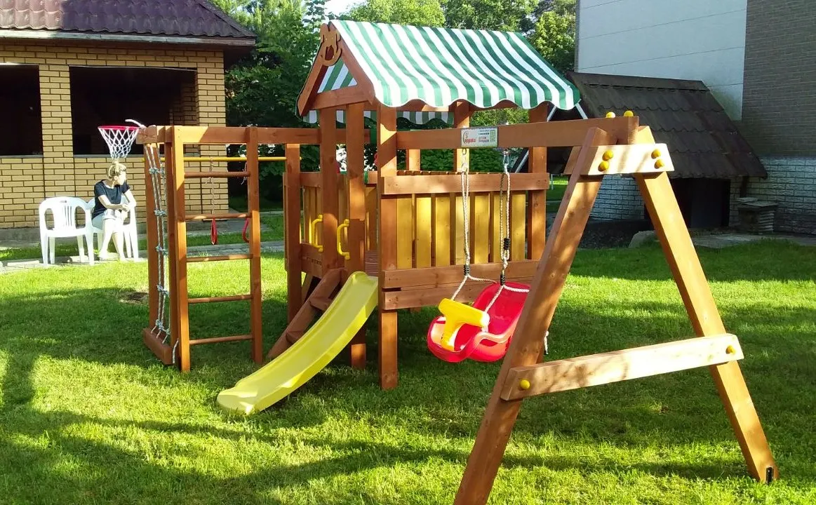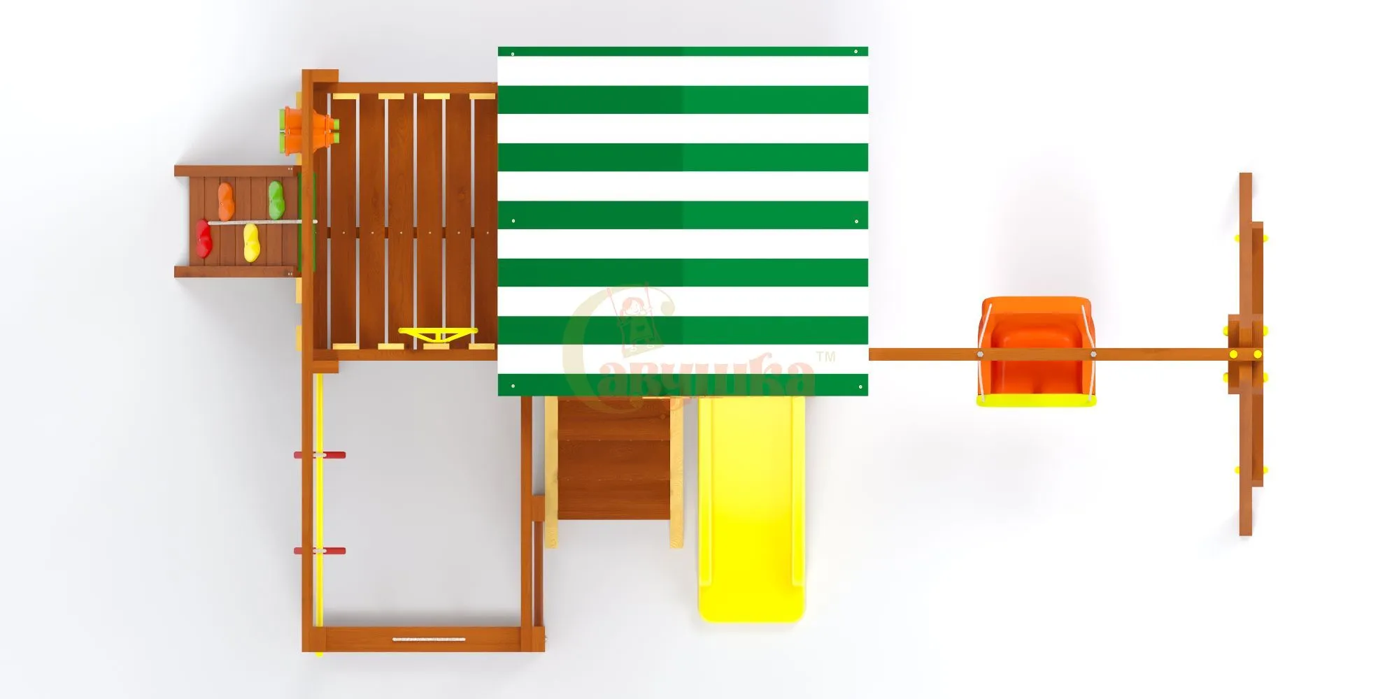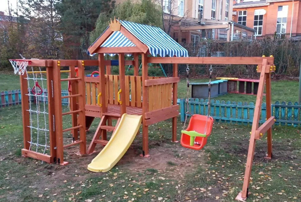 Модель выполнена в строгом соответствии со стандартами ГОСТ. Мы используем только лучшие натуральные и экологичные материалы, безопасные для детского здоровья. Прочный каркас с закругленными элементами выдерживает уличные условия и большие нагрузки.