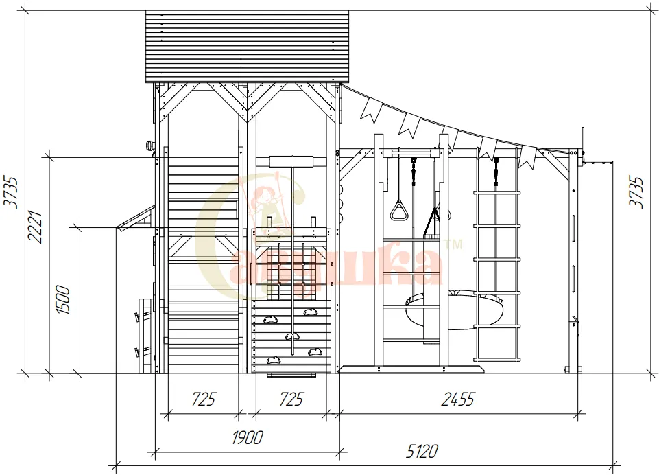 - Множество лазательных и спортивных элементов, широкие возможности для тематических игр.