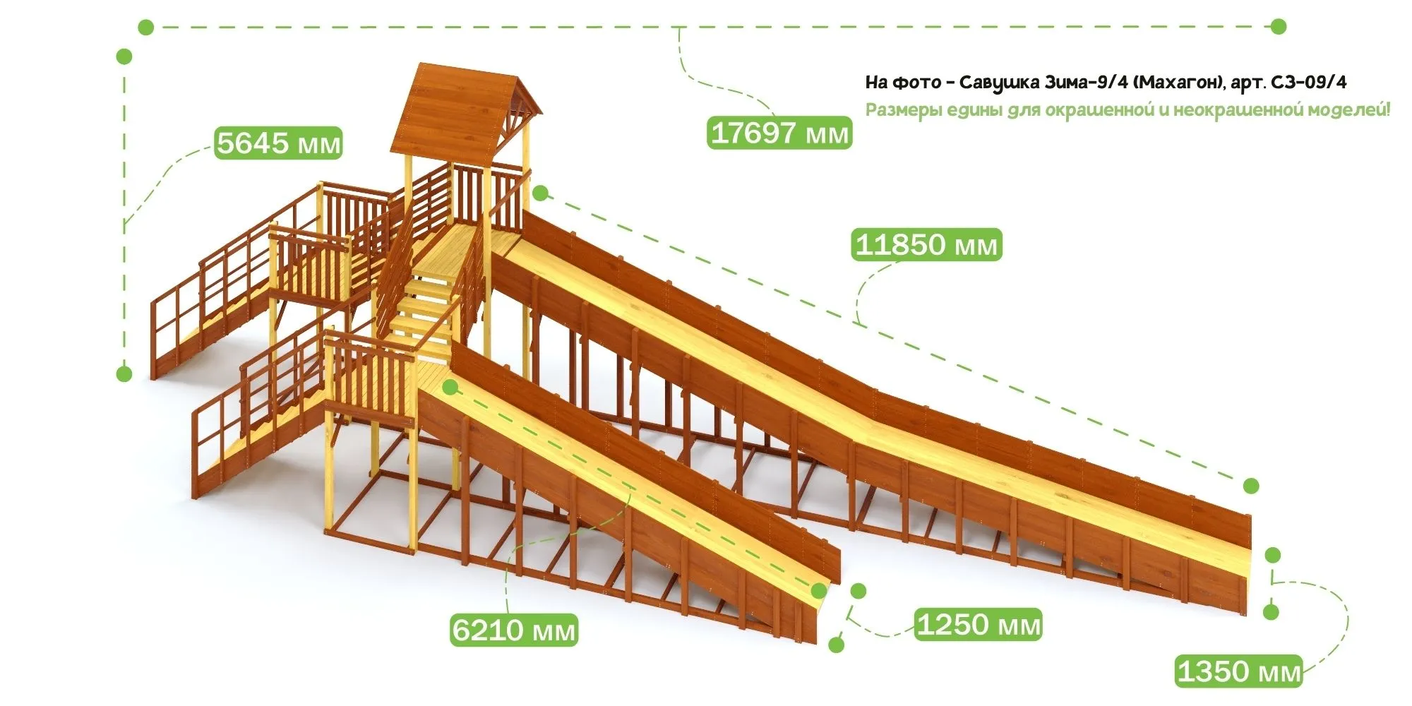Савушка Зима Wood 9/4 — это многоуровневая зимняя горка с двумя длинными скатами (6,2 м и 11,8 м). Идеально подходит для активных игр, катания на тюбингах и ледянках. Благодаря прочной конструкции и широкой платформе, эта модель станет центром зимних развлечений во дворе, парке или общественном пространстве.