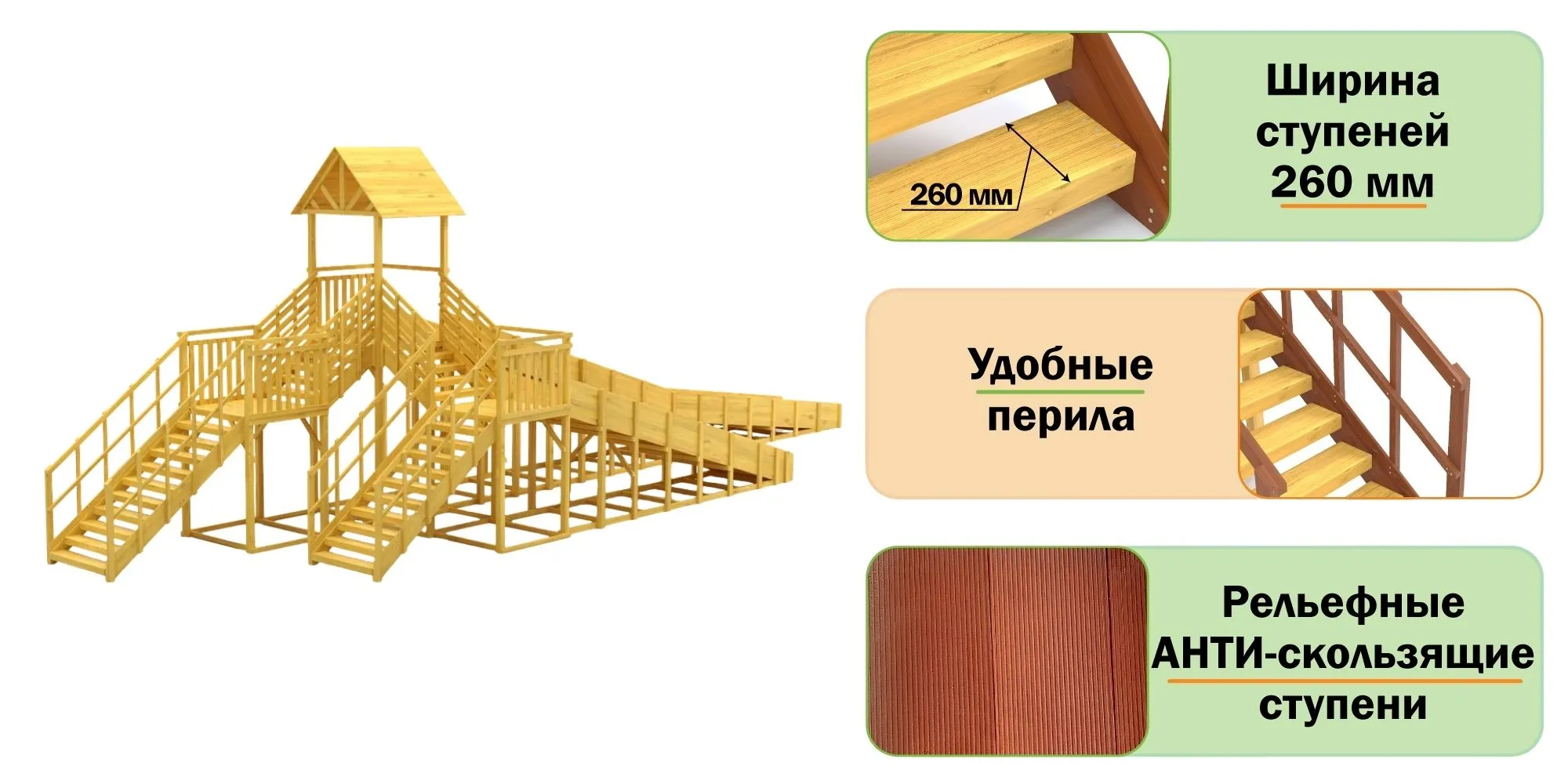- Безопасность: широкие антискользящие ступени и высокие ограждения.