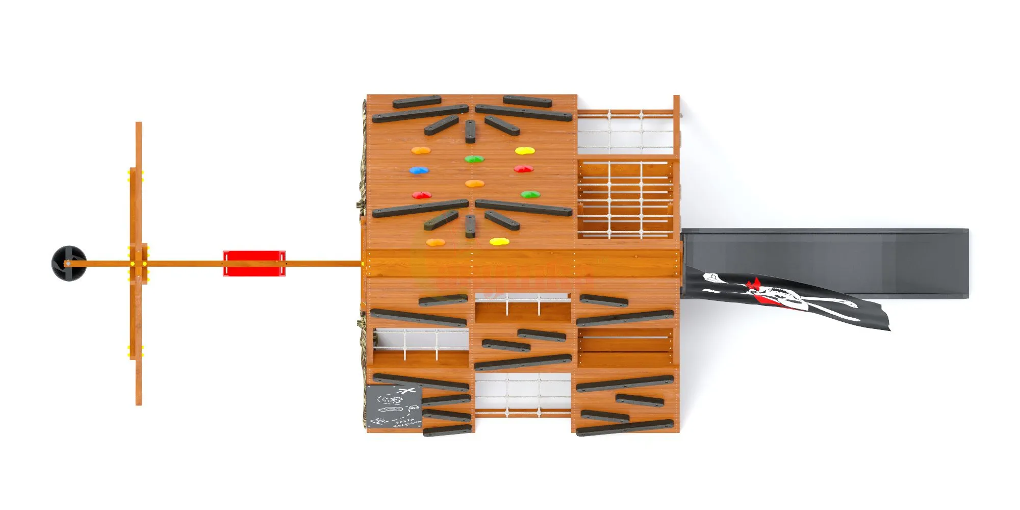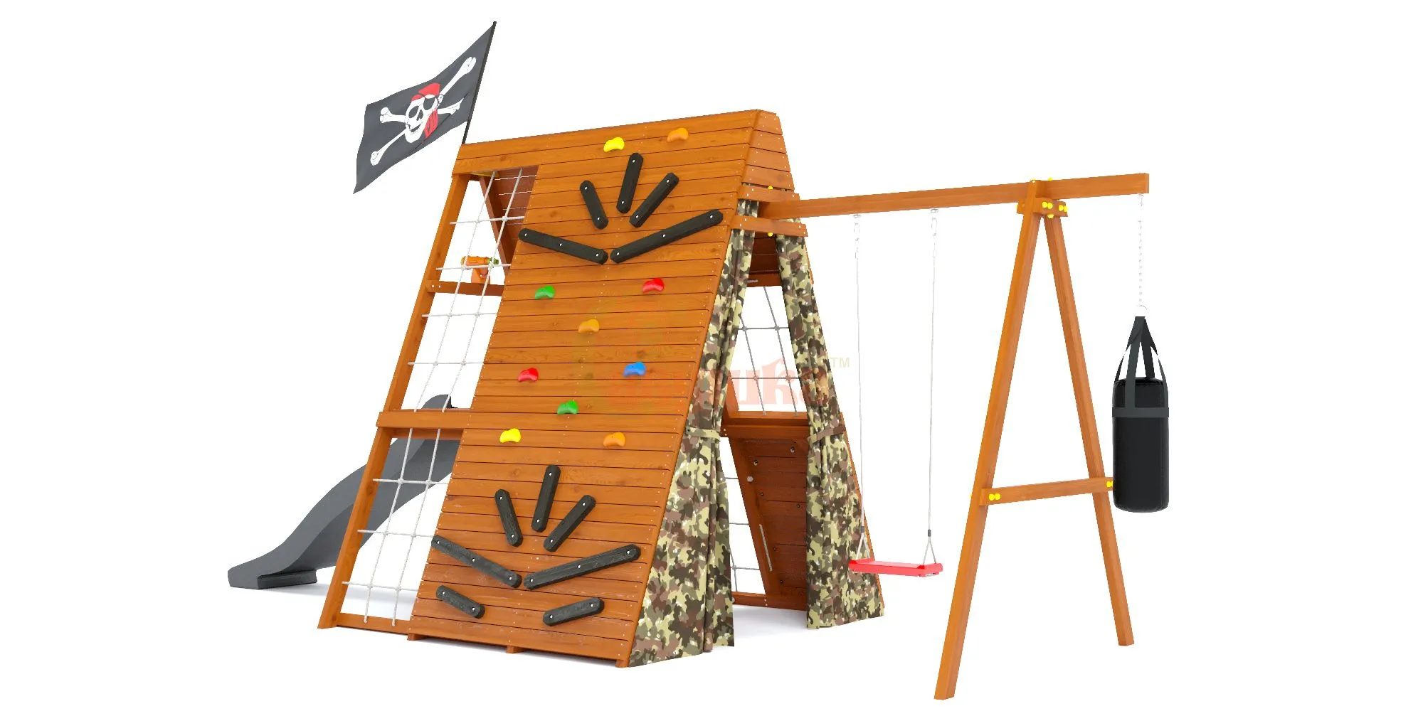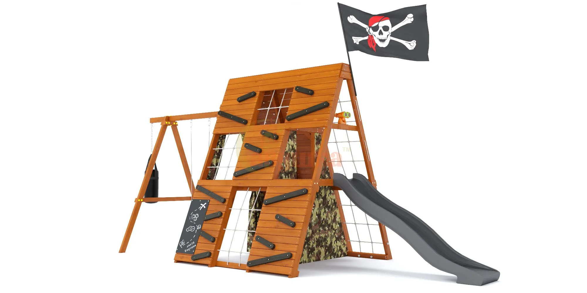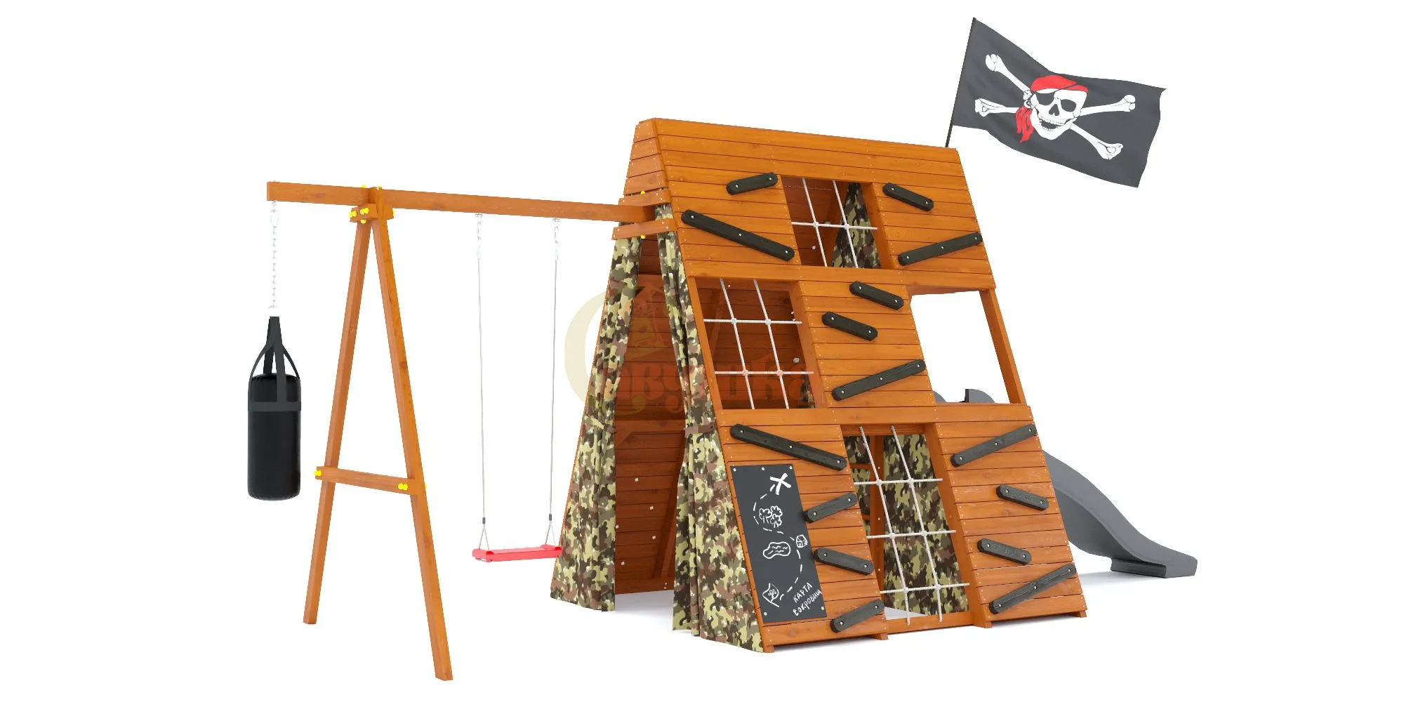 Игровой комплекс на дачу Савушка имеет много различных элементов: дизайнерский скалодром, многосекционный скалодром, пластиковые зацепы, разноуровневые гладиаторские сетки, сетка-лазалка, меловая доска размером 810 х 390 мм, бинокль, горку высотой 2,2 м, платформу для спуска, внутренний лаз с выходом на платформу, внутреннюю лестницу, большой пиратский флаг с флагштоком большого размера, качельный блок с качелями лодочка и боксерскую грушу.