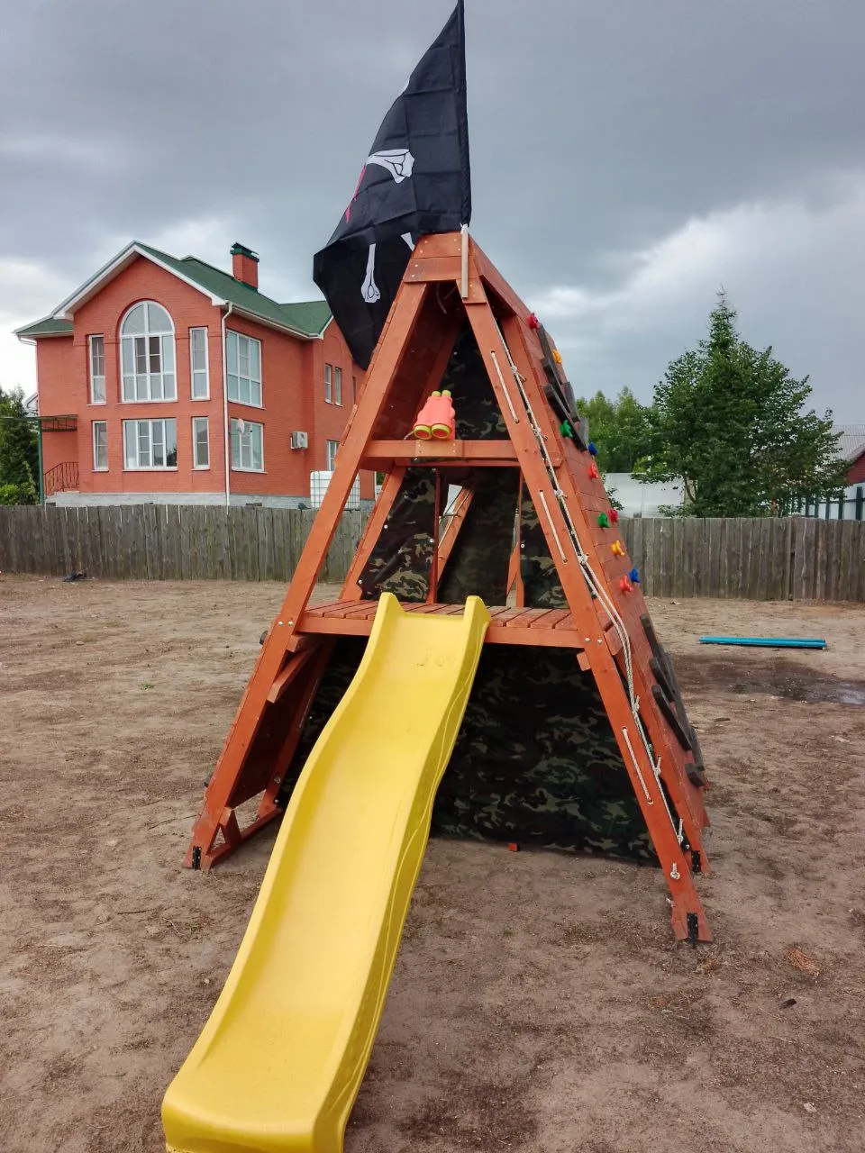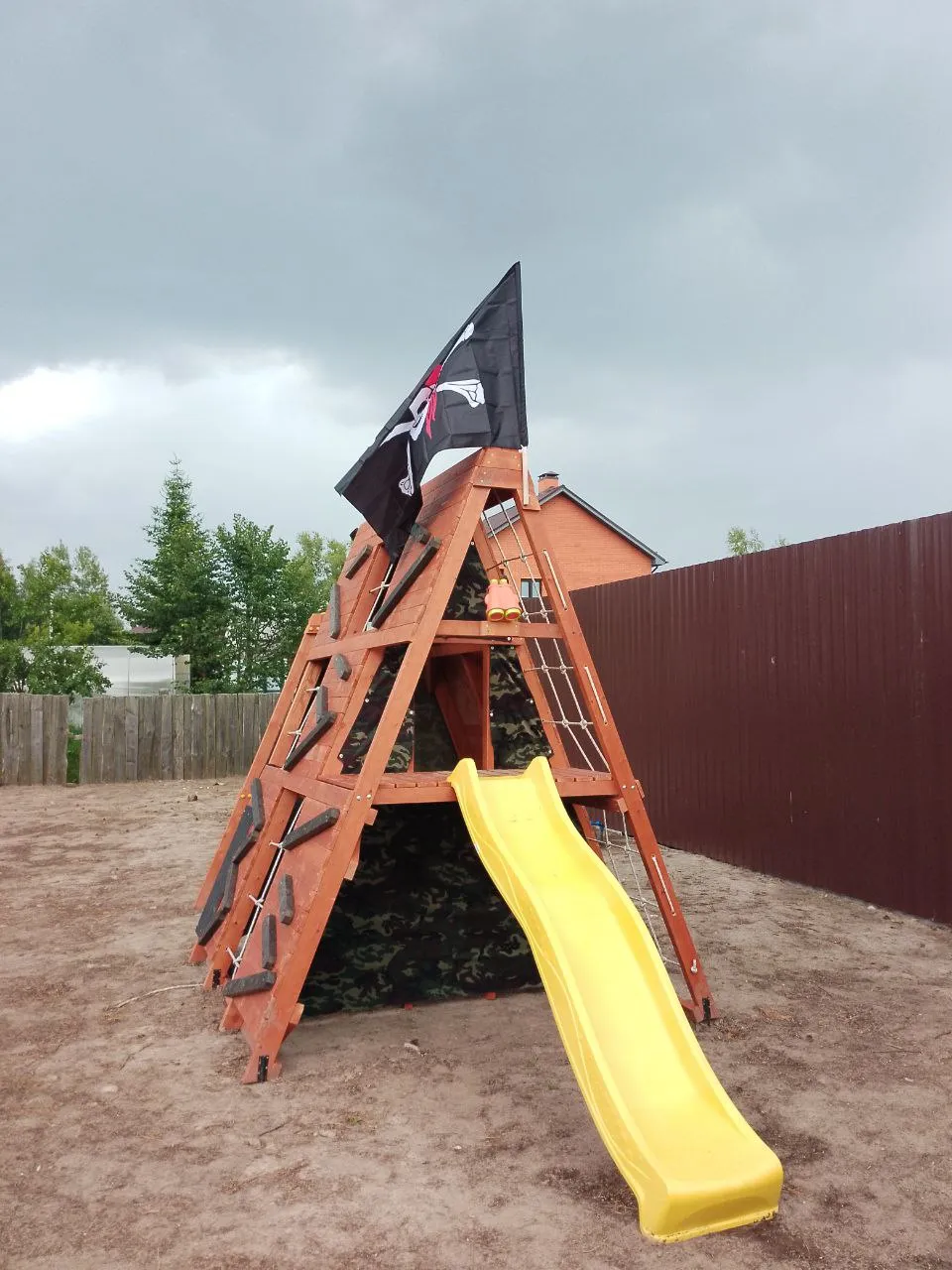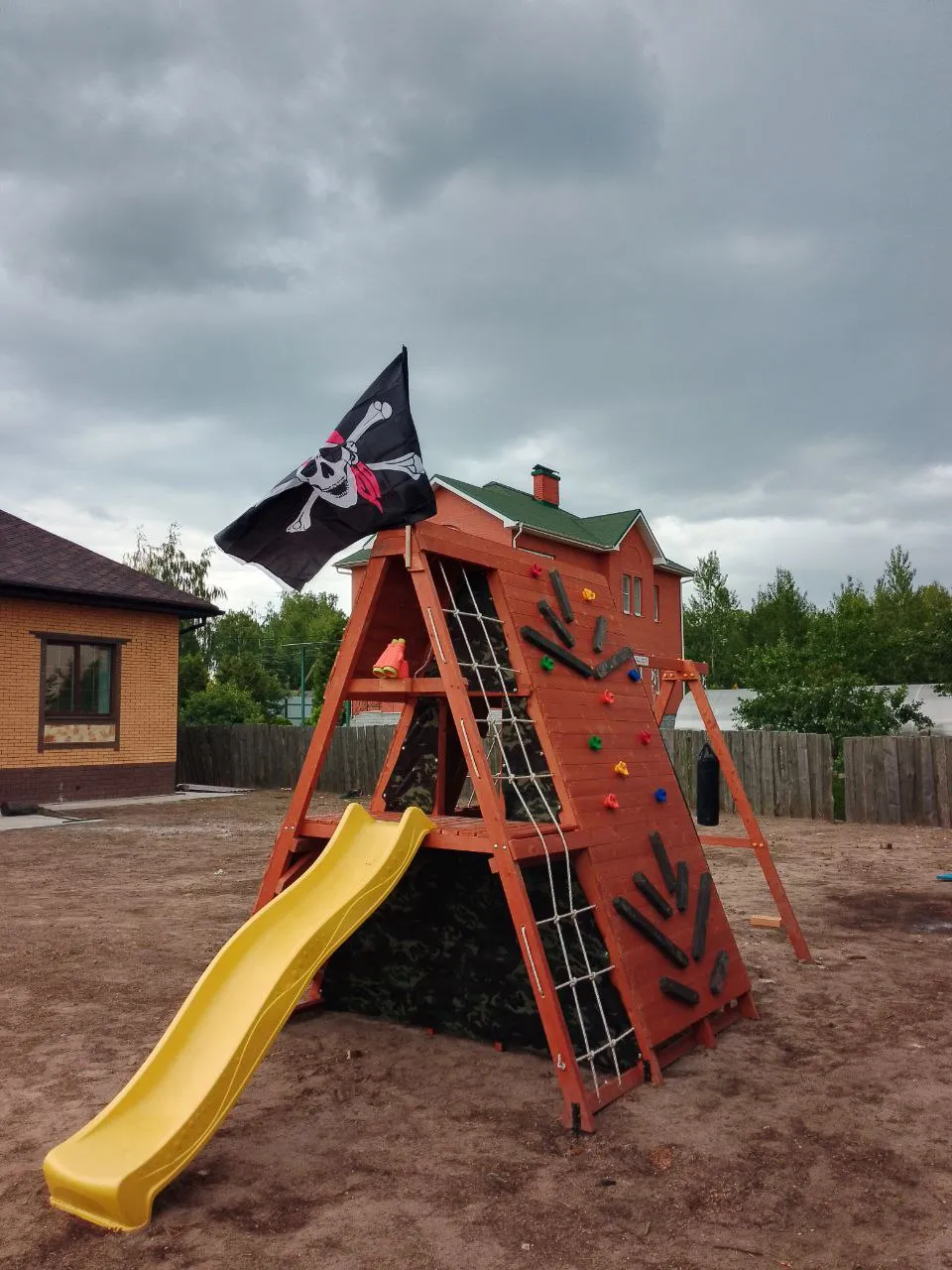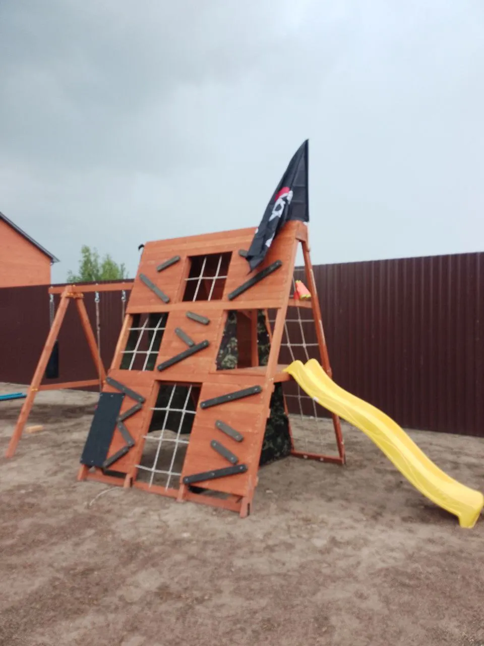 Игровой комплекс на дачу Савушка имеет много различных элементов: дизайнерский скалодром, многосекционный скалодром, пластиковые зацепы, разноуровневые гладиаторские сетки, сетка-лазалка, меловая доска размером 810 х 390 мм, бинокль, горку высотой 2,2 м, платформу для спуска, внутренний лаз с выходом на платформу, внутреннюю лестницу, большой пиратский флаг с флагштоком большого размера, качельный блок с качелями лодочка и боксерскую грушу.