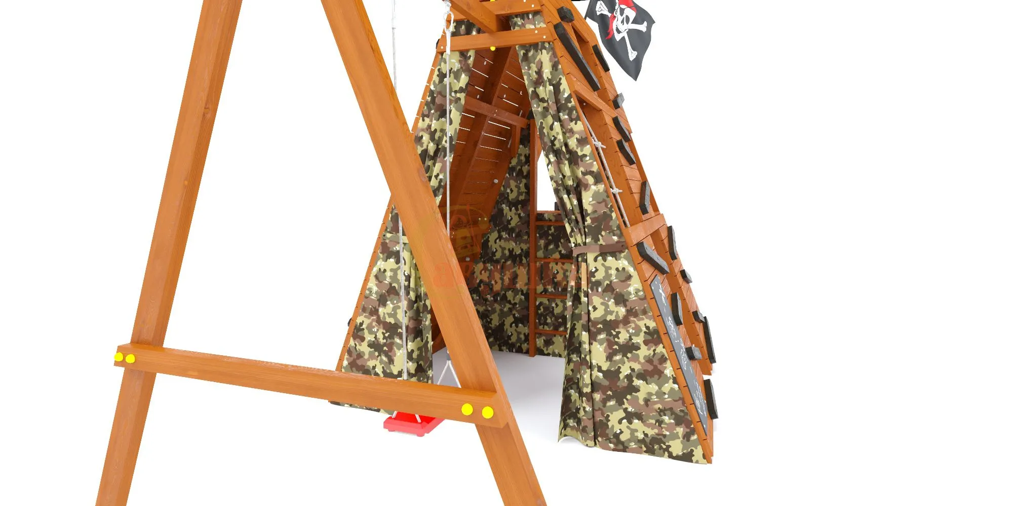 Внутренняя игровая Площадь составляет 3,6 кв. м. Распашной Комплект занавесов с подхватами в цвете «милитари» из водонепроницаемой ткани добавляют особый колорит и защищают от непогоды.