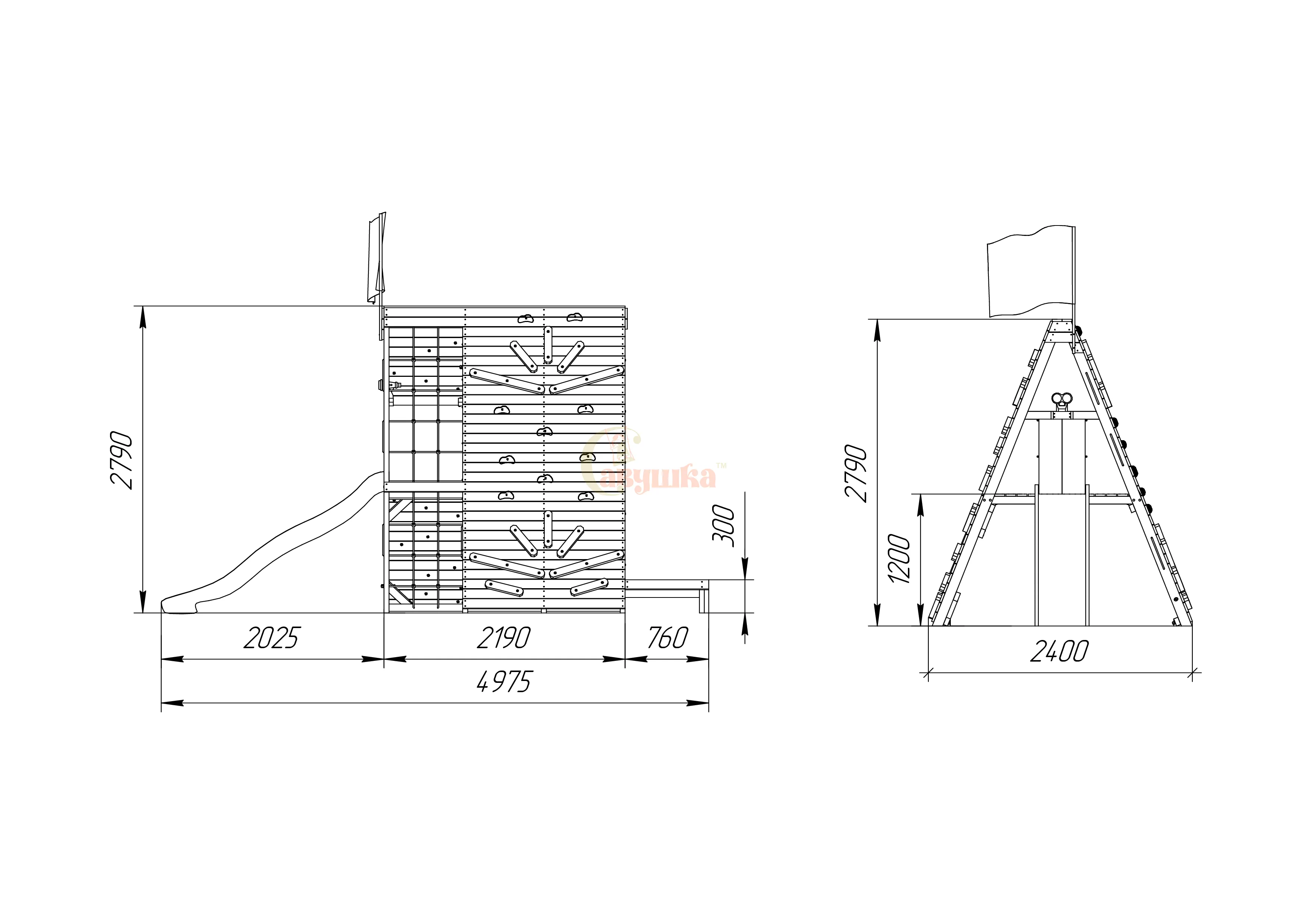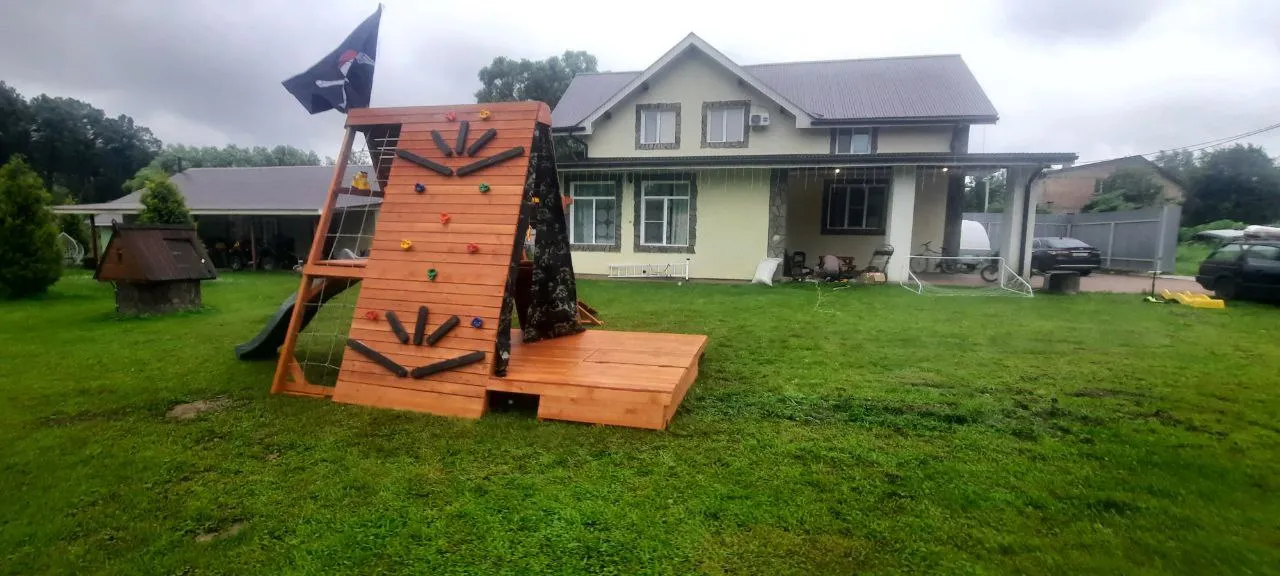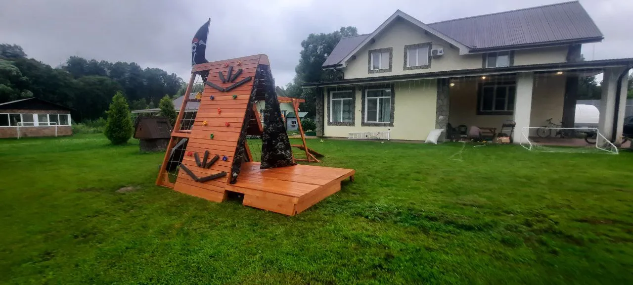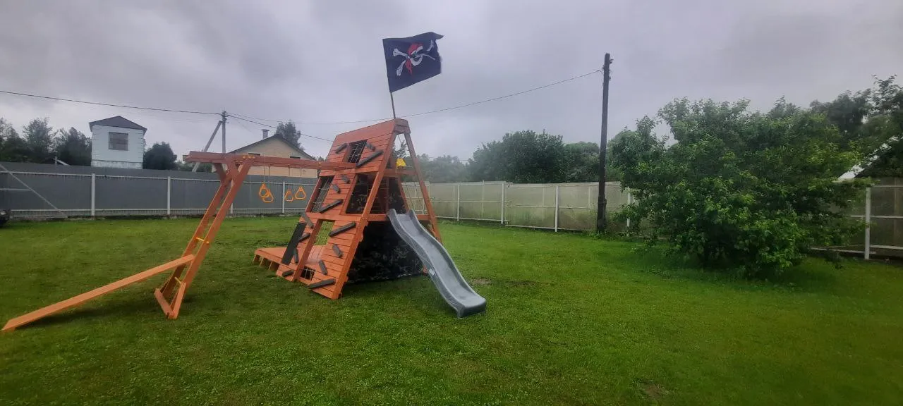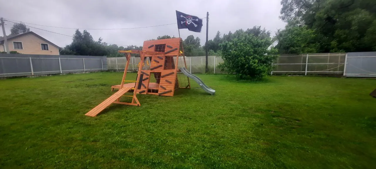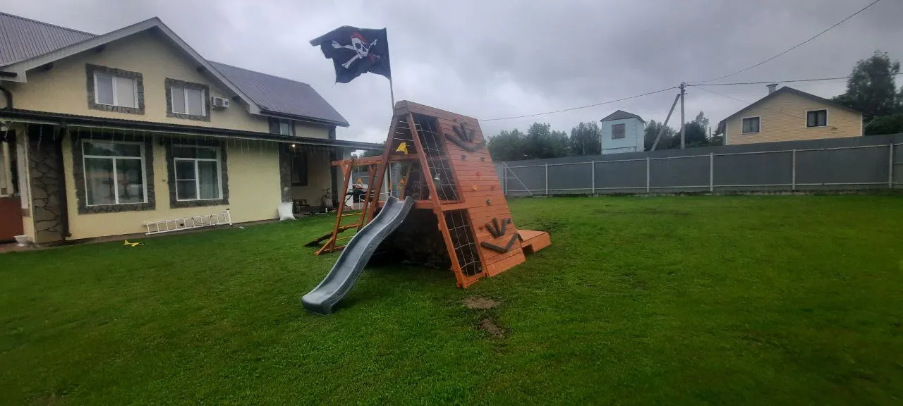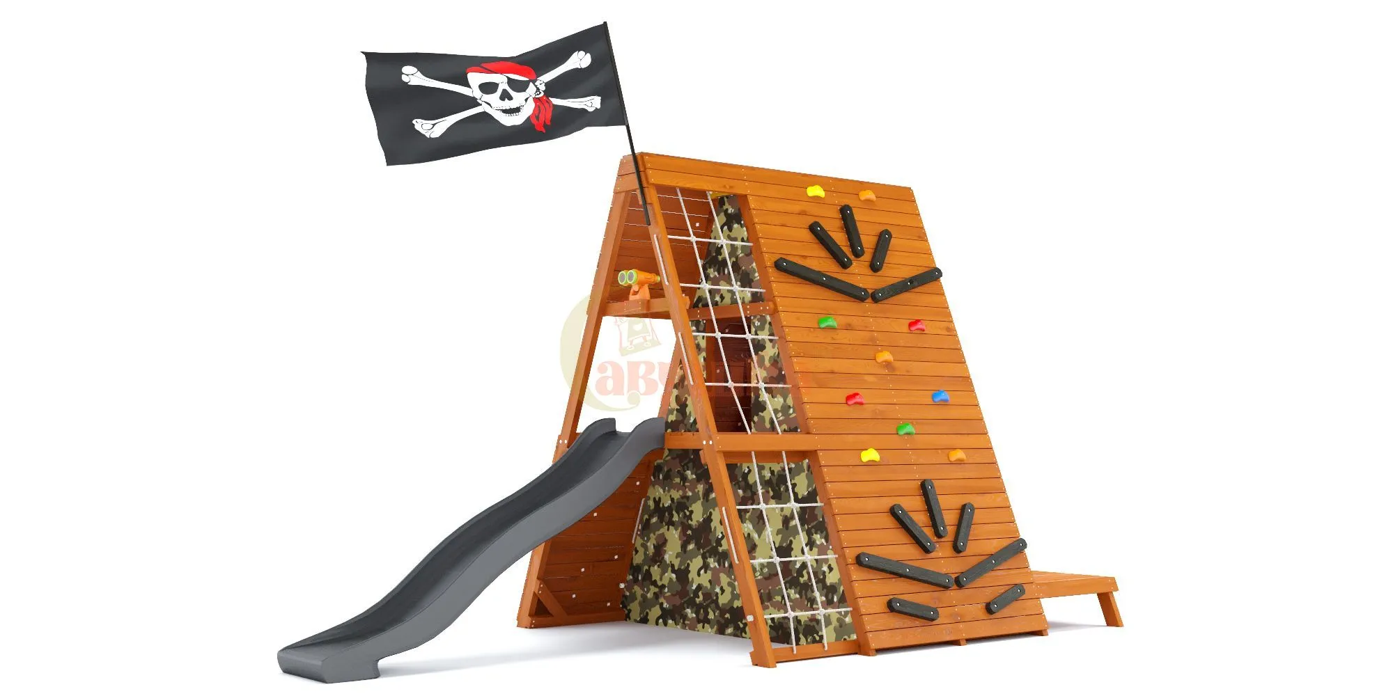 Для большей разнообразности игр на домике установлены меловая доска размером 810 х390 мм, бинокль, горка длиной 2,2 м, платформа для спуска с горки высотой 1,2 м, внутренний лаз с лестницей с выходом на платформу и большой пиратский флаг с флагштоком.