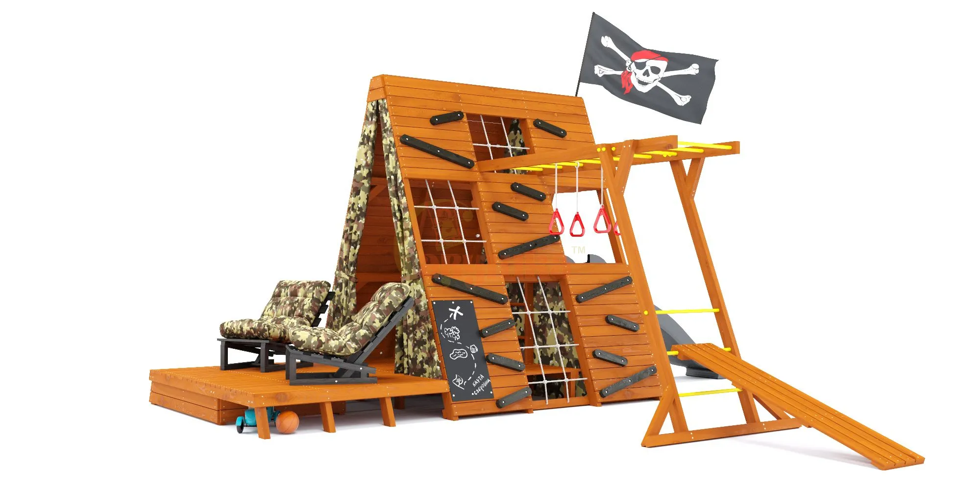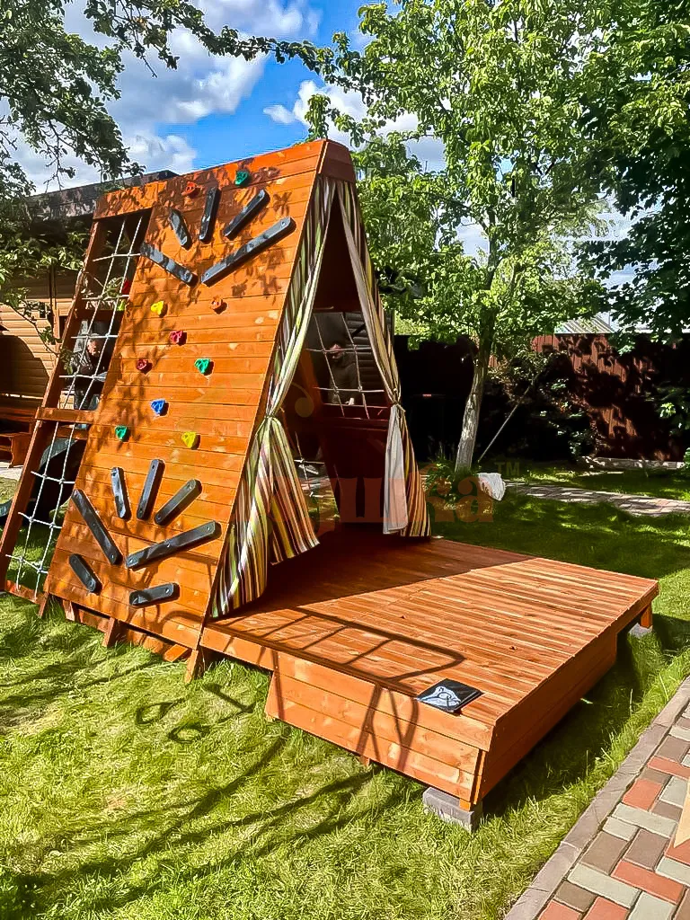 Этот домик представляет собой идеальное сочетание игрового пространства и спортивных элементов. Снаружи домика расположен большой деревянный подиум-сцена и встроенная в него песочница, а также зона хранения игрушек. Внутренний деревянный пол позволяет играть в укрытие или поставать два удобных кресла.