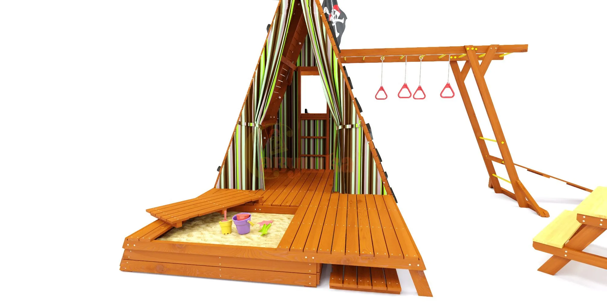Наружный тематический подиум-сцена позволяет детям создавать различные представления и выступления, а встроенная в подиум-сцену песочница с двумя снимающимися створками придаст еще больше возможностей.