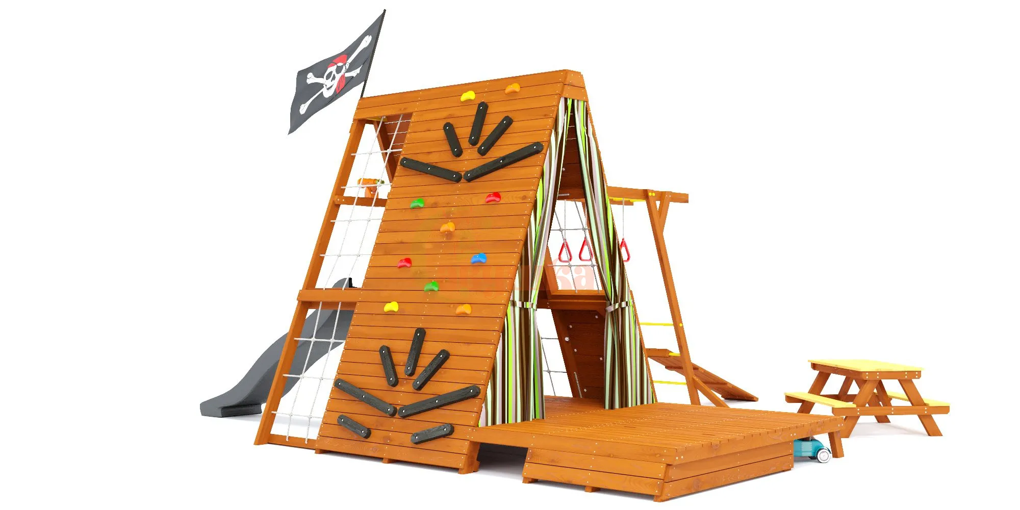 Зона хранения игрушек/ящиков с игрушками под подиумом-сценой сохранит порядок на игровой площадке, а рукоход с кольцами и классическими перекладинами станет настоящим испытанием для старших детей.