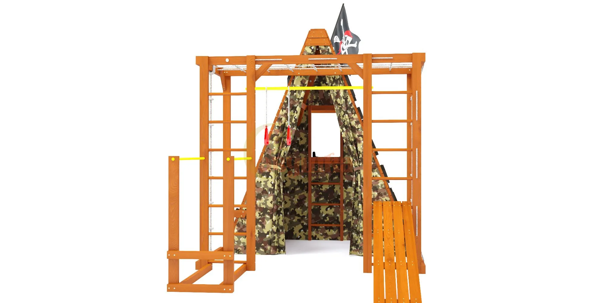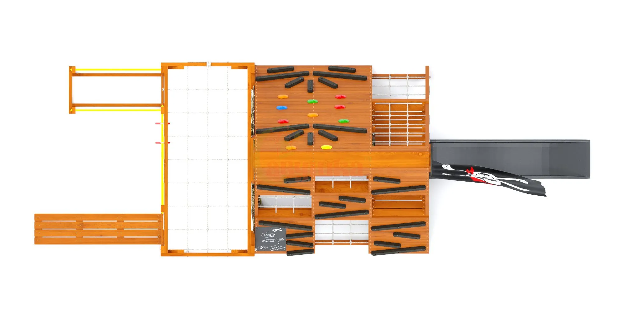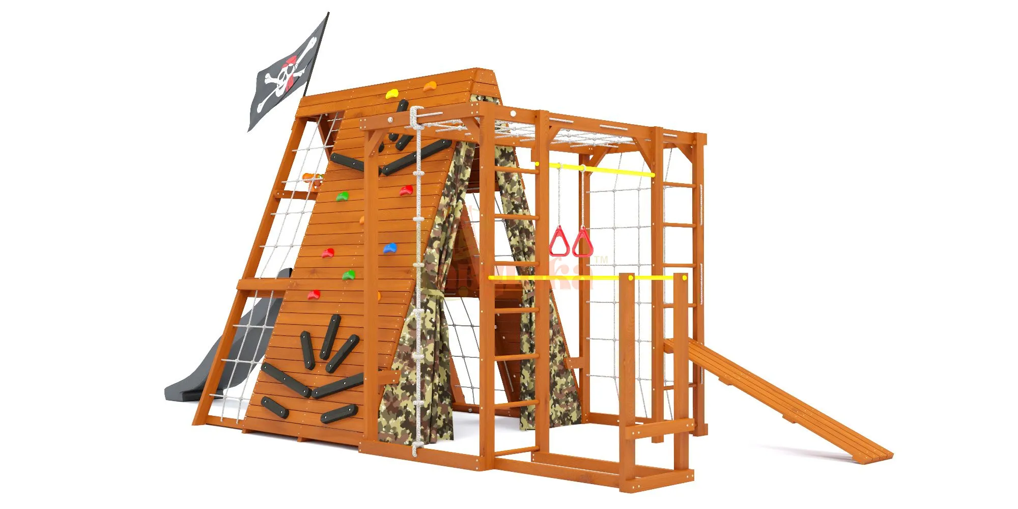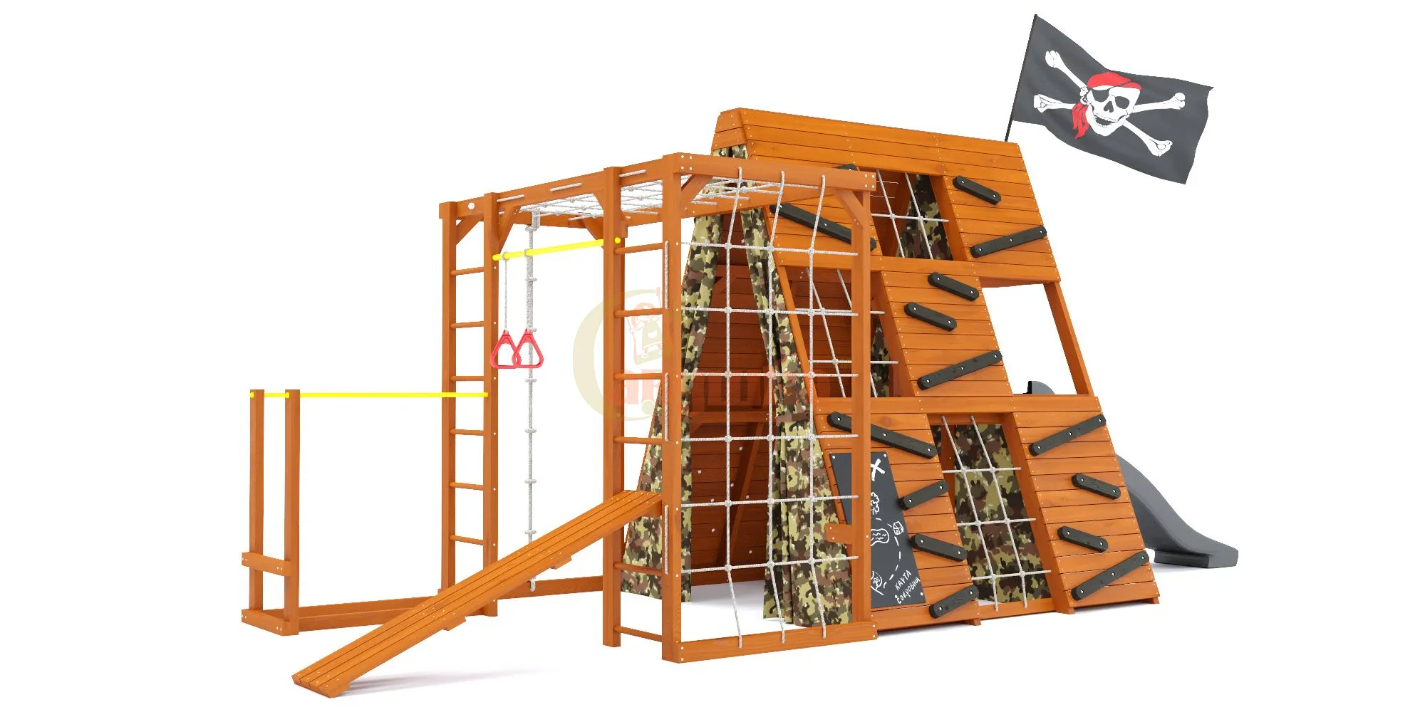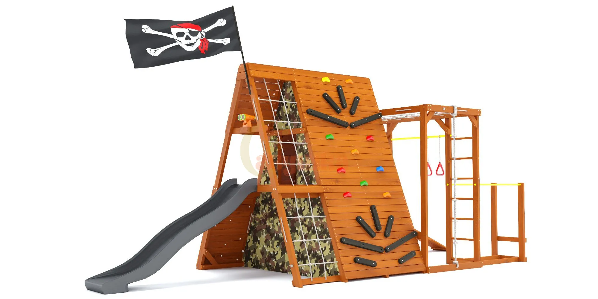 Внутренний лаз с выходом на платформу и внутренняя лестница позволят вашим детям чувствовать себя настоящими скалолазами. А большой пиратский флаг создаст атмосферу приключений.