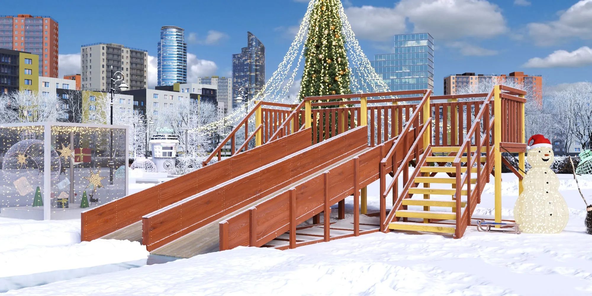 Зимняя горка Савушка Зима 4/1 в цвете Махагон/Сосна — это два длинных ската по 6 метров, на которых дети смогут кататься без остановки. Конструкция выполнена из прочного клееного бруса и соответствует ГОСТ, а также имеет Декларацию ТР ЕАЭС 038/2016, что позволяет устанавливать её не только в частных дворах, но и в общественных местах.