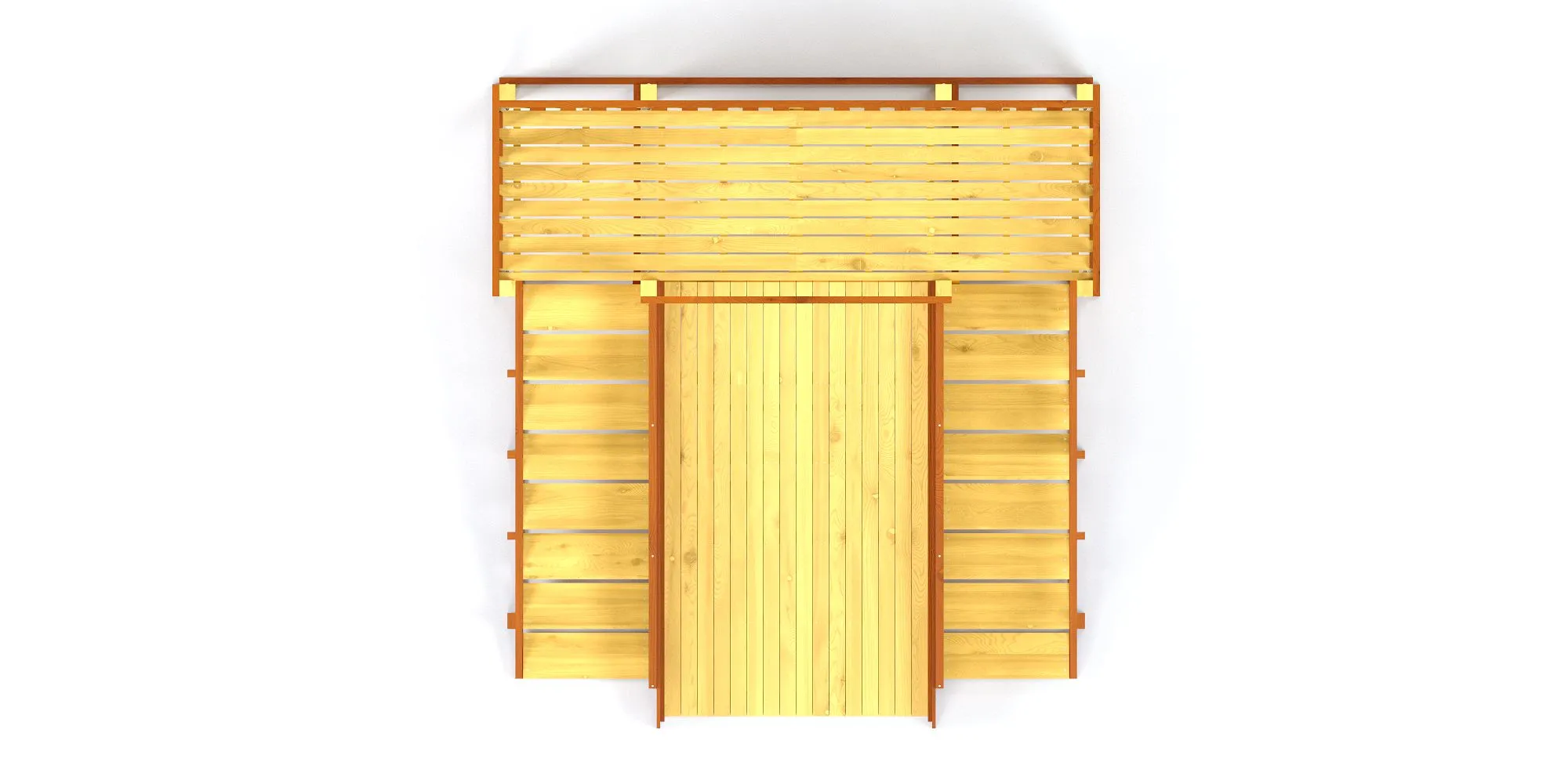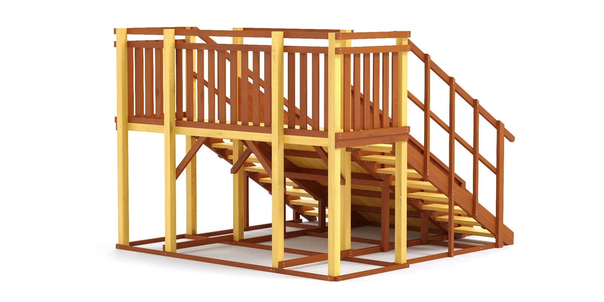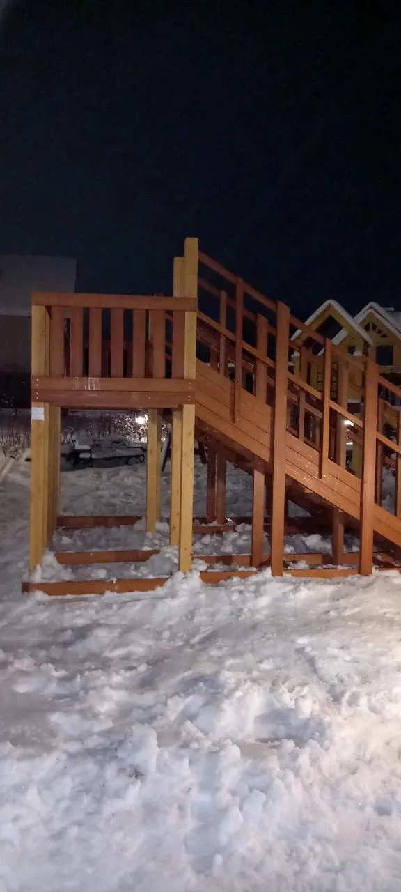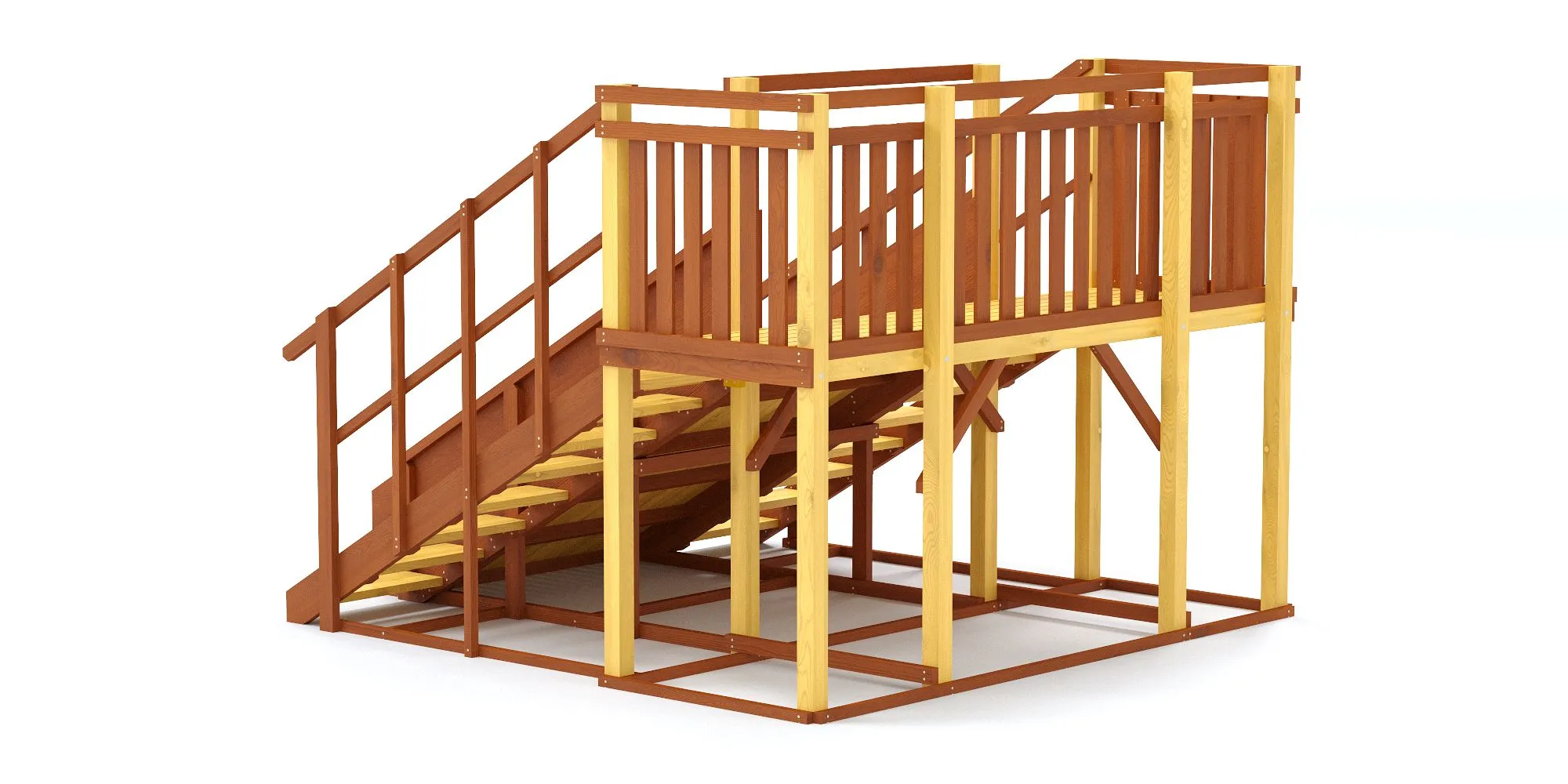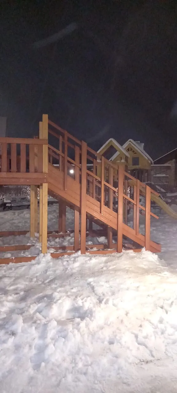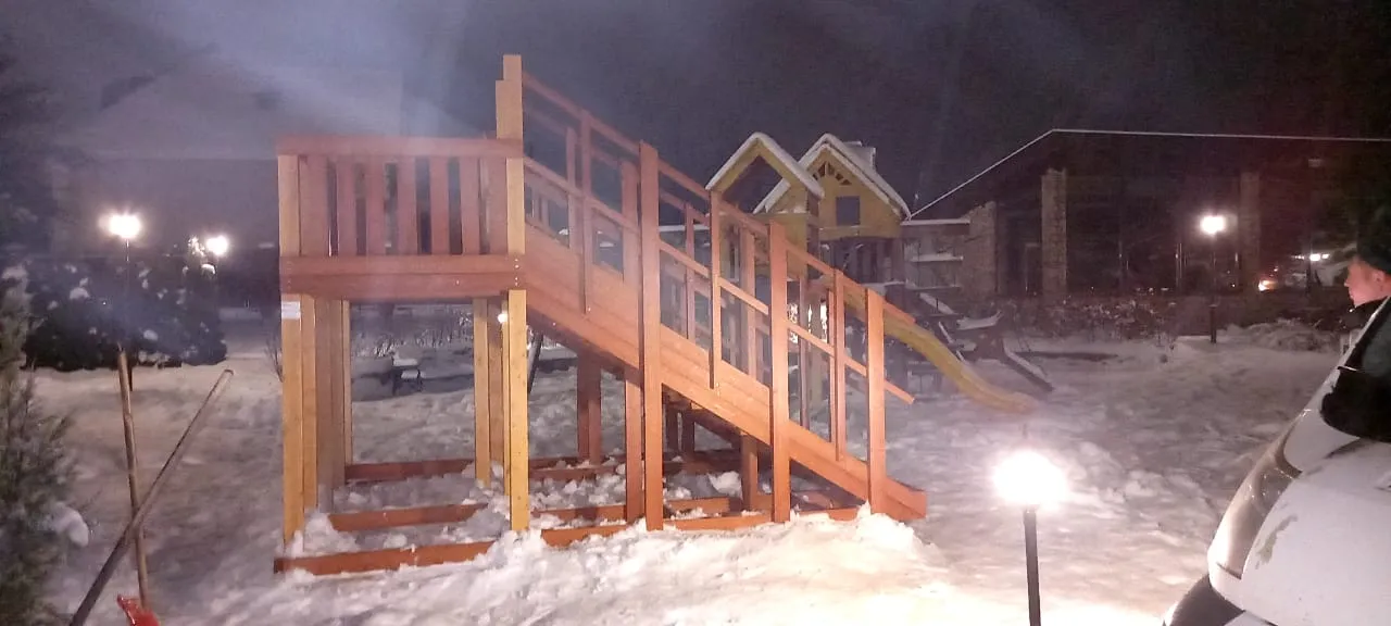 Каркас выполнен из прочного клеёного бруса, который выдерживает морозы и влагу. Дерево покрыто экологичным сертифицированным составом на водной основе, полностью безопасным для детей.