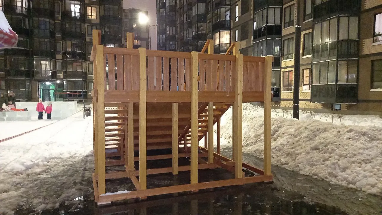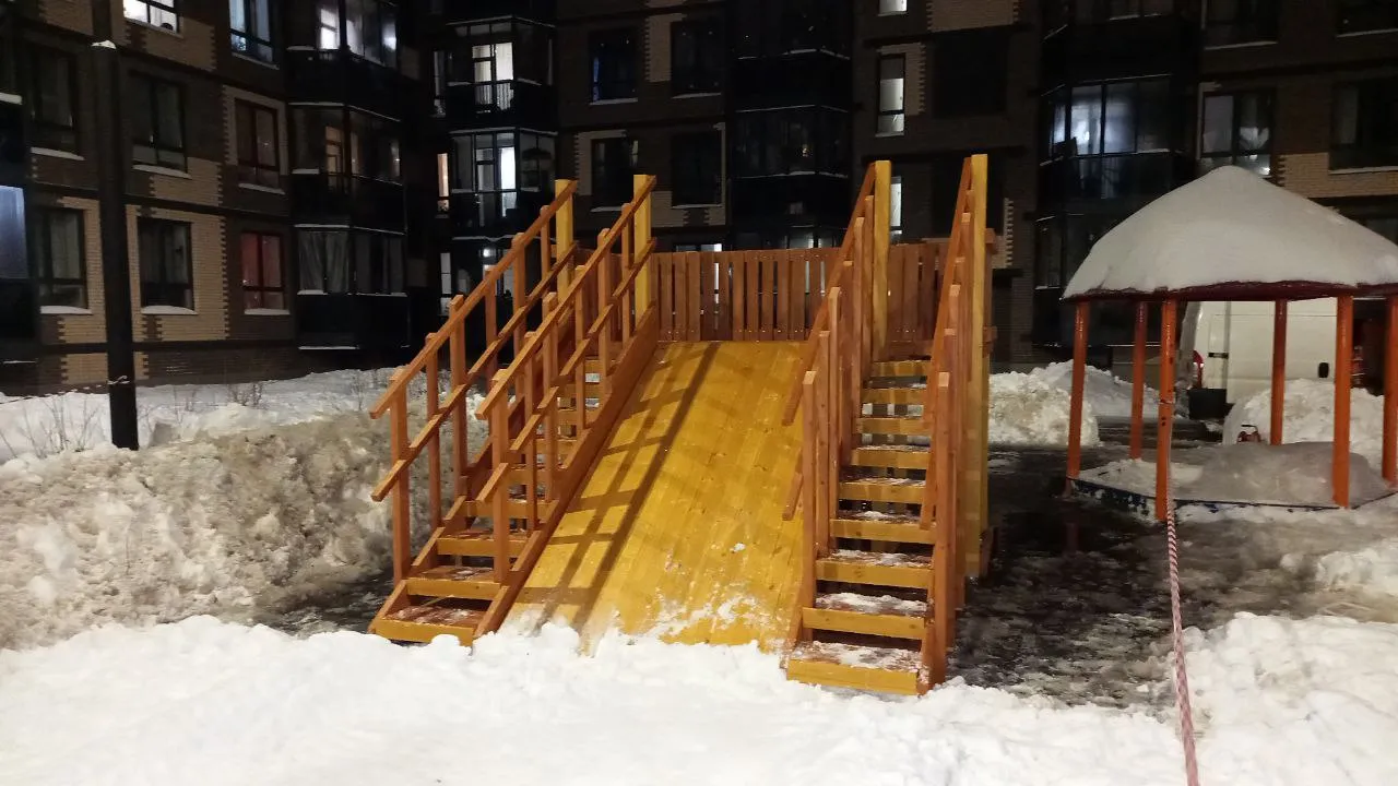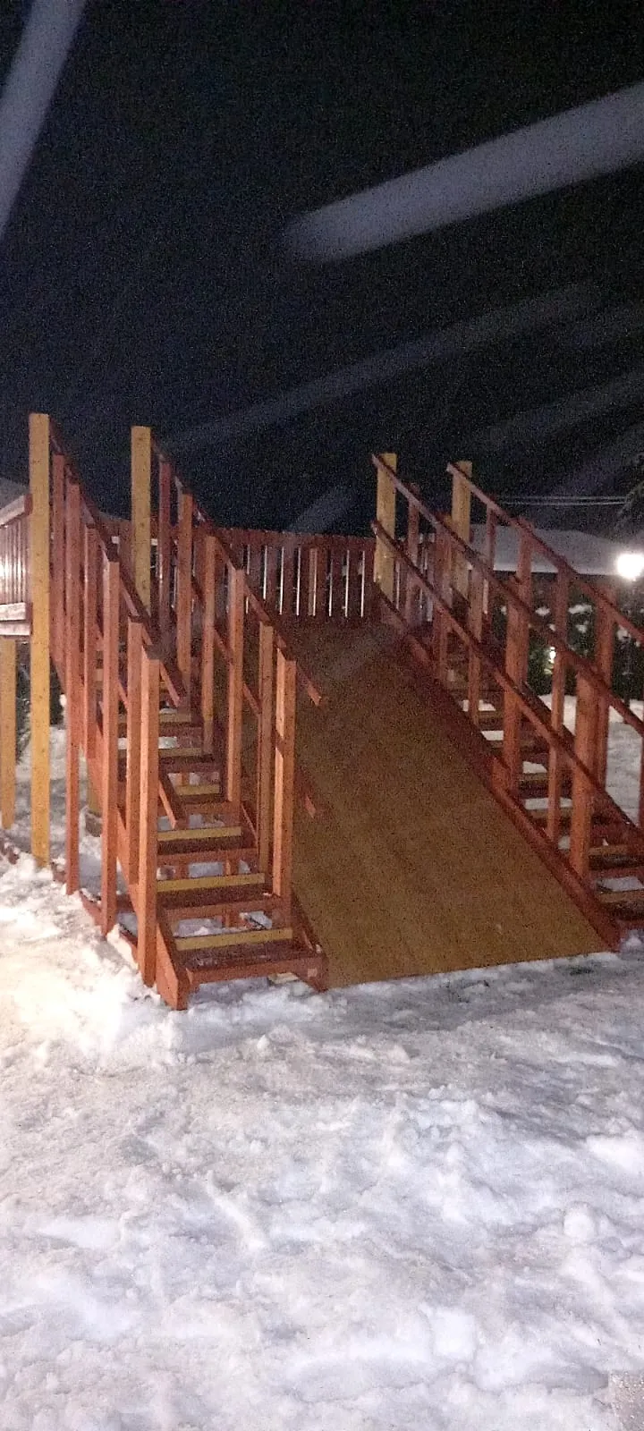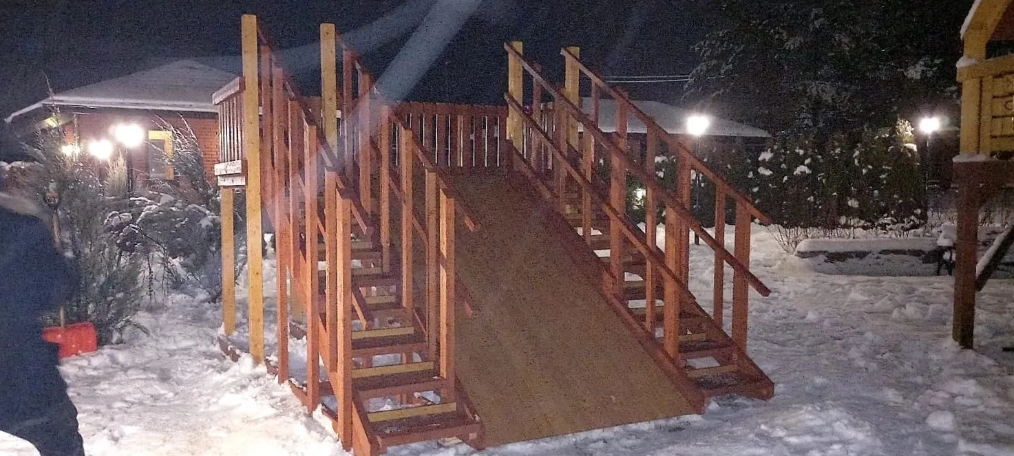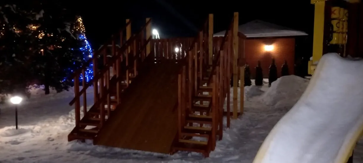 Благодаря ширине горки, на ней можно кататься на ватрушках и ледянках. Удобная лестница и высокие перила обеспечивают безопасный подъём даже для маленьких детей.