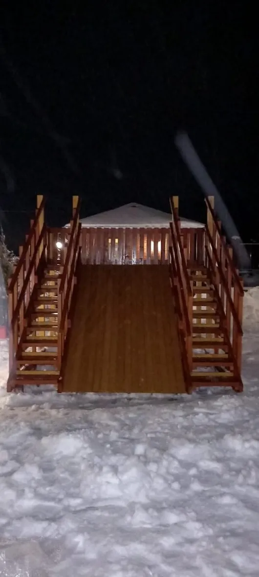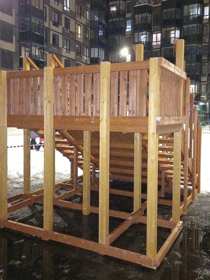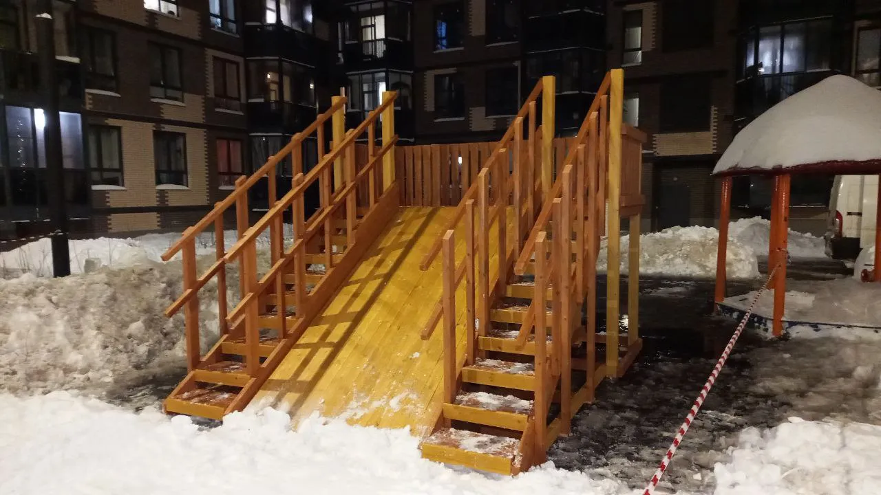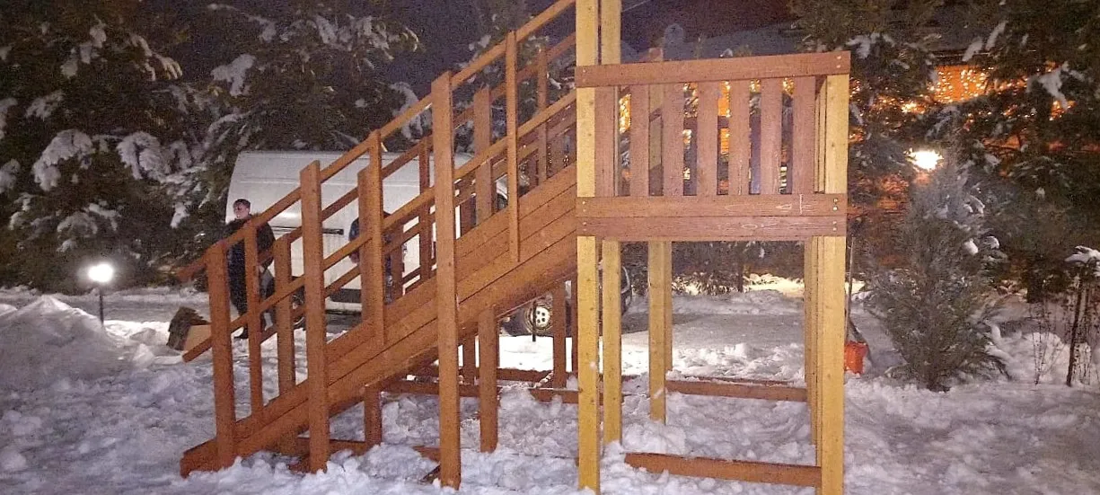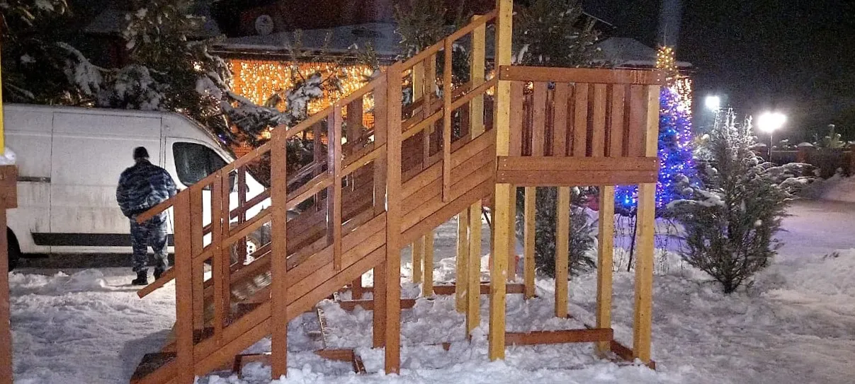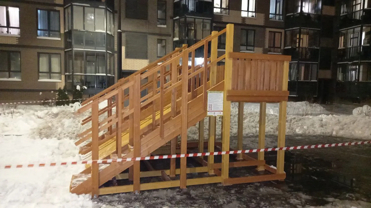 Благодаря ширине горки, на ней можно кататься на ватрушках и ледянках. Удобная лестница и высокие перила обеспечивают безопасный подъём даже для маленьких детей.