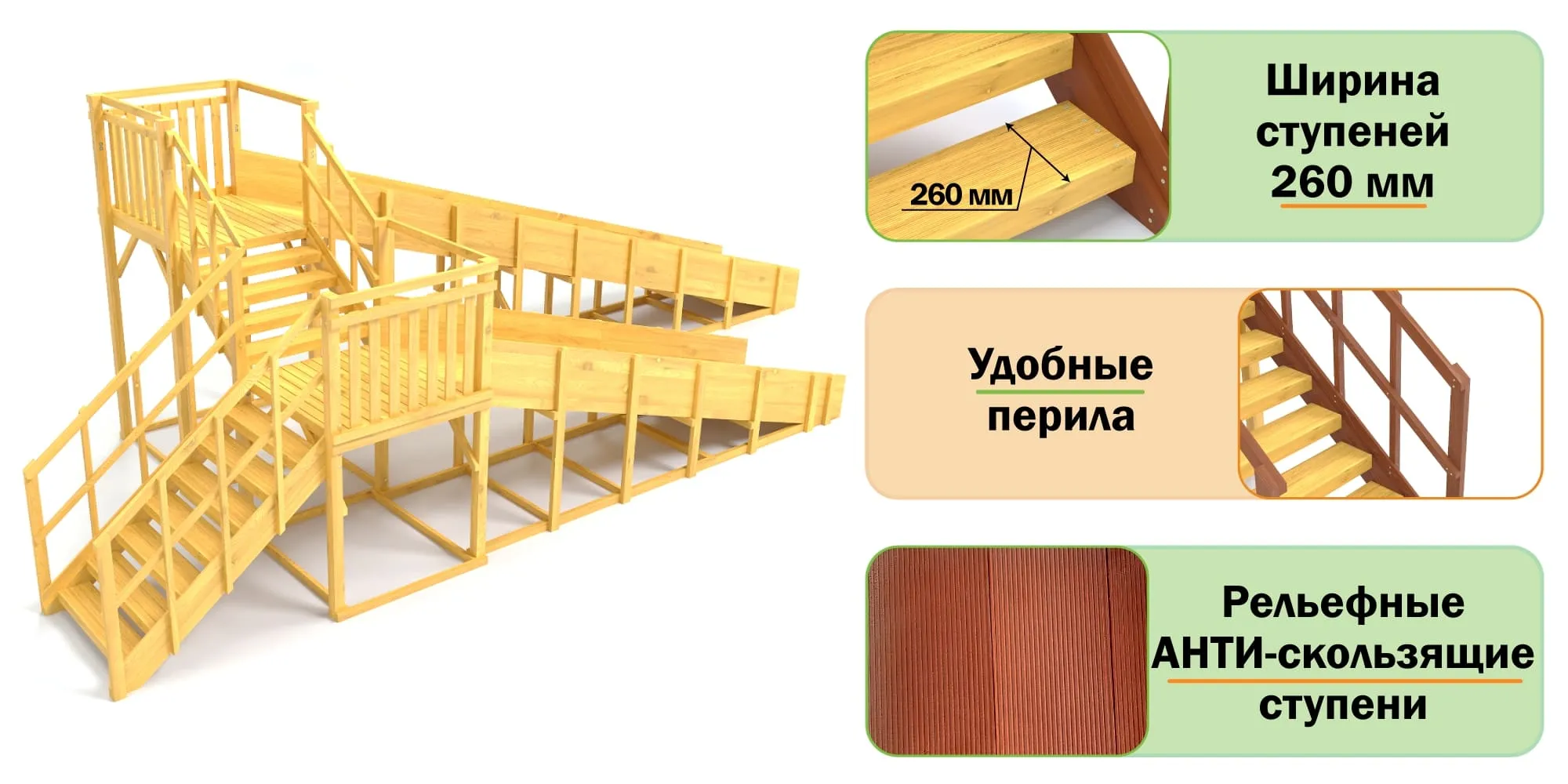 Представьте себе: зимний день, свежий снег, смех и звонкий визг восторга. Именно такие моменты дарит Савушка Зима Wood 7. Два ската разной длины — 7,68 м и 5 м — позволяют кататься детям разного возраста, а широкая лестница делает подъём удобным и безопасным.