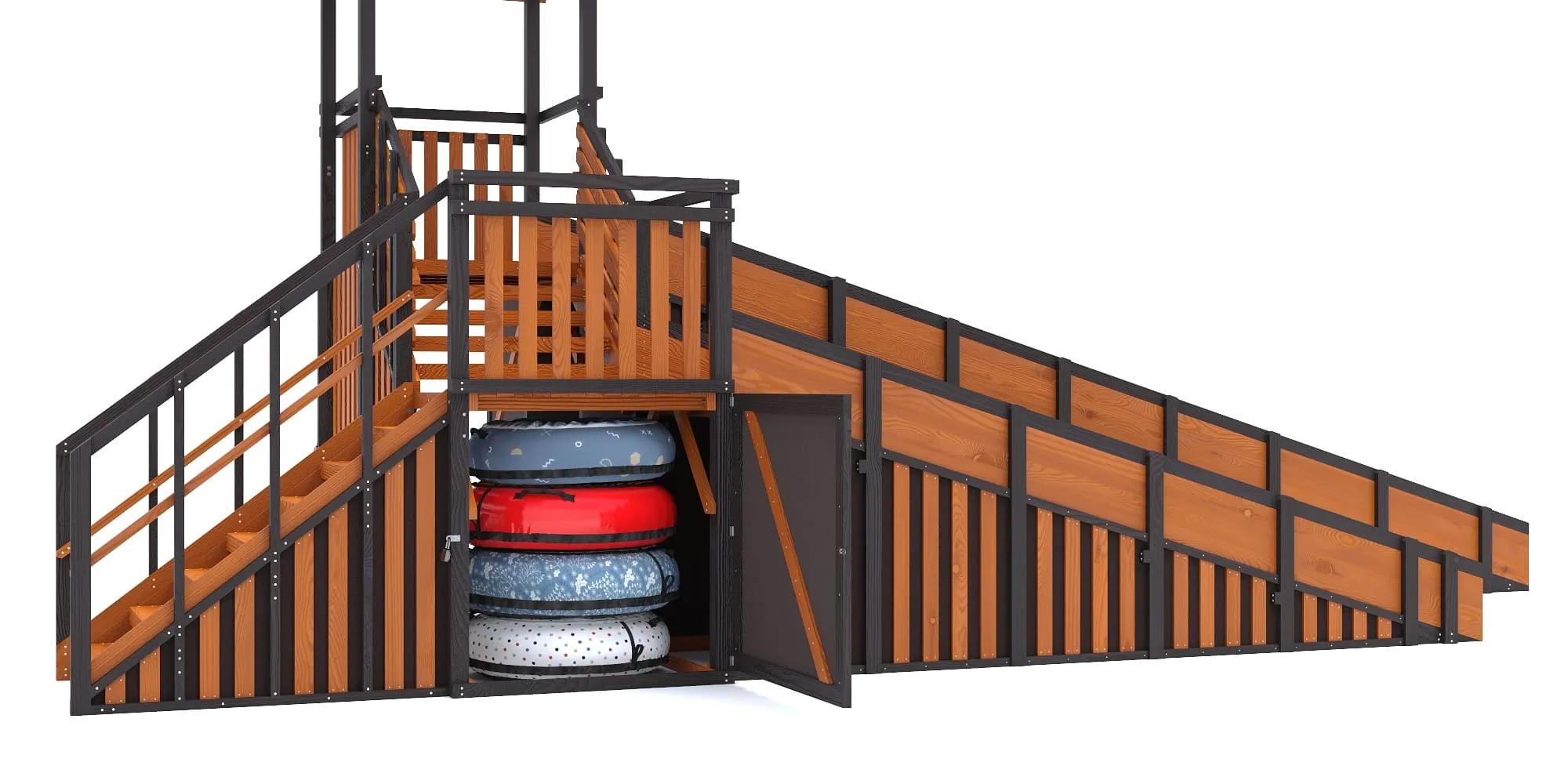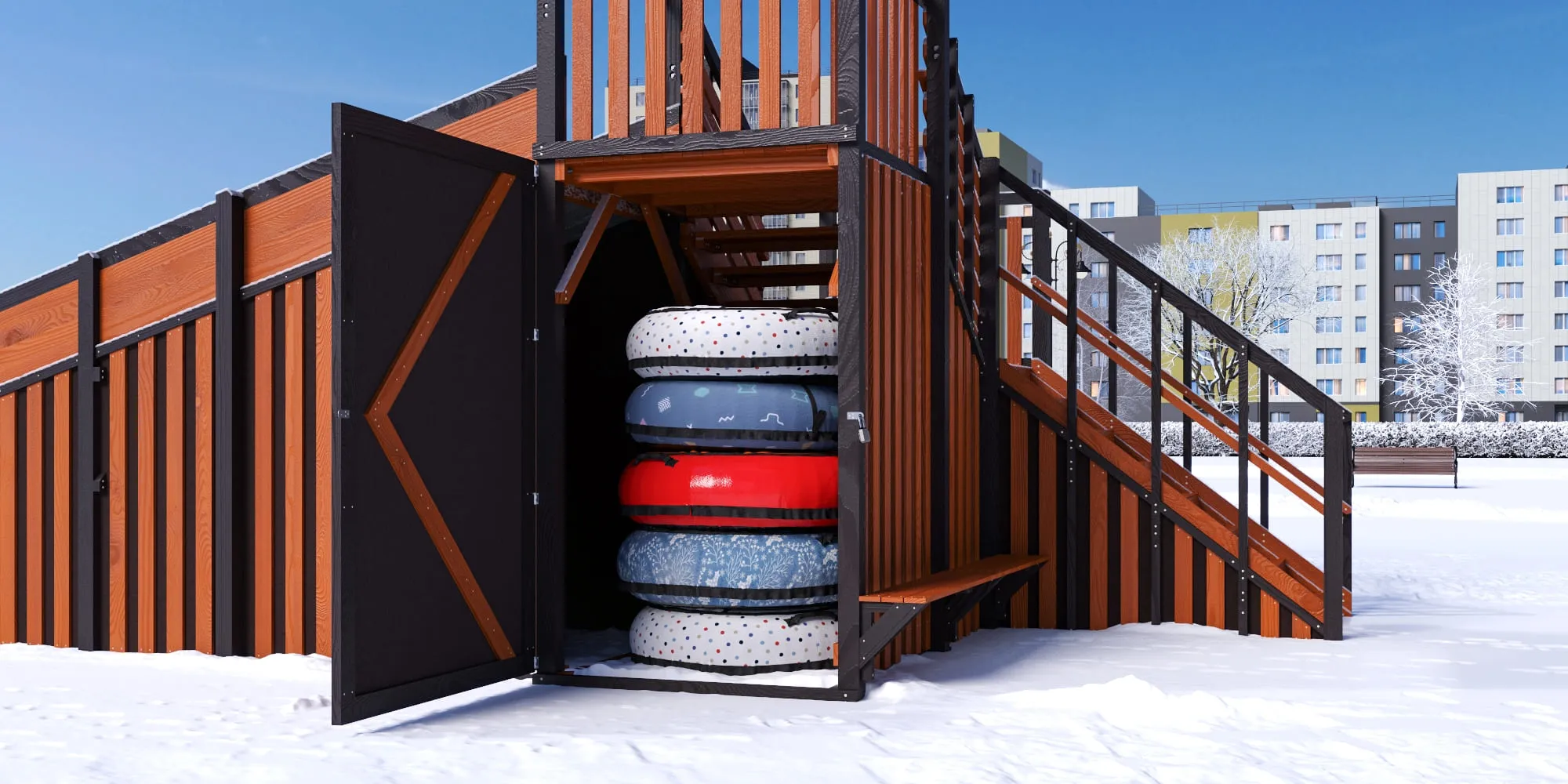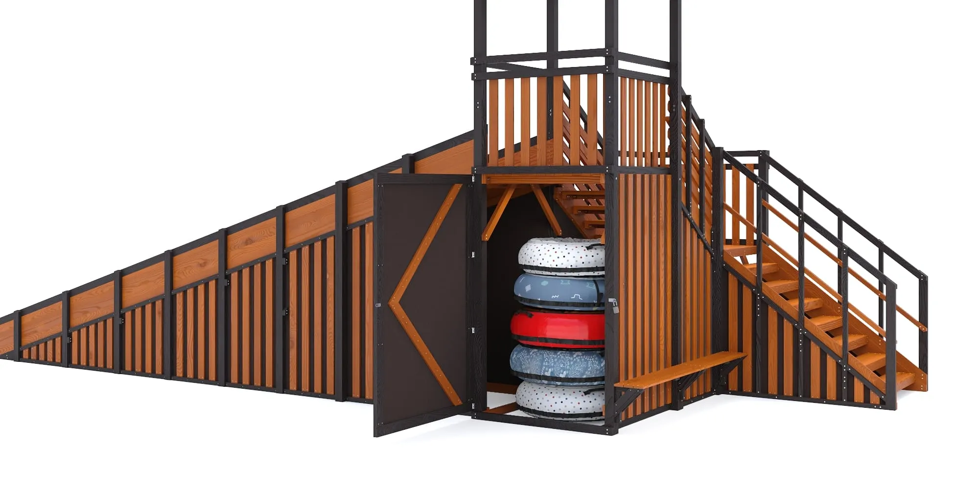 Закрытые фасады и встроенное хранилище тюбингов формируют премиальный внешний вид, защищают конструкцию от снега и позволяют хранить инвентарь сухим и аккуратным под замком. В старших моделях с закрытыми фасадами мы добавили удобную лавочку для отдыха.