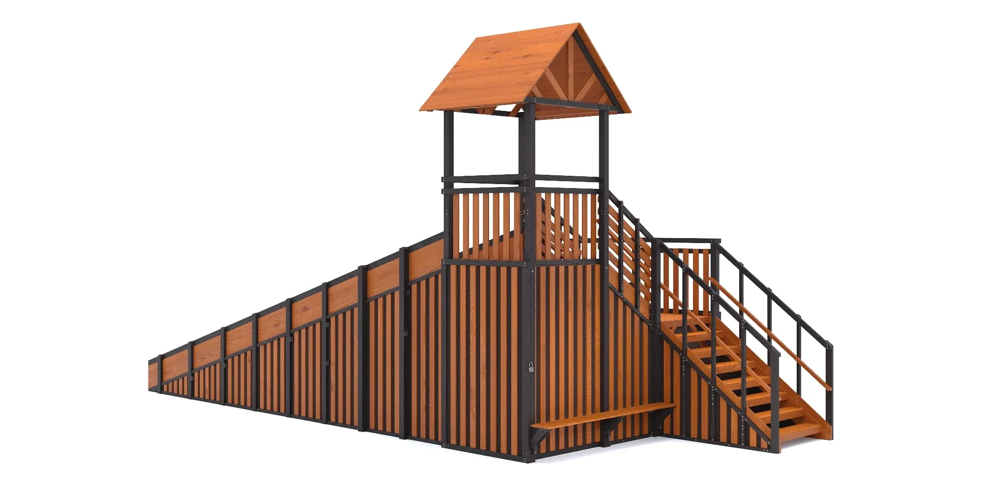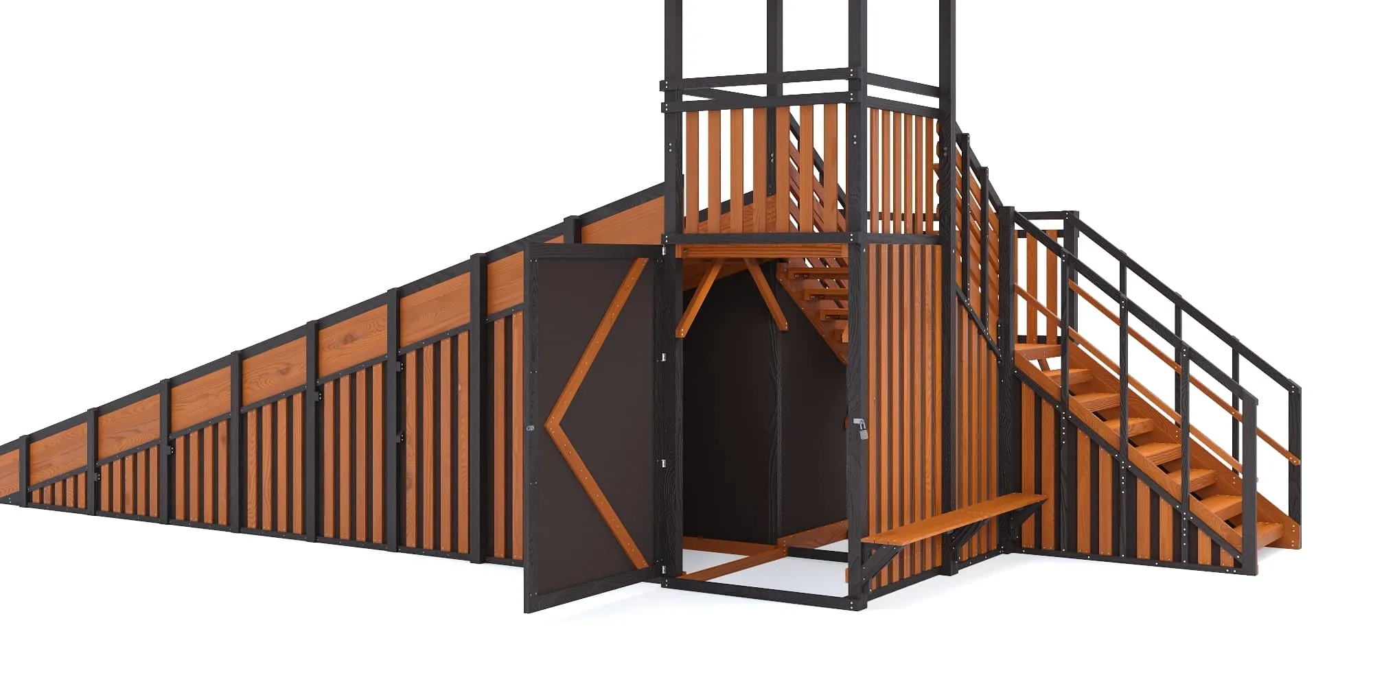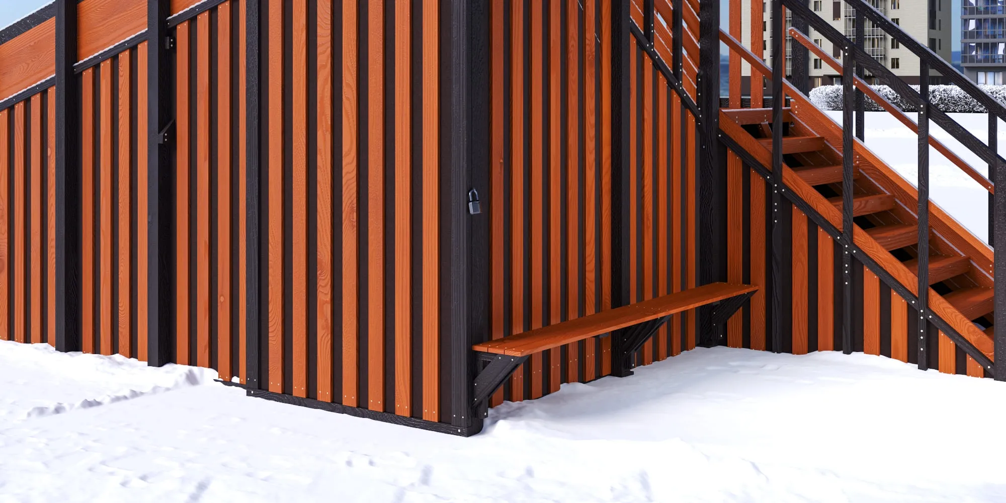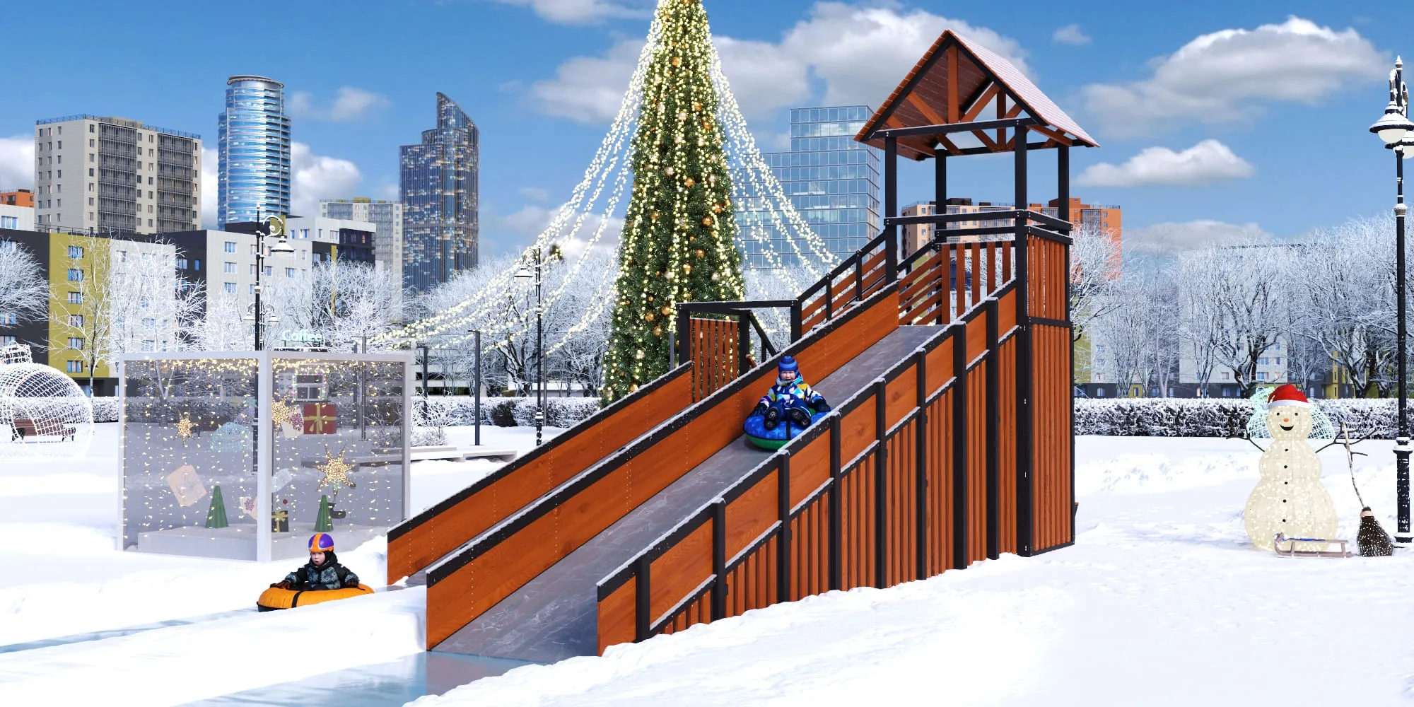 Закрытые фасады и встроенное хранилище тюбингов формируют премиальный внешний вид, защищают конструкцию от снега и позволяют хранить инвентарь сухим и аккуратным под замком. В старших моделях с закрытыми фасадами мы добавили удобную лавочку для отдыха.