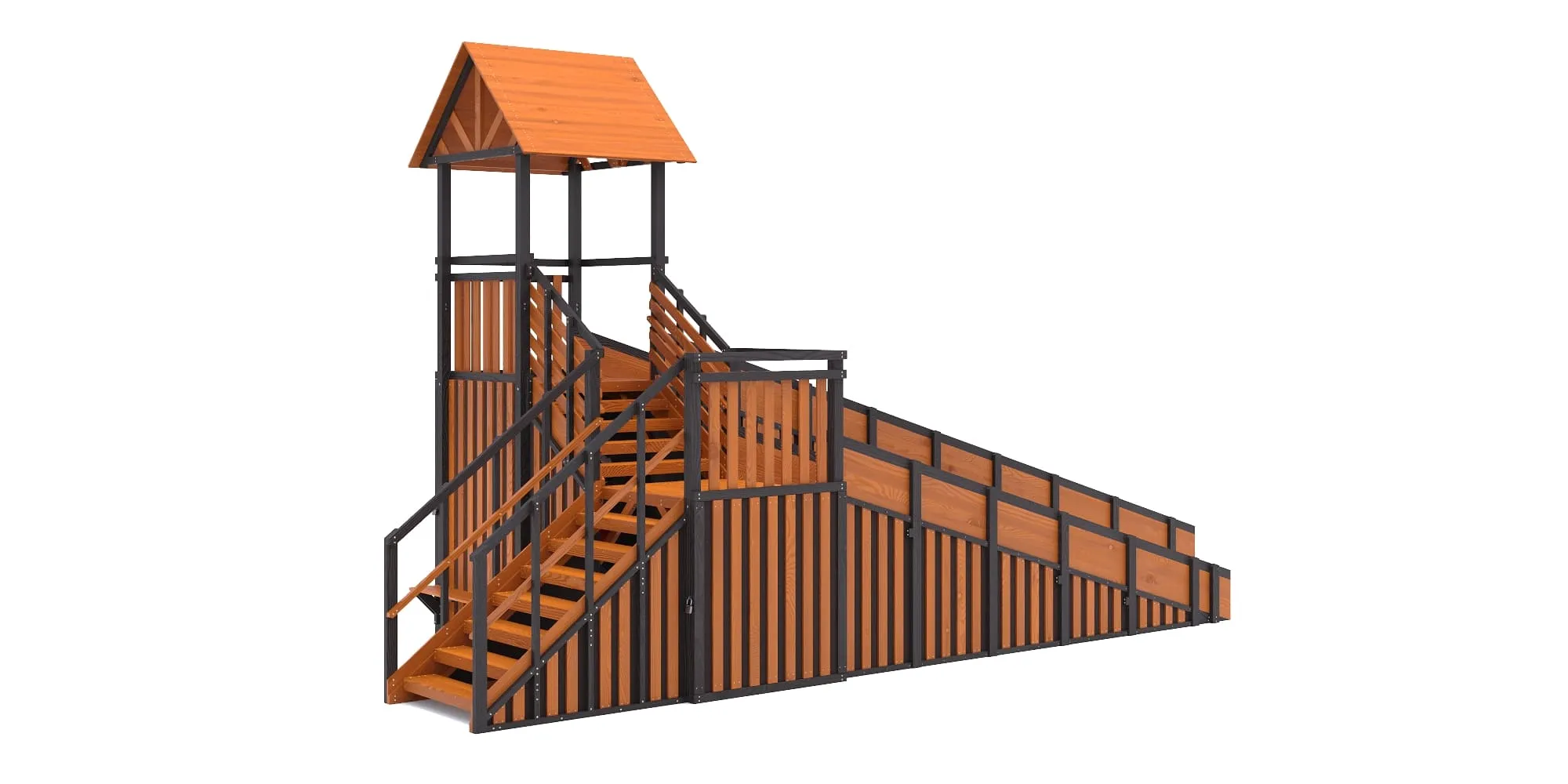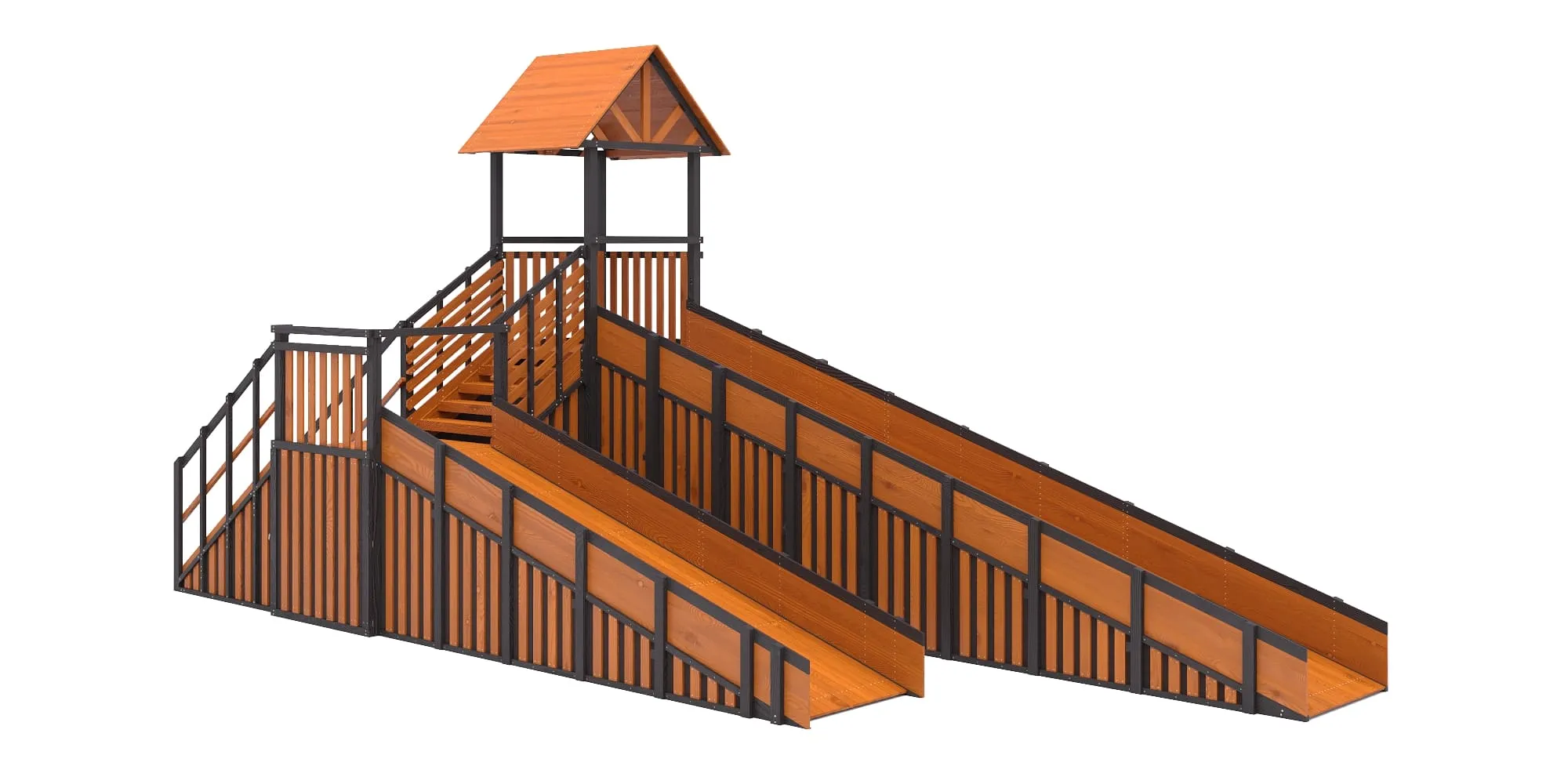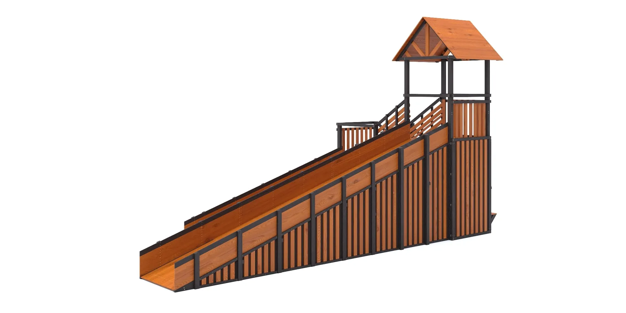 Горка изготовлена из карельской хвойной сосны — плотной северной древесины, экологичной и устойчивой к морозам. Все элементы проходят камерную сушку и обработку покрытием Sherwin-Williams, разрешённым для детских площадок.