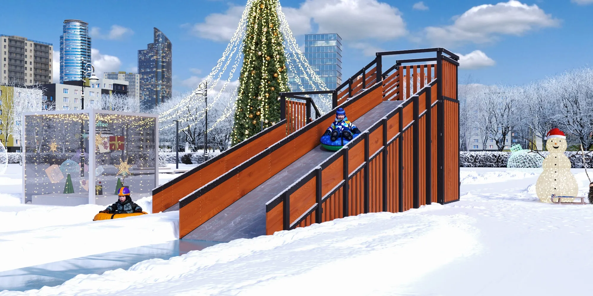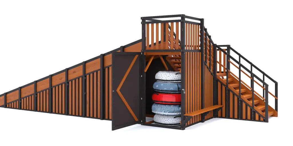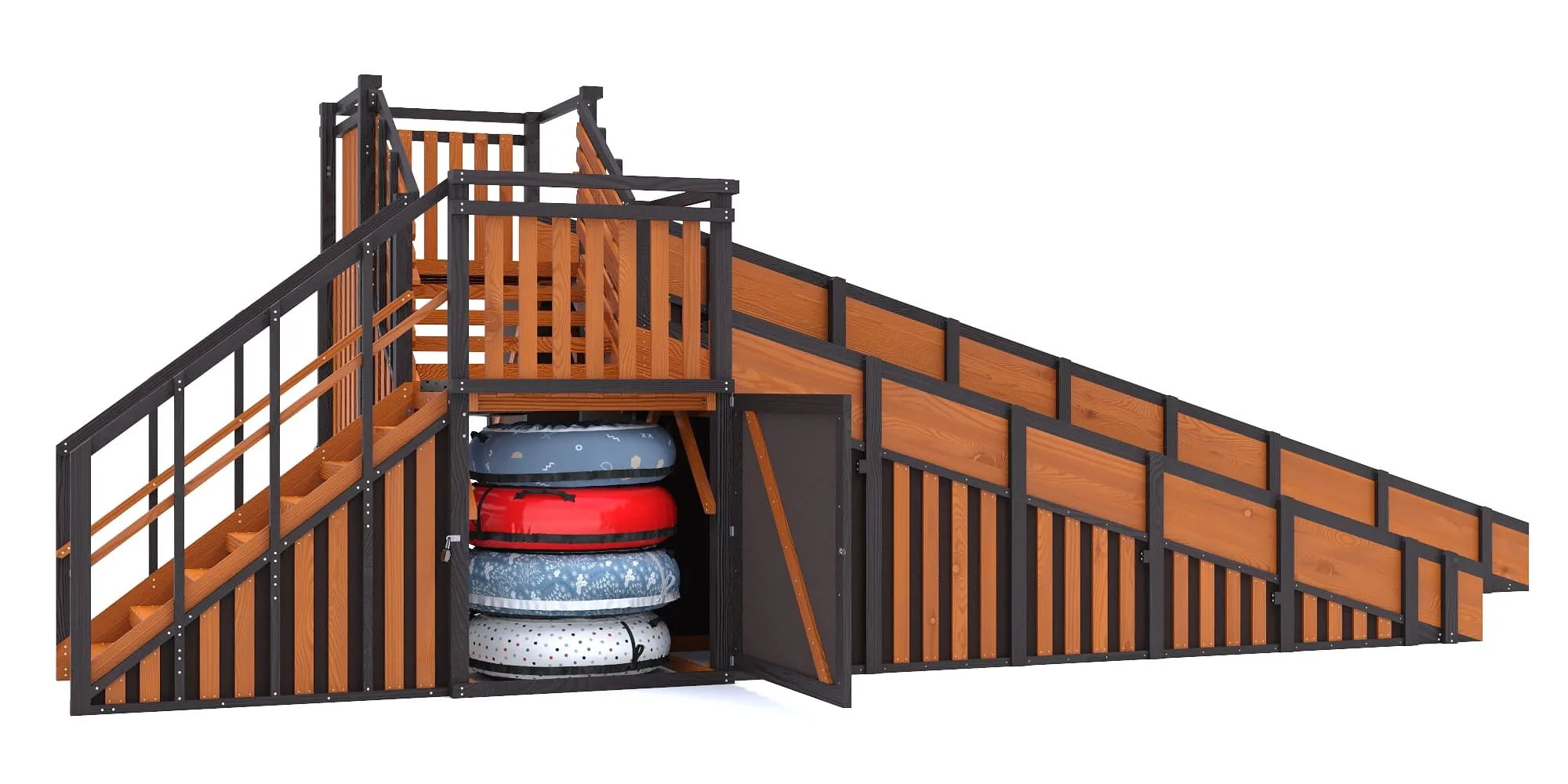 Закрытые фасады и встроенное хранилище тюбингов формируют премиальный внешний вид, защищают конструкцию от снега и позволяют хранить инвентарь сухим и аккуратным под замком. В старших моделях с закрытыми фасадами мы добавили удобную лавочку для отдыха.