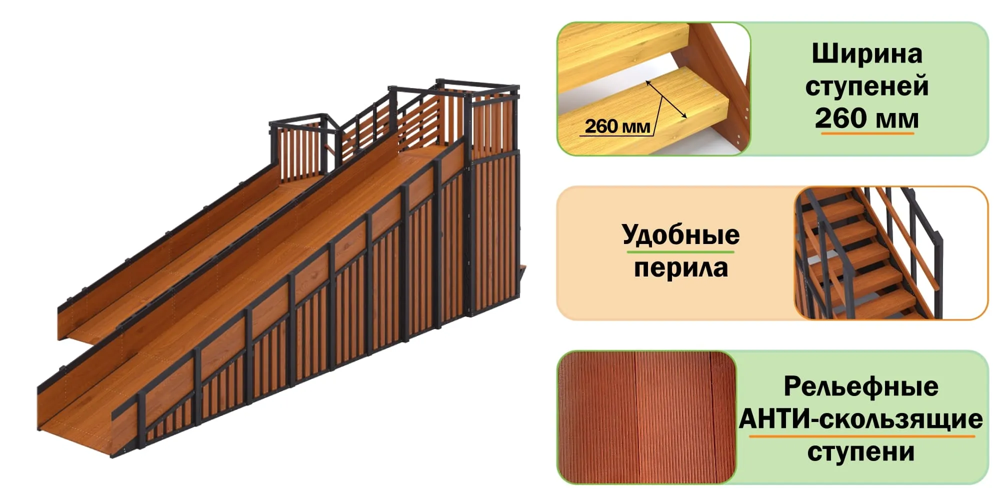 Горка изготовлена из карельской хвойной сосны — плотной северной древесины, экологичной и устойчивой к морозам. Все элементы проходят камерную сушку и обработку покрытием Sherwin-Williams, разрешённым для детских площадок.