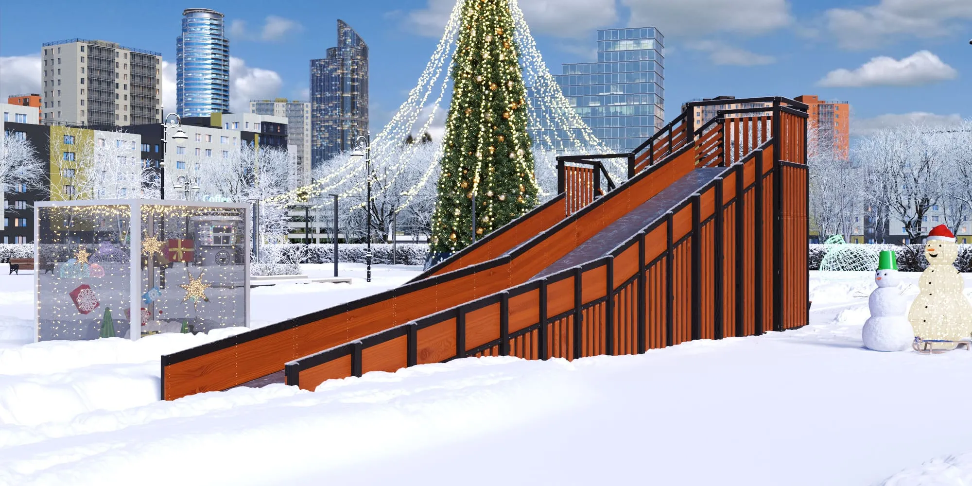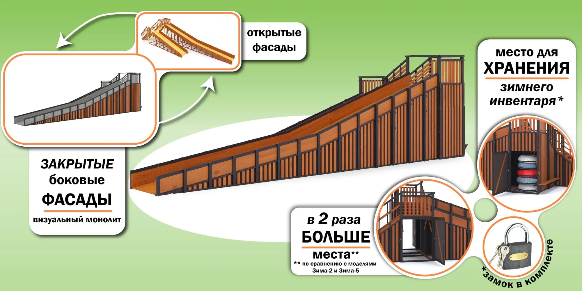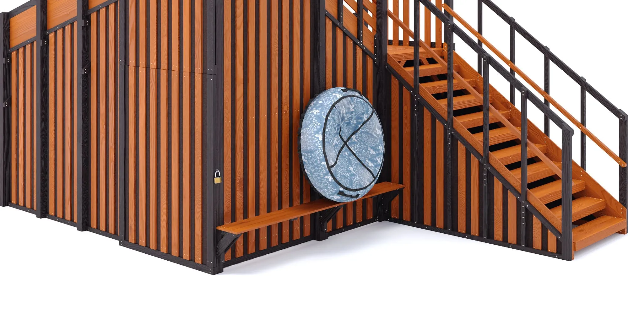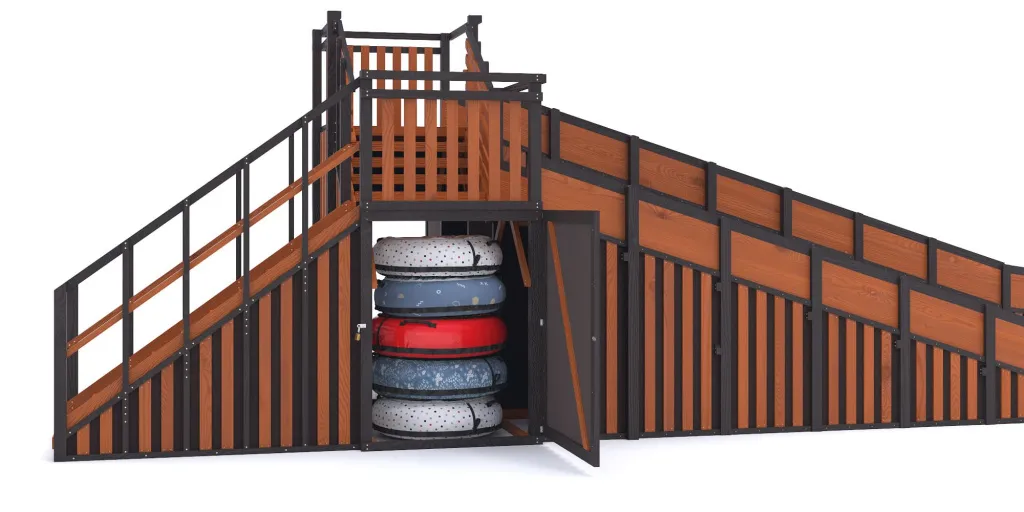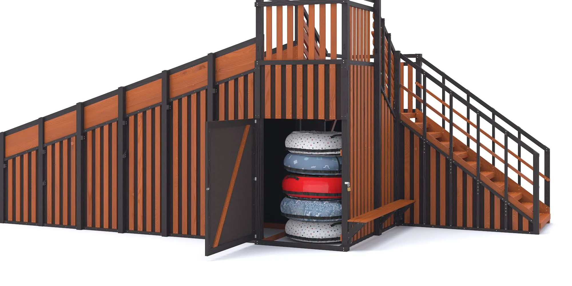 Закрытые фасады и встроенное хранилище тюбингов формируют премиальный внешний вид, защищают конструкцию от снега и позволяют хранить инвентарь сухим и аккуратным под замком. В старших моделях с закрытыми фасадами мы добавили удобную лавочку для отдыха.