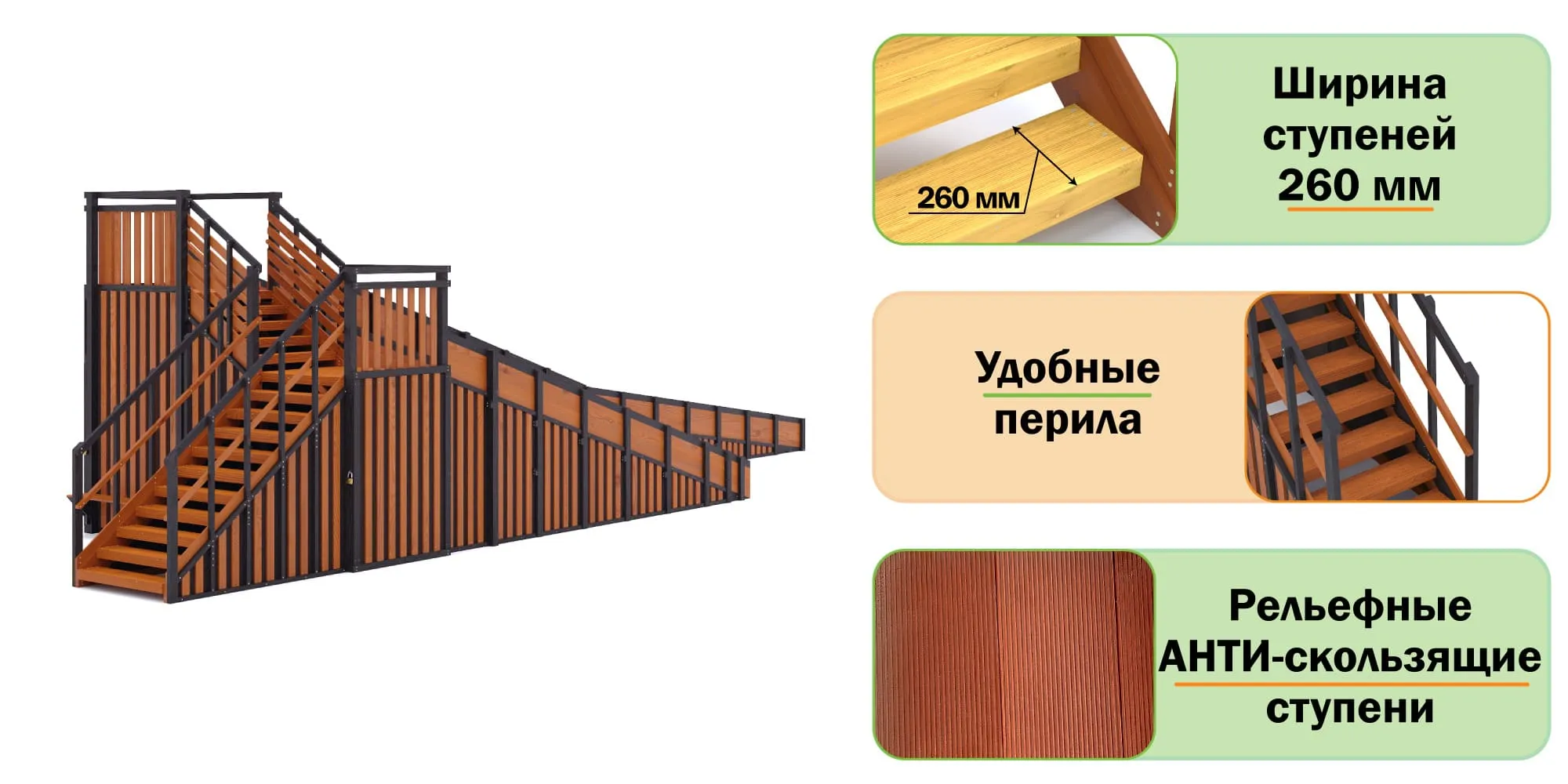 Горка изготовлена из карельской хвойной сосны — плотной северной древесины, экологичной и устойчивой к морозам. Все элементы проходят камерную сушку и обработку покрытием Sherwin-Williams, разрешённым для детских площадок.
