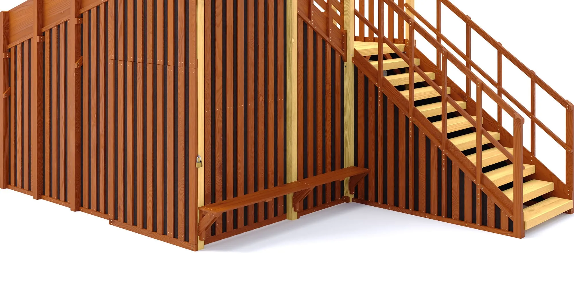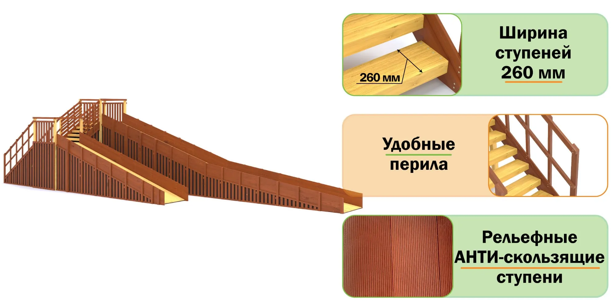 Горка изготовлена из карельской хвойной сосны — плотной северной древесины, экологичной и устойчивой к морозам. Все элементы проходят камерную сушку и обработку покрытием Sherwin-Williams, разрешённым для детских площадок.