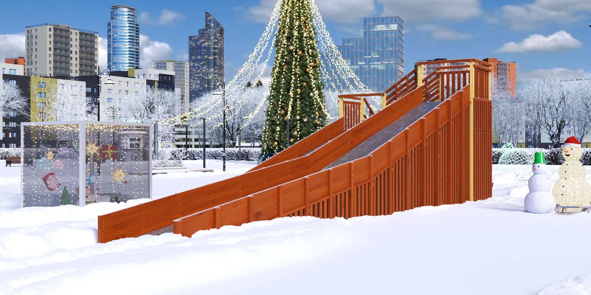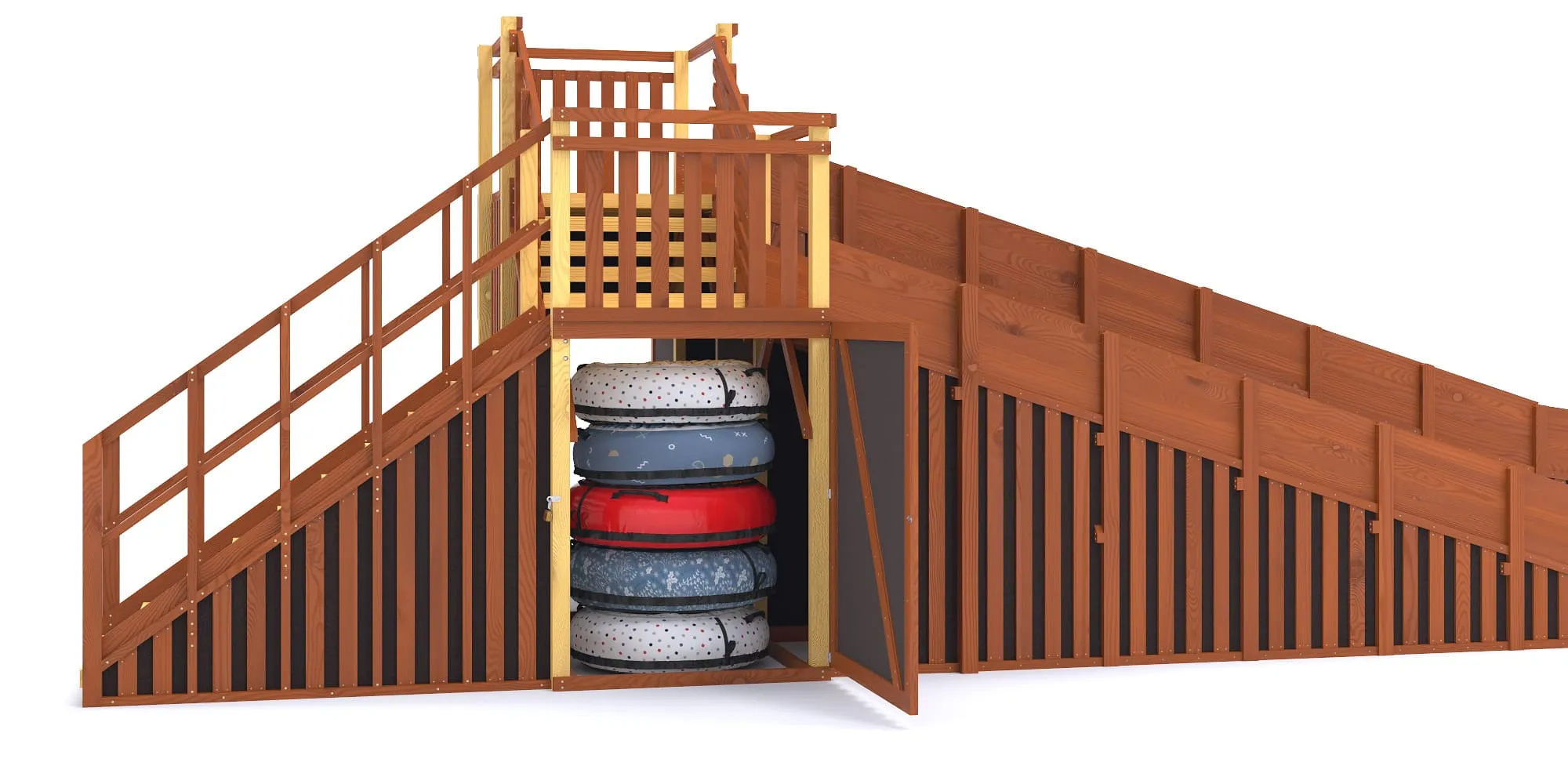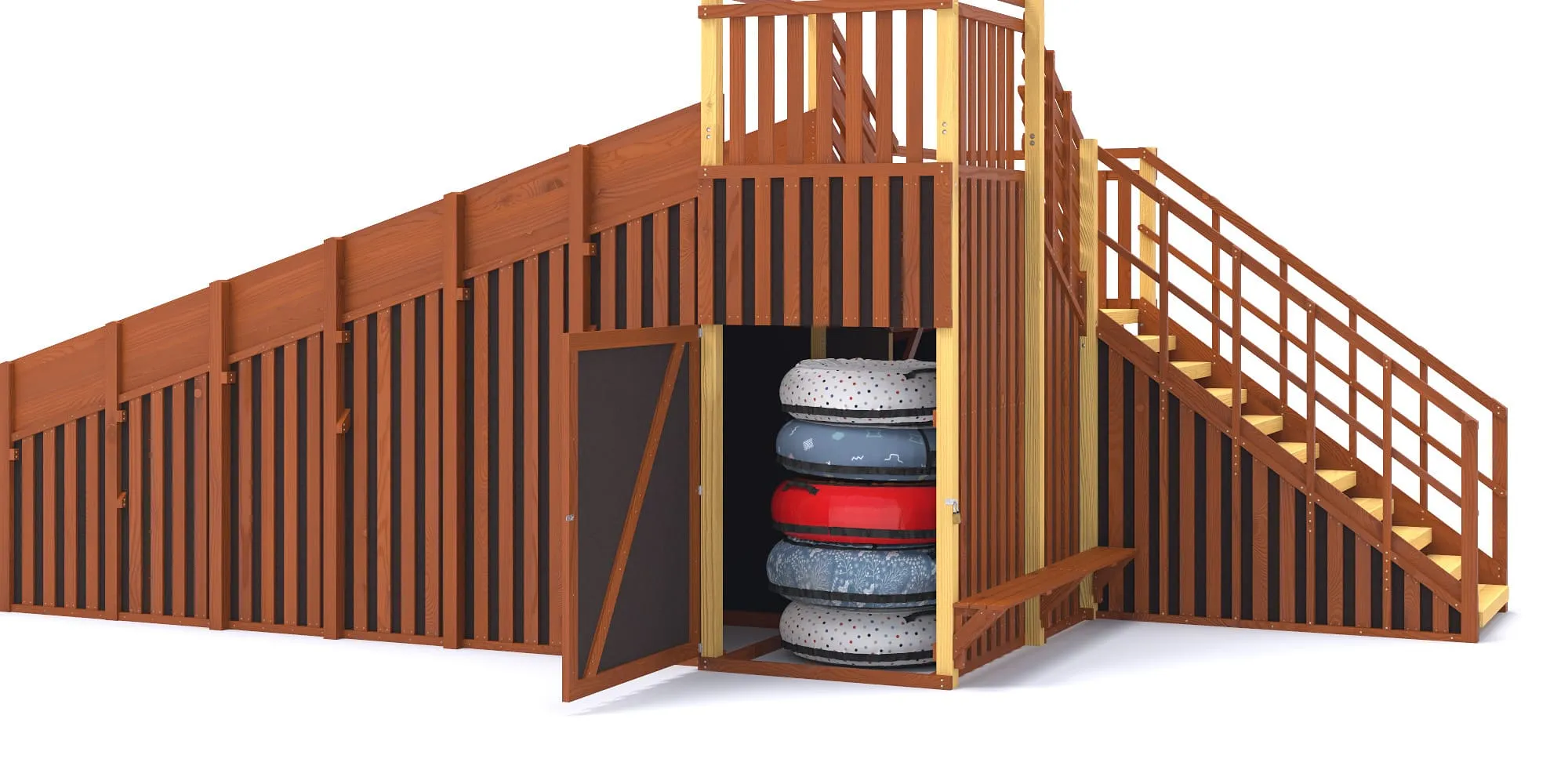 Закрытые фасады и встроенное хранилище тюбингов формируют премиальный внешний вид, защищают конструкцию от снега и позволяют хранить инвентарь сухим и аккуратным под замком. В старших моделях с закрытыми фасадами мы добавили удобную лавочку для отдыха.