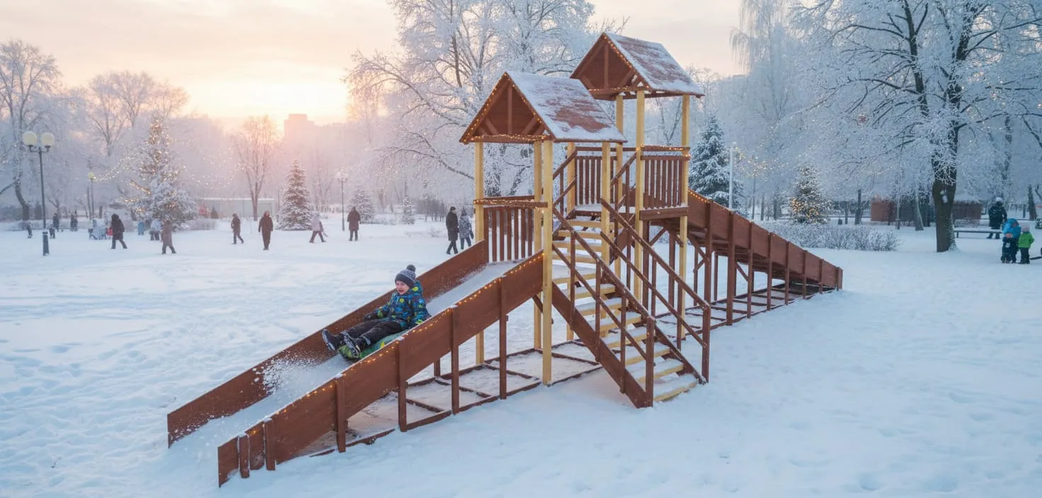 Широкие спуски позволяют кататься на ватрушках и ледянках. Две башни с крышей создают «домики-штабы», а просторные лестницы исключают очереди.