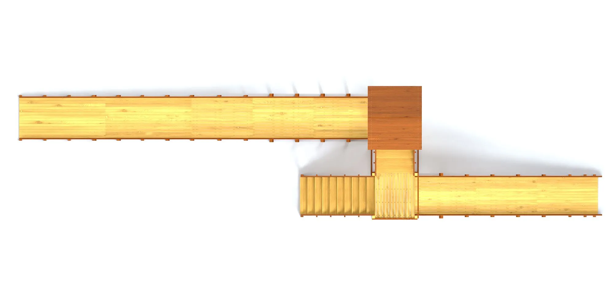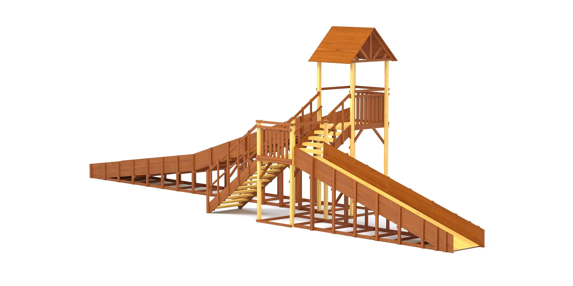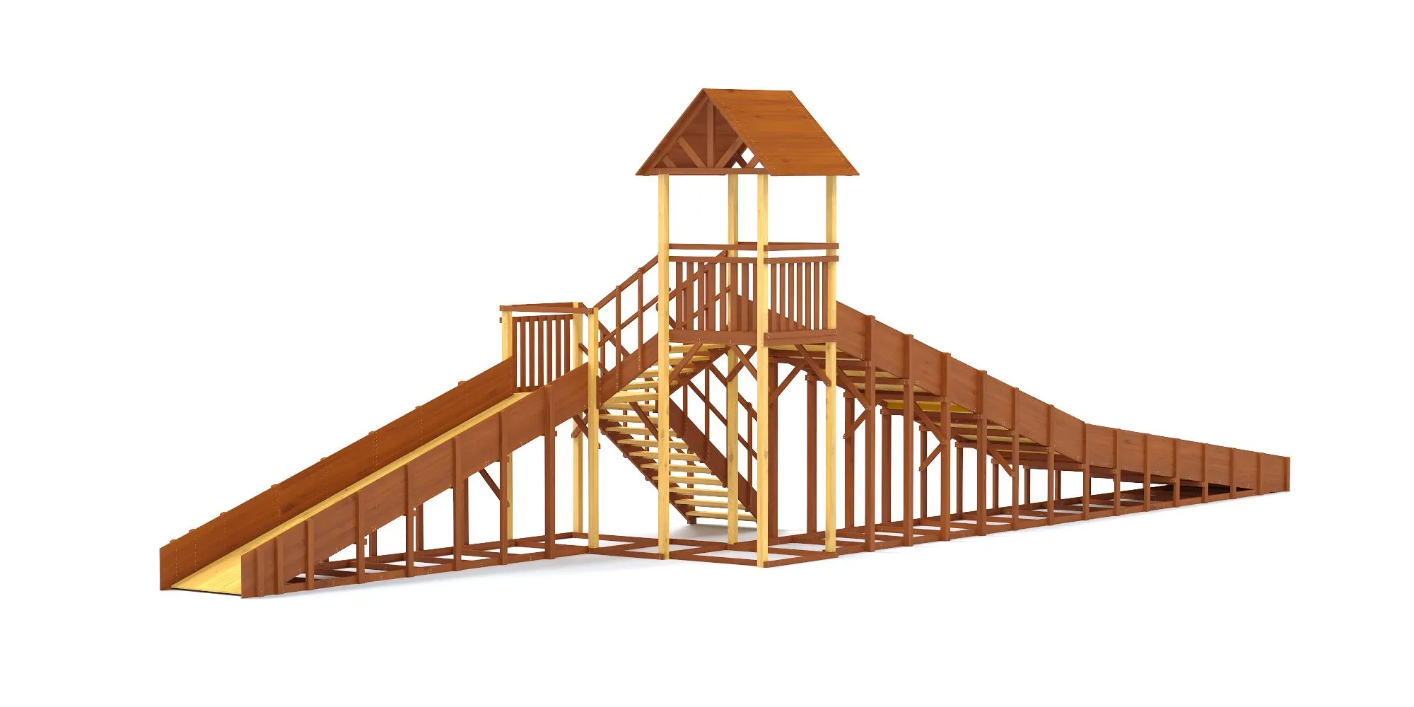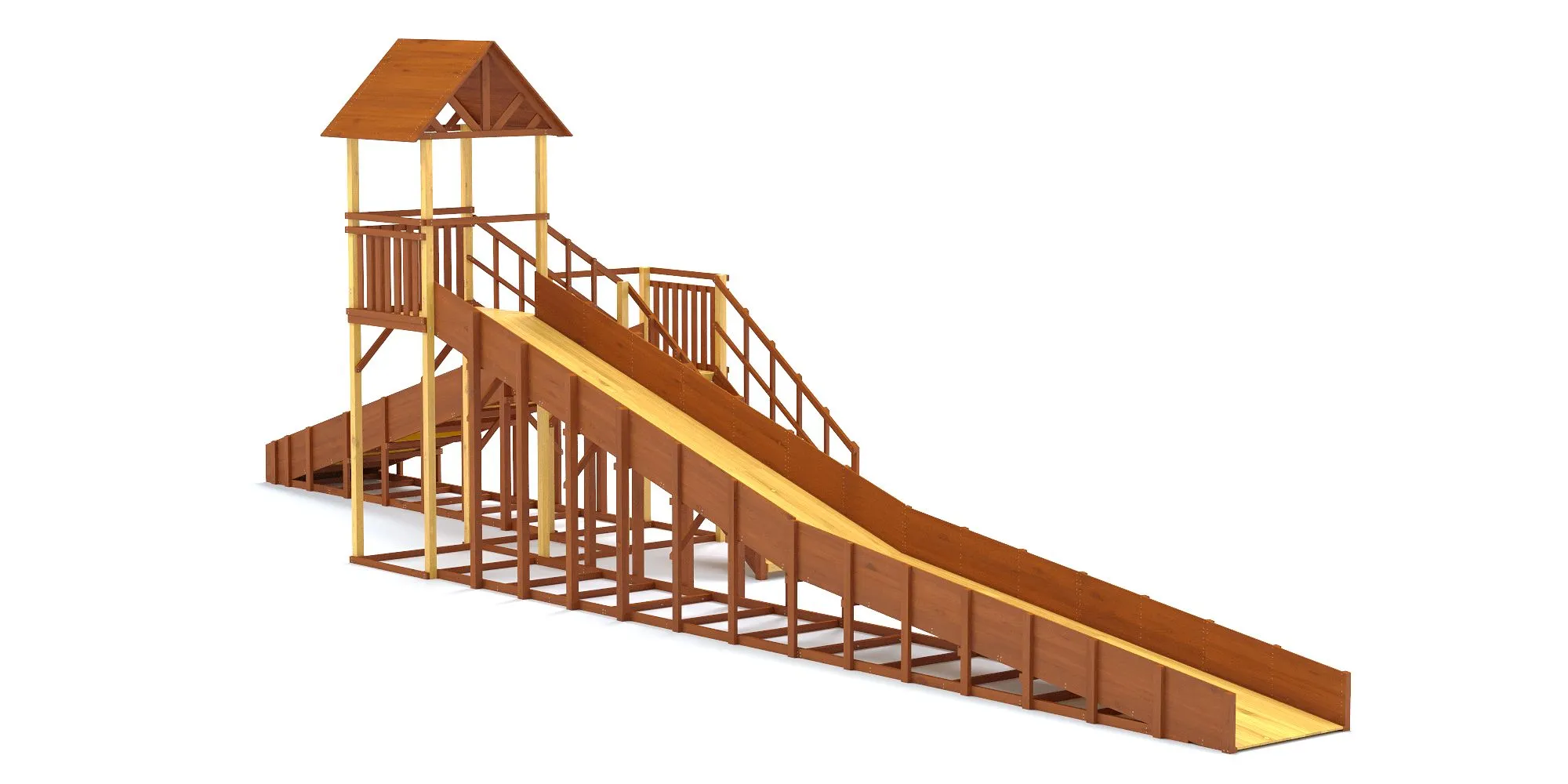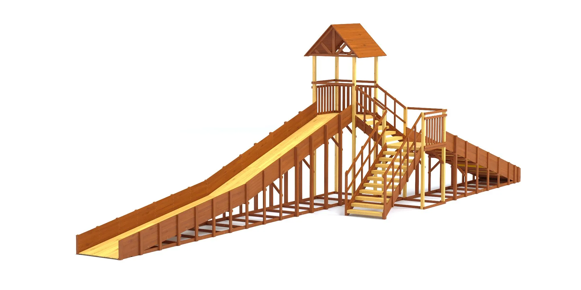 - Две деревянные горки и широкая лестница для удобного подъёма.