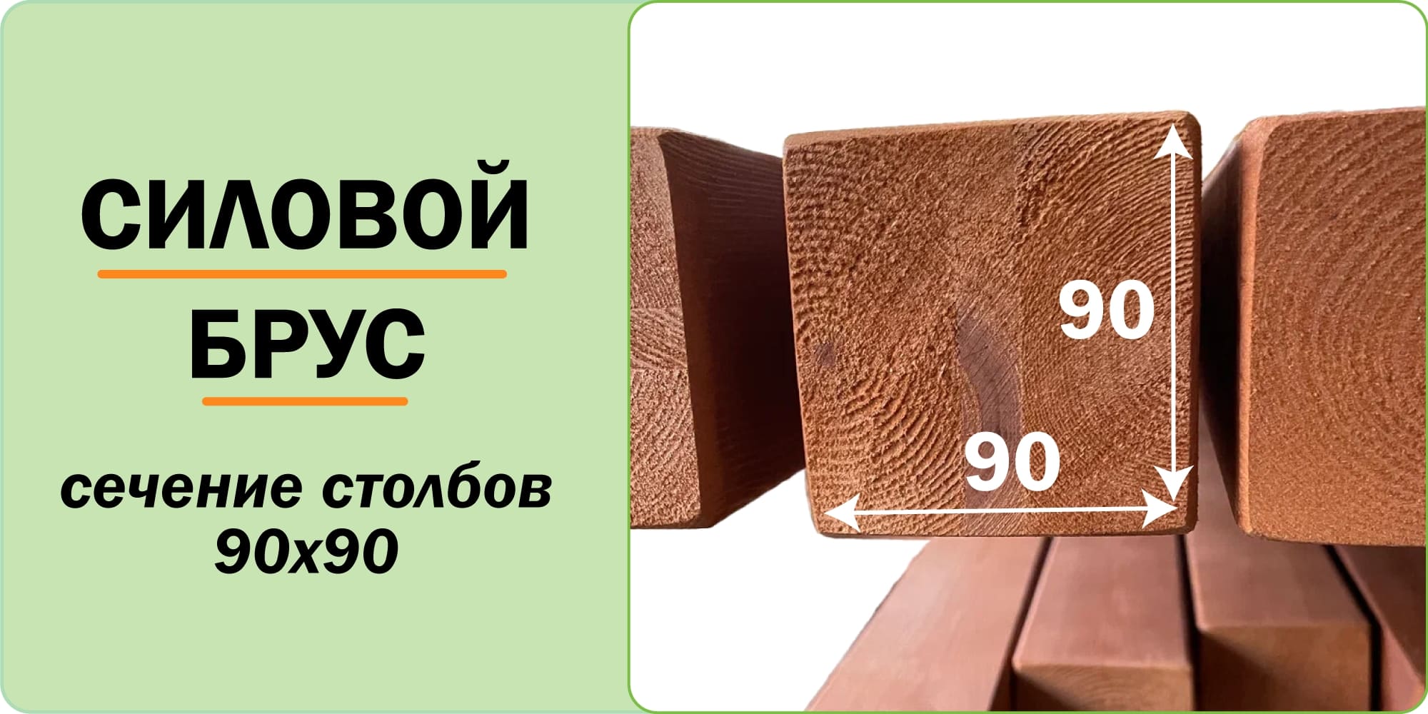 Надежность конструкции достигается за счет использования только качественных материалов. Силовые детали выполнены из клееного бруса 90х90мм. Мы используем брус камерной сушки, он менее склонен к растрескиванию, чем брус естественной сушки.