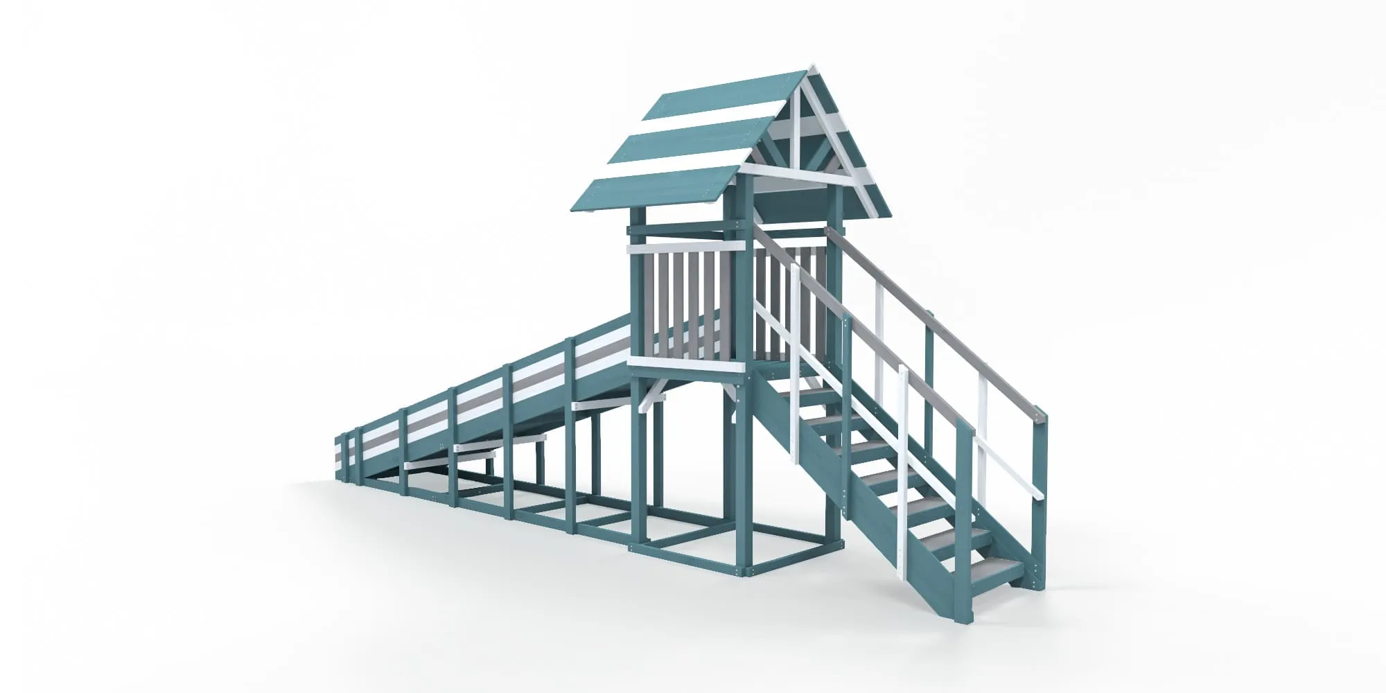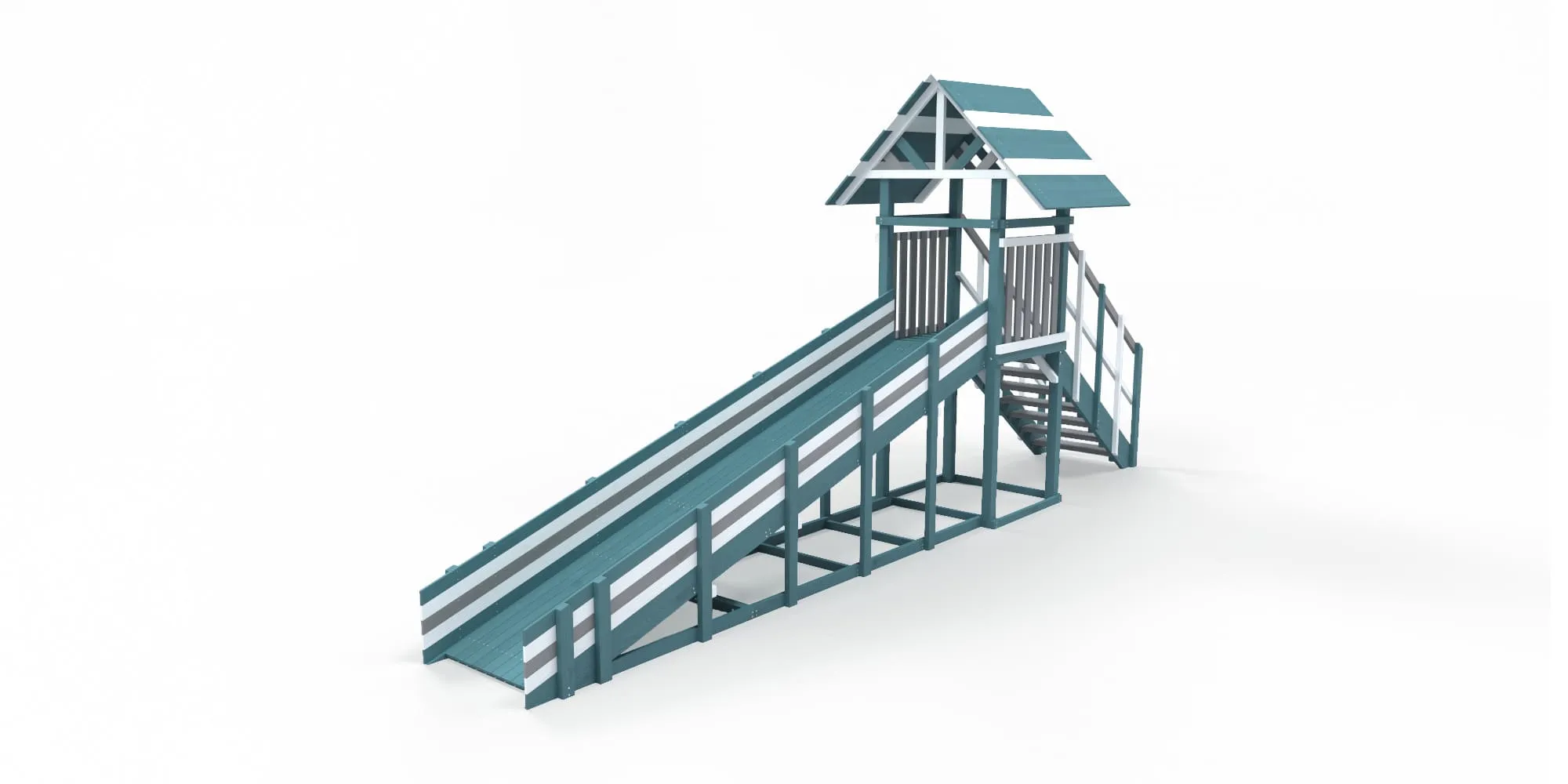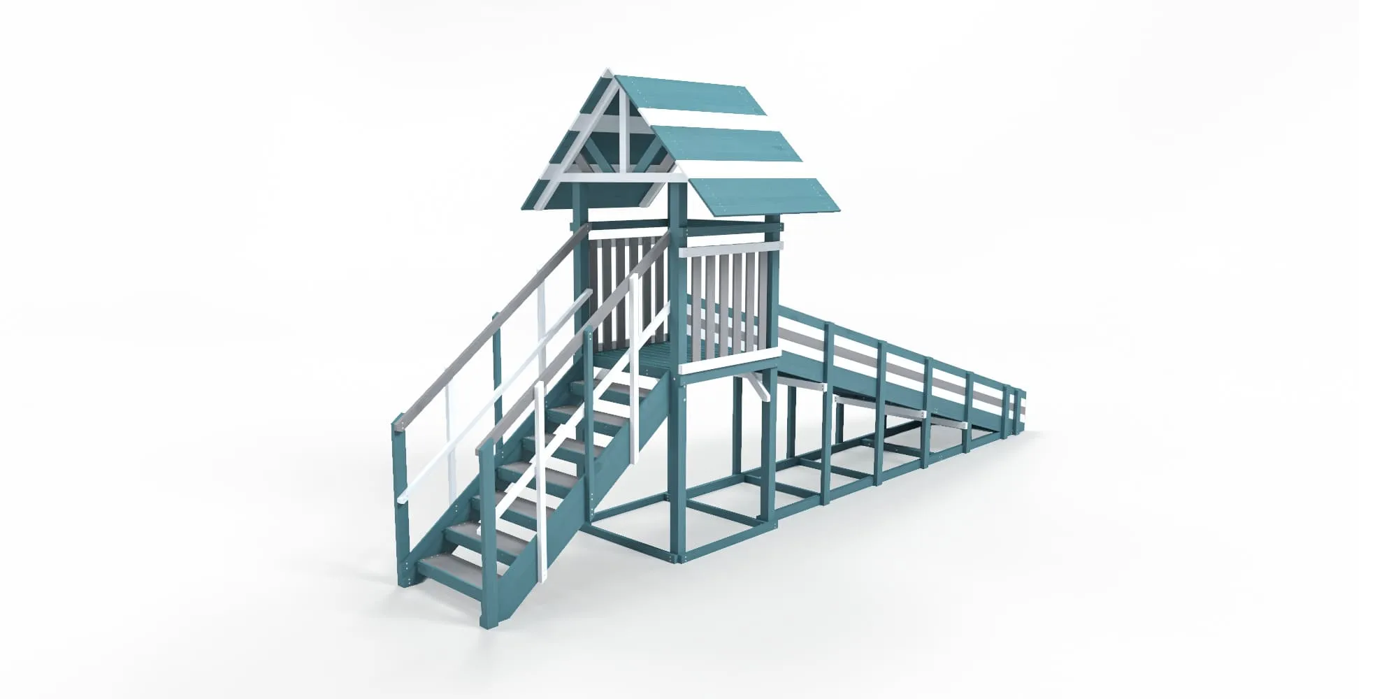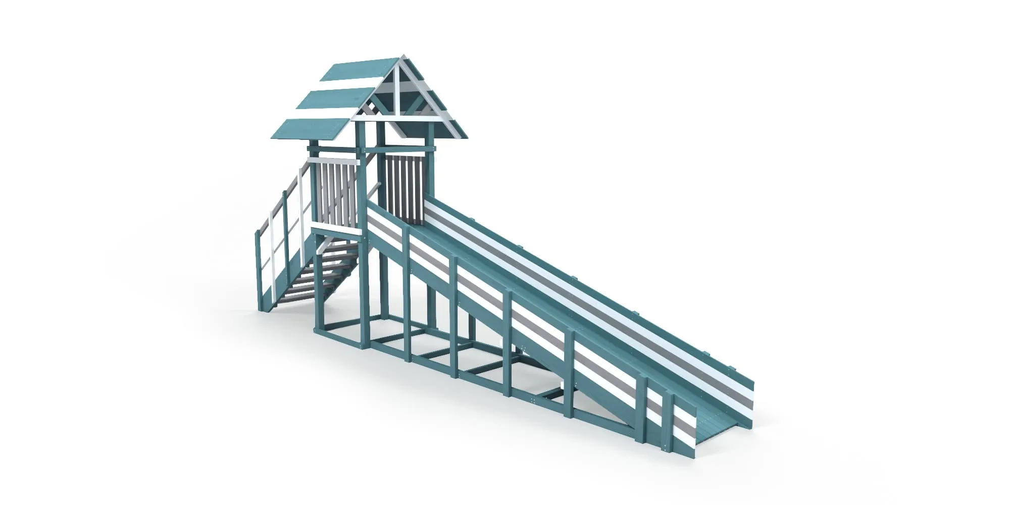 Каркас выполнен из прочного клеёного бруса камерной сушки. Все поверхности тщательно отшлифованы, углы скруглены, а крепежи закрыты заглушками. Деревянная крыша защищает площадку от осадков, а специальное атмосферостойкое покрытие сохраняет древесину в идеальном состоянии.
