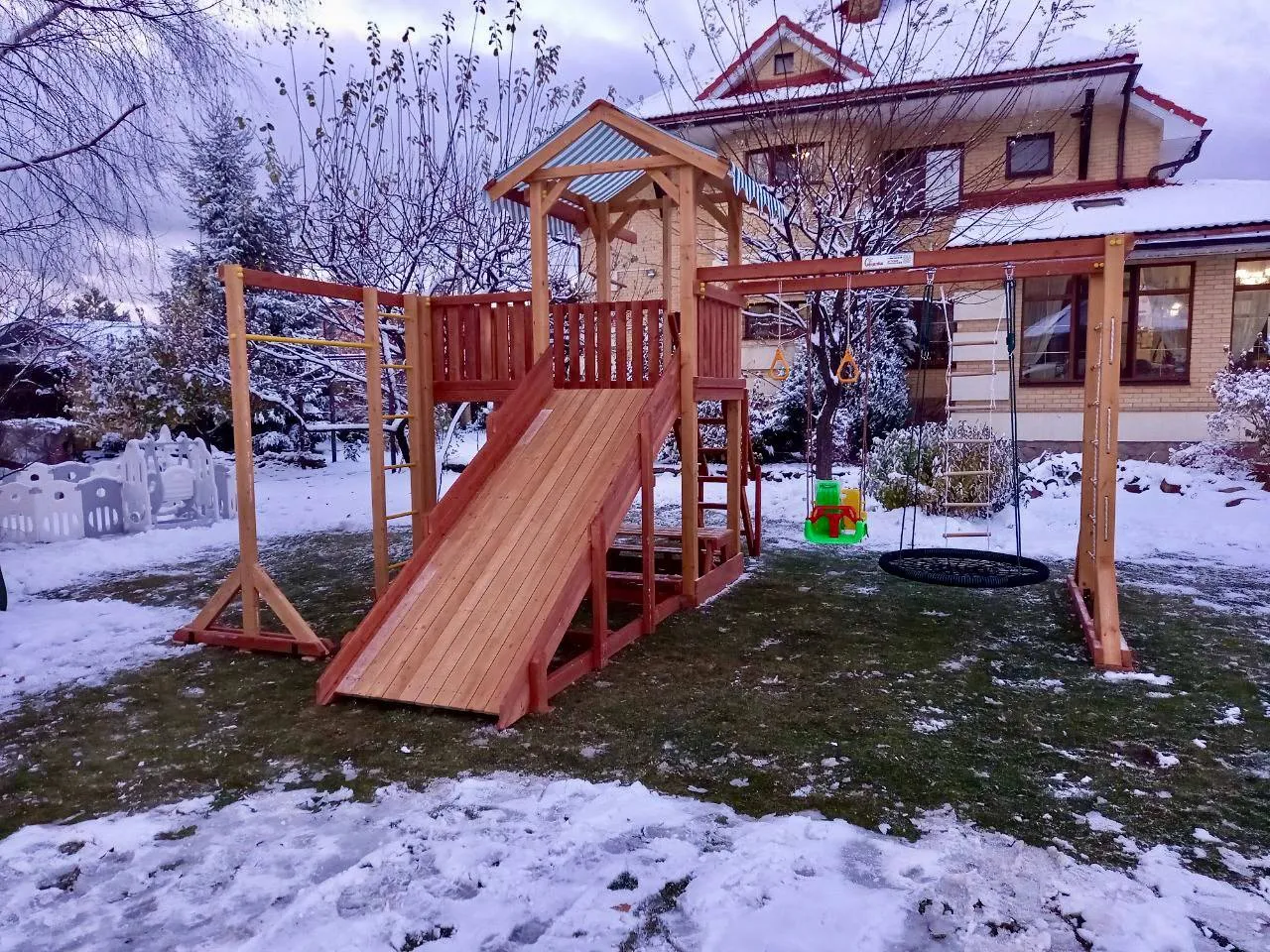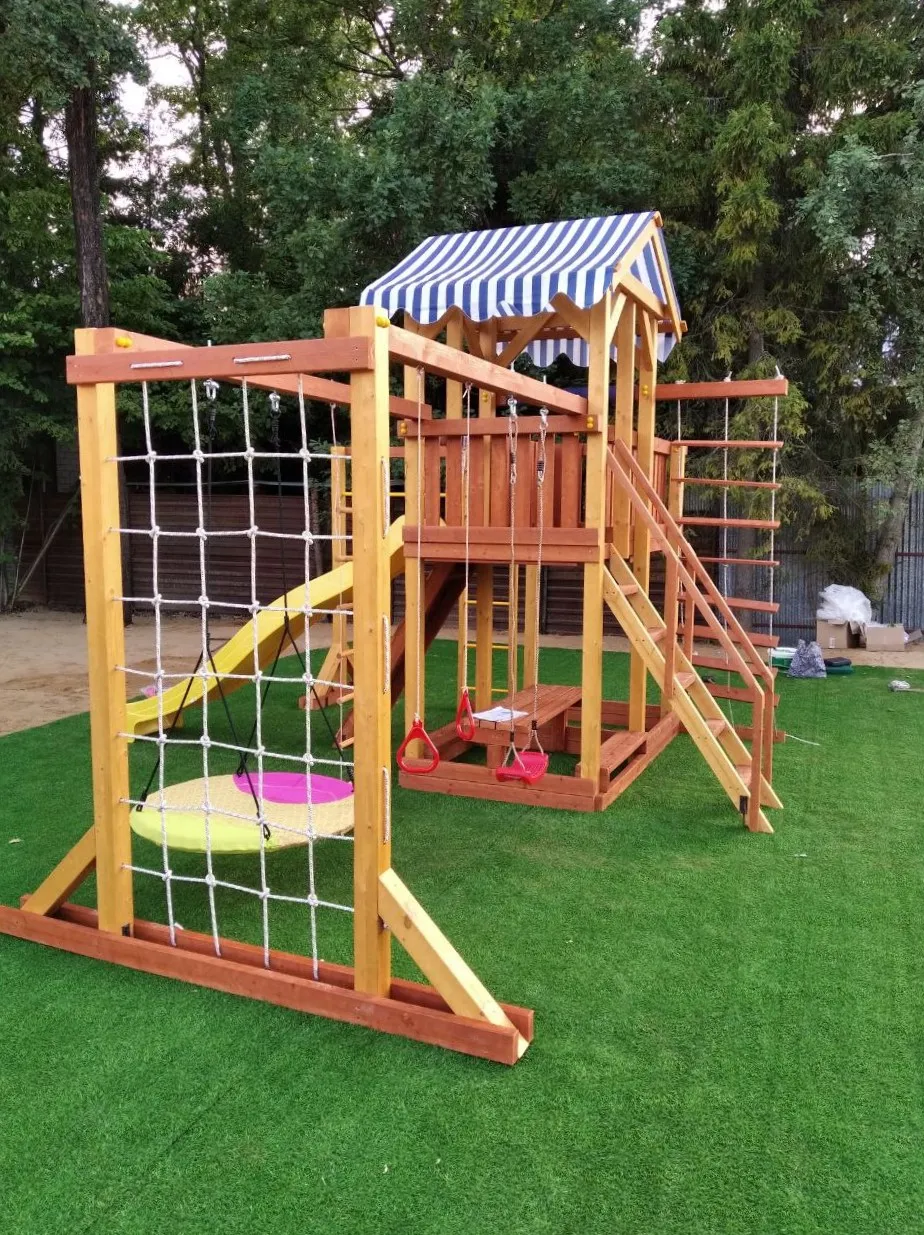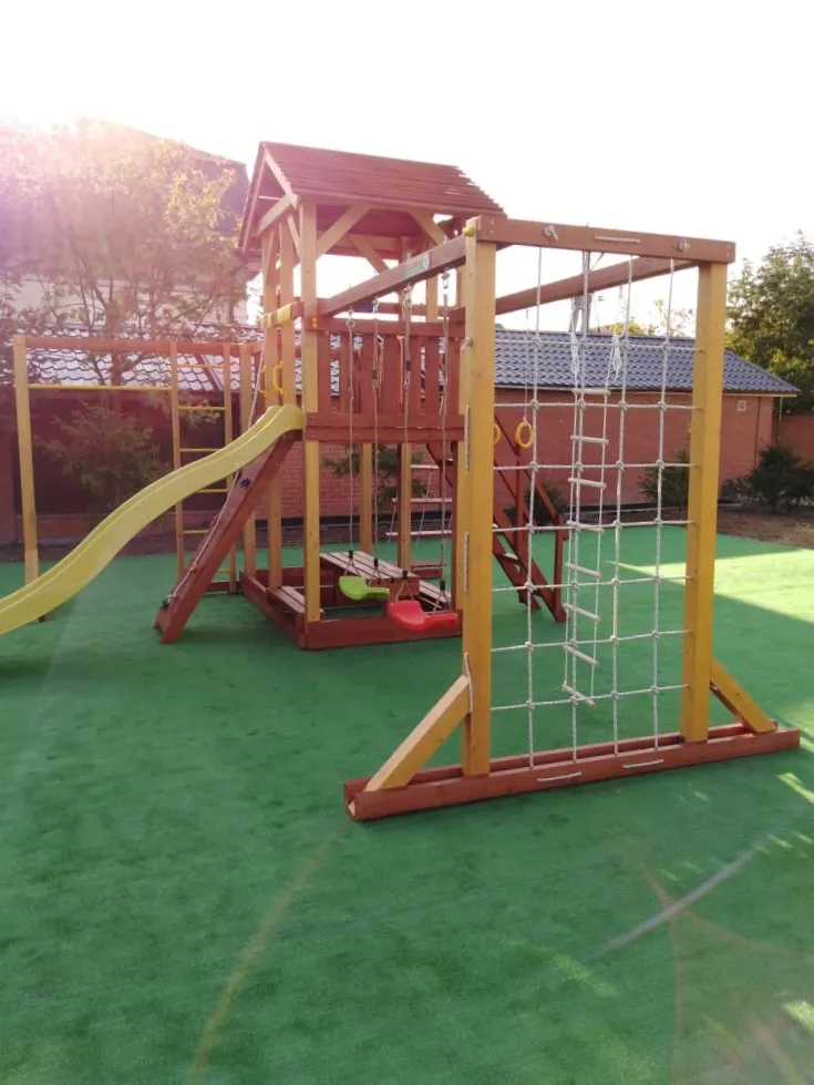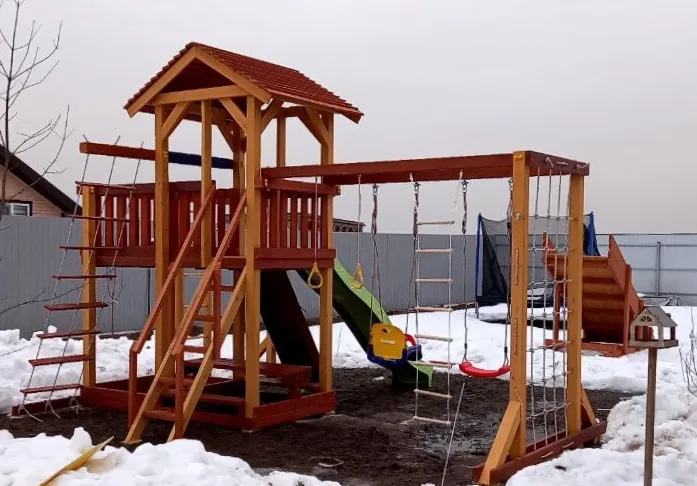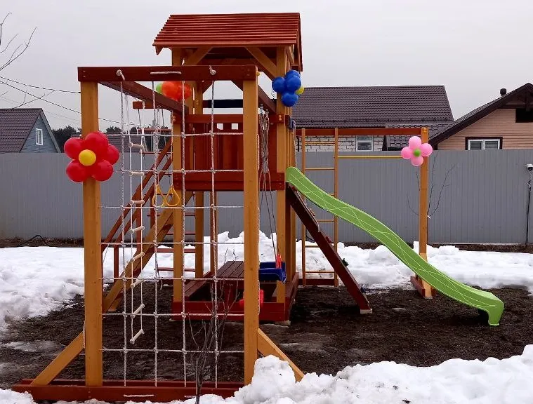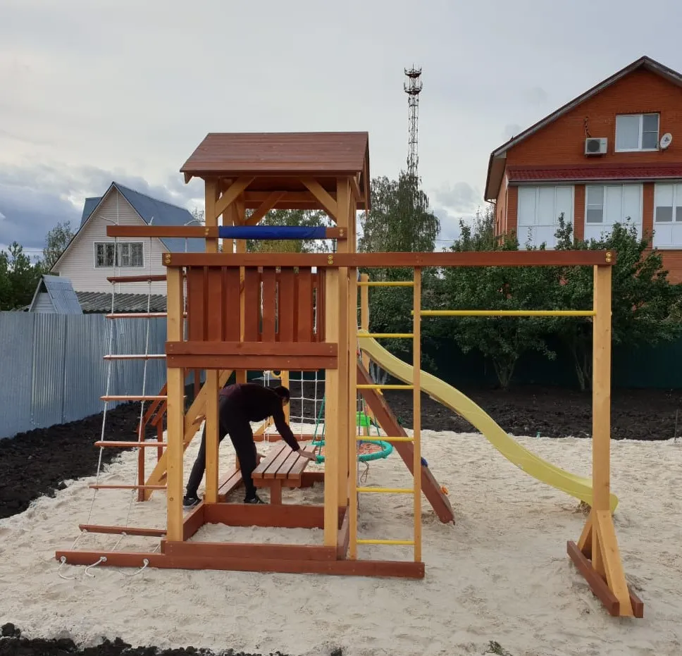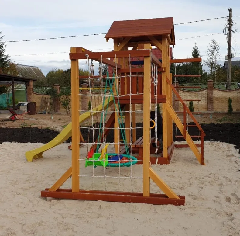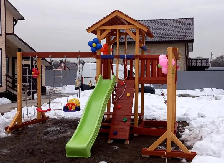 Все балки и опоры соответствуют ГОСТ и выдерживают активные игры на протяжении многих лет. Площадка устойчива к влаге и морозу, подходит для круглогодичного использования.