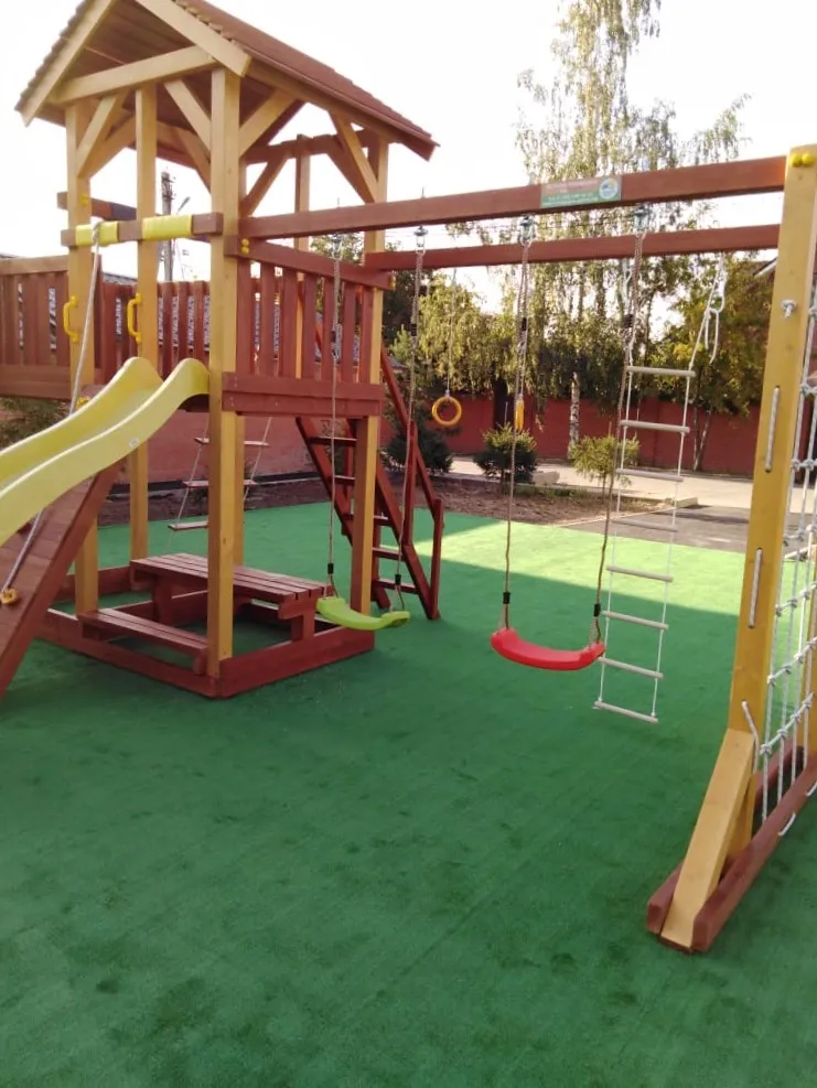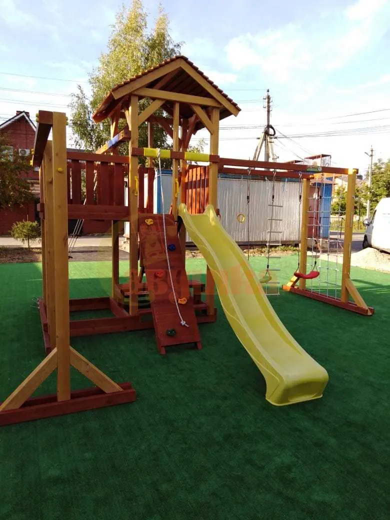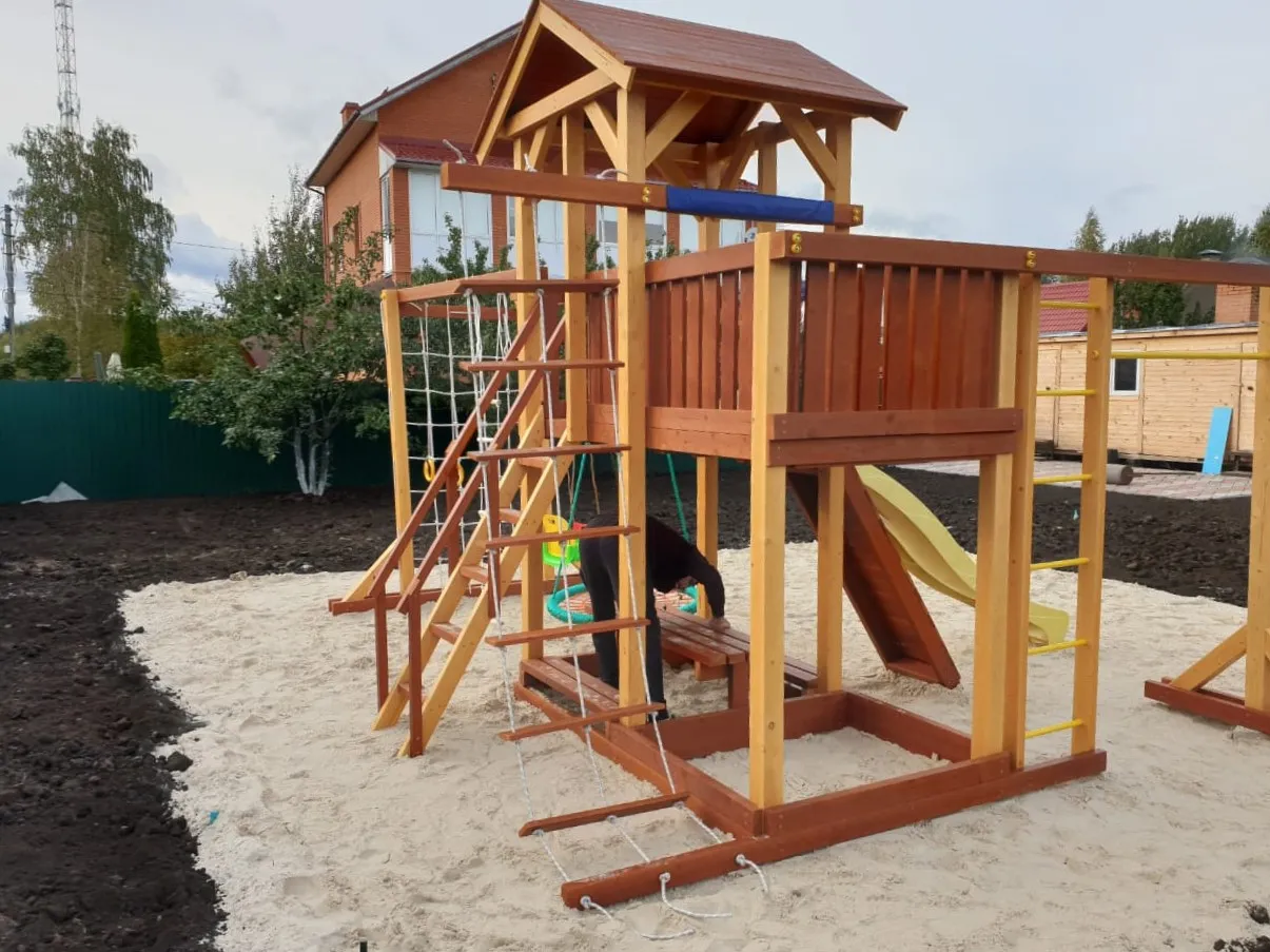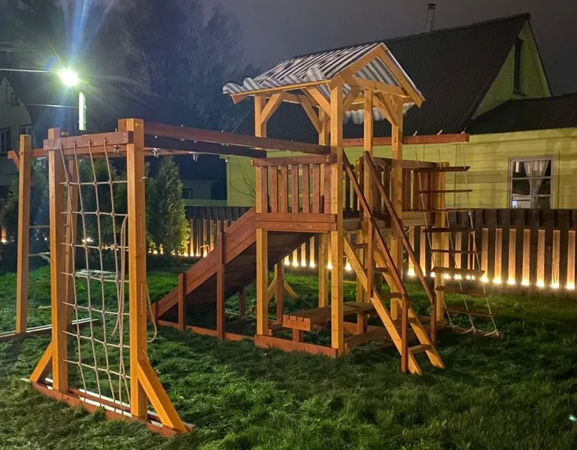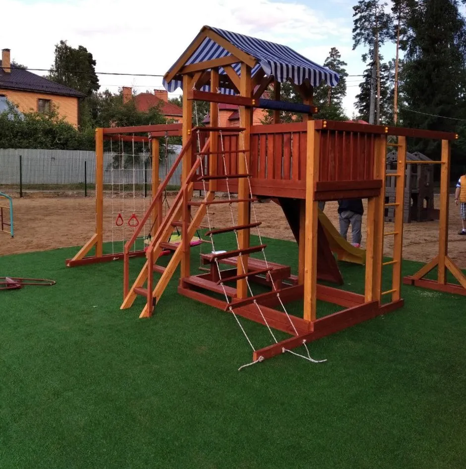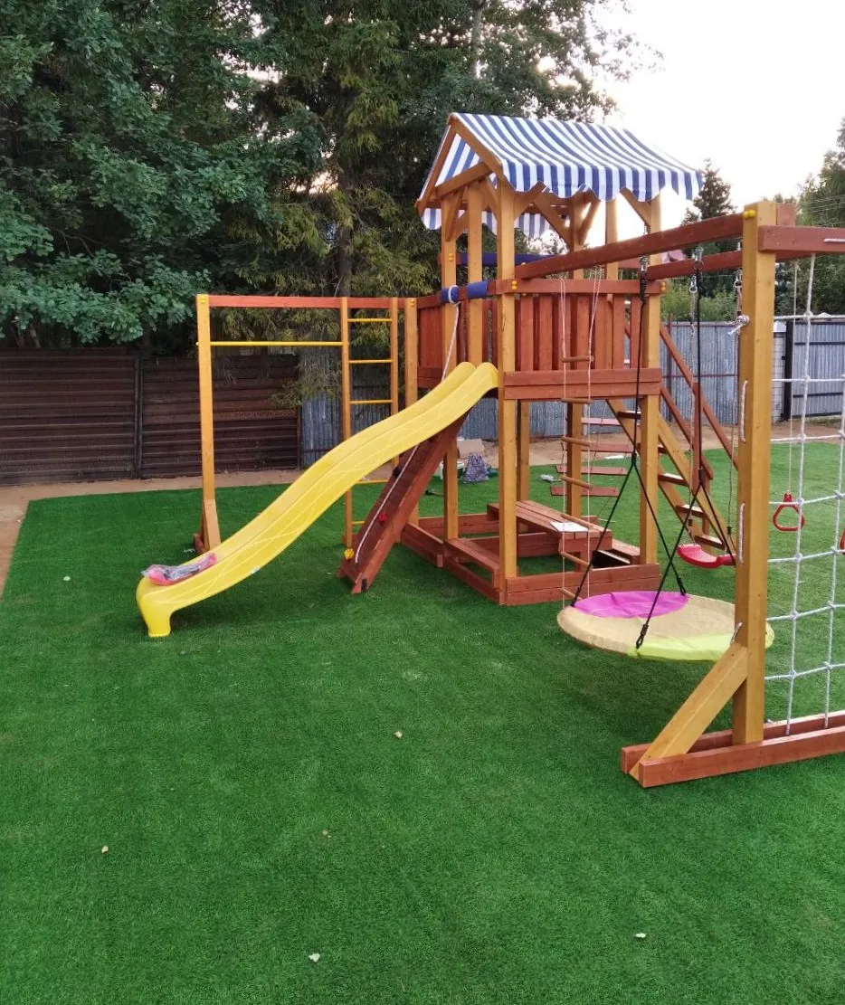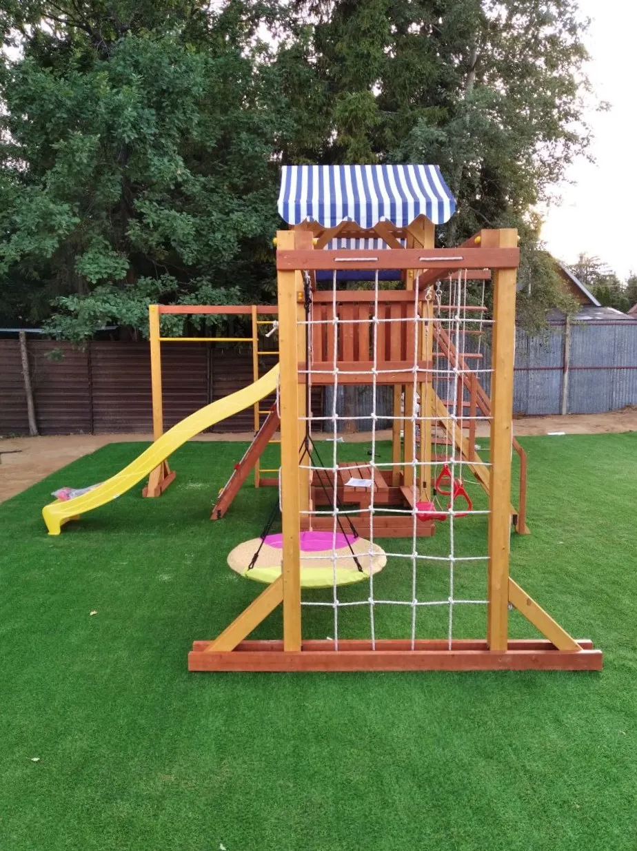 Все балки и опоры соответствуют ГОСТ и выдерживают активные игры на протяжении многих лет. Площадка устойчива к влаге и морозу, подходит для круглогодичного использования.
