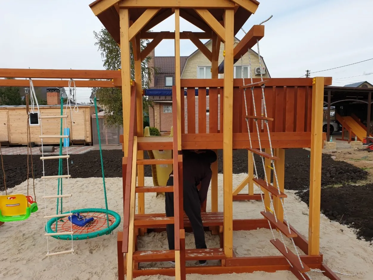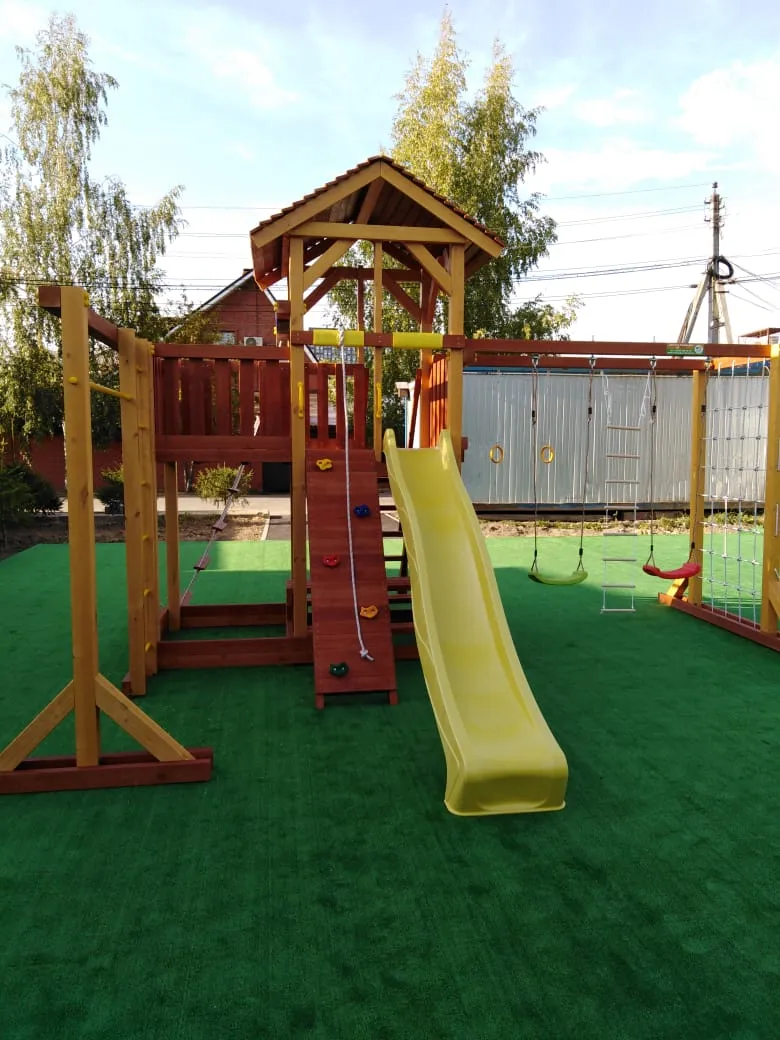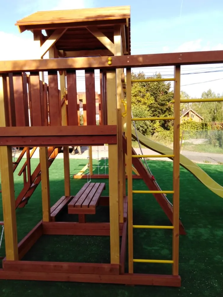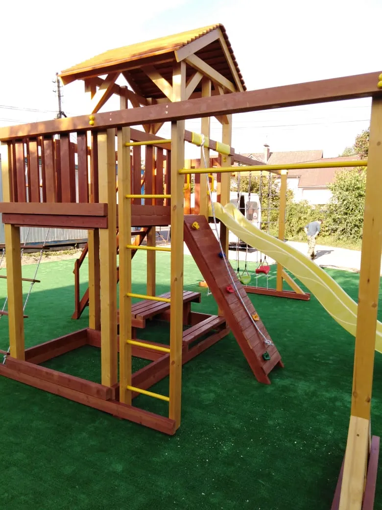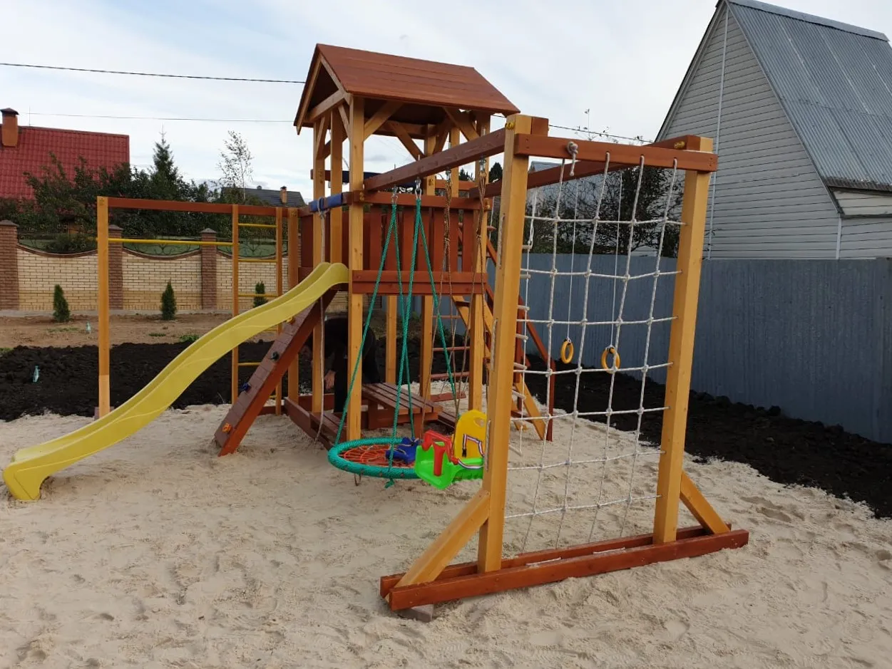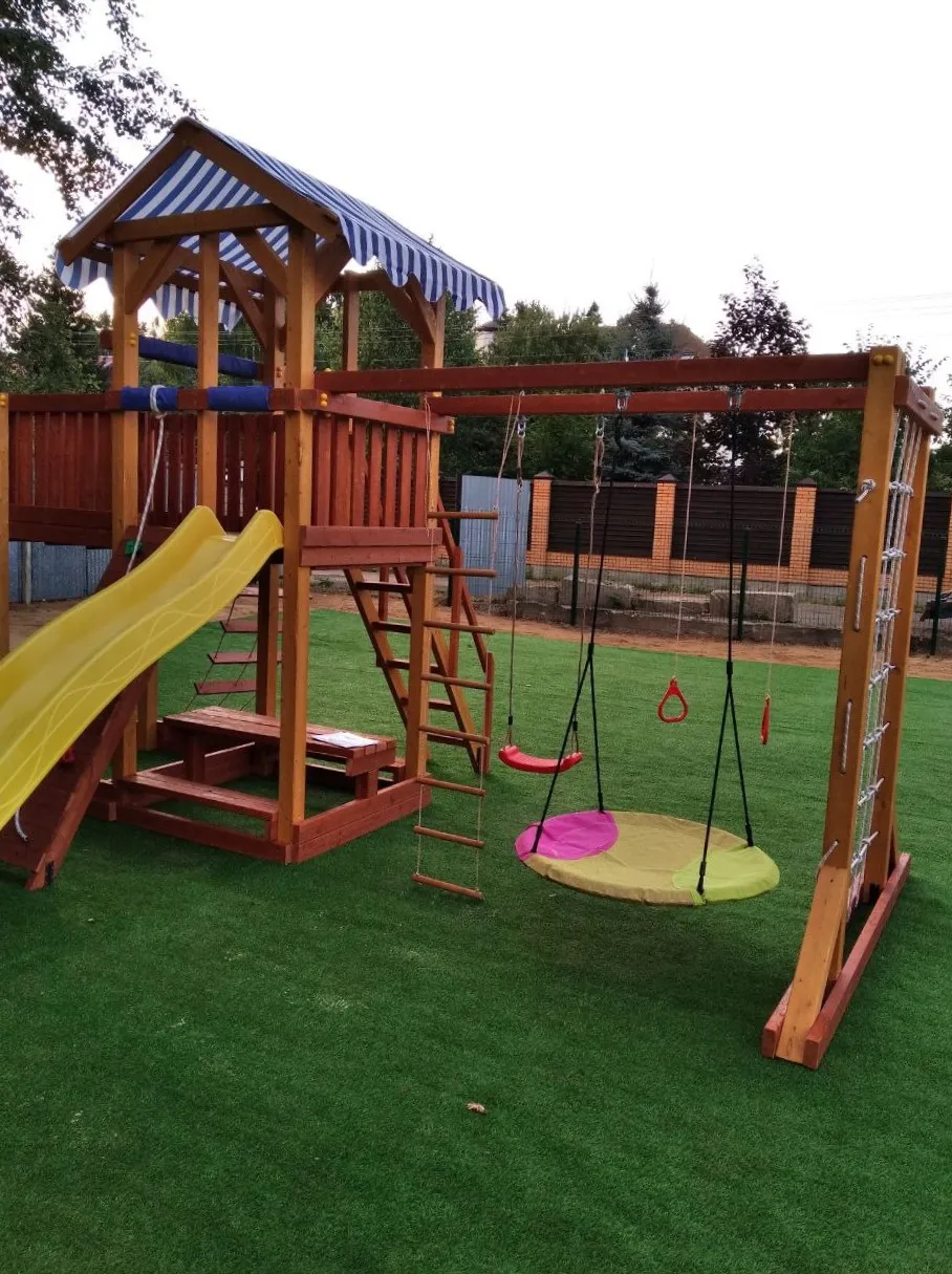 Все балки и опоры соответствуют ГОСТ и выдерживают активные игры на протяжении многих лет. Площадка устойчива к влаге и морозу, подходит для круглогодичного использования.