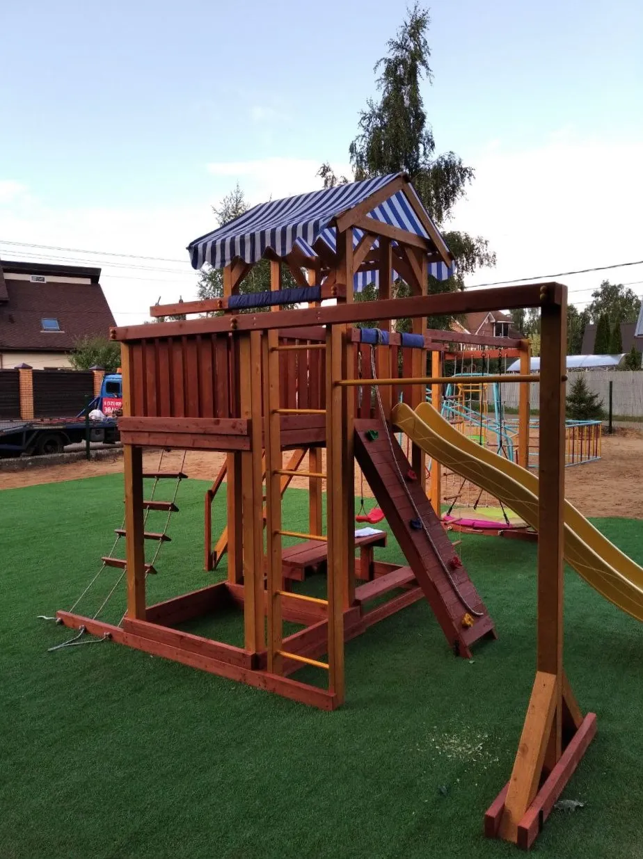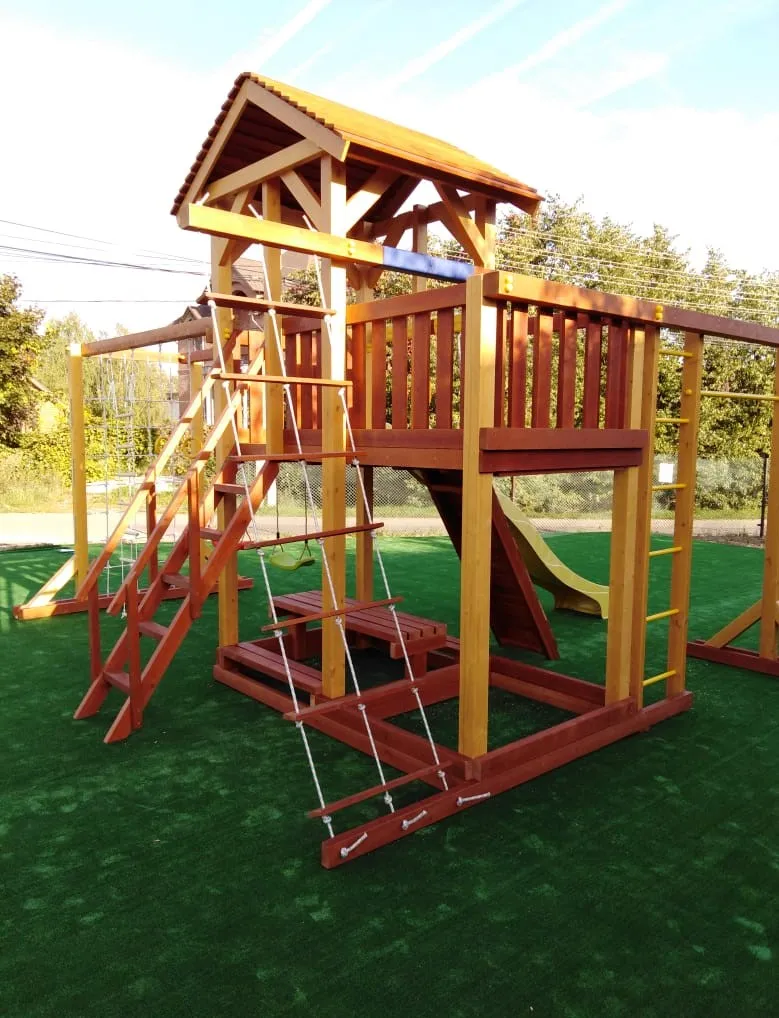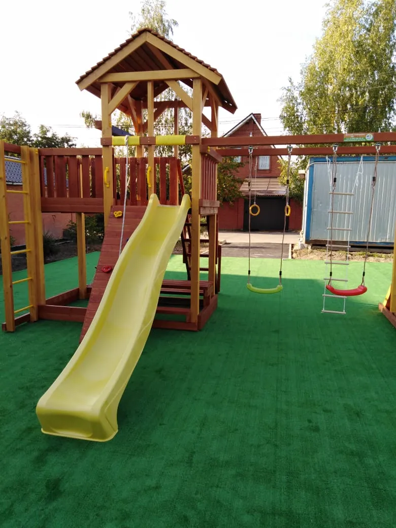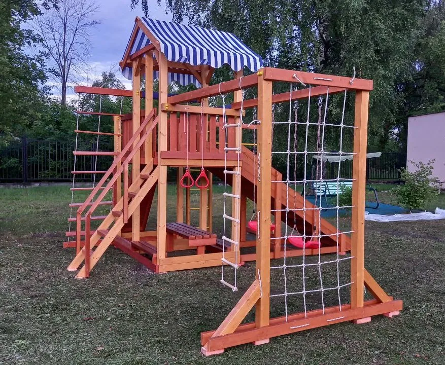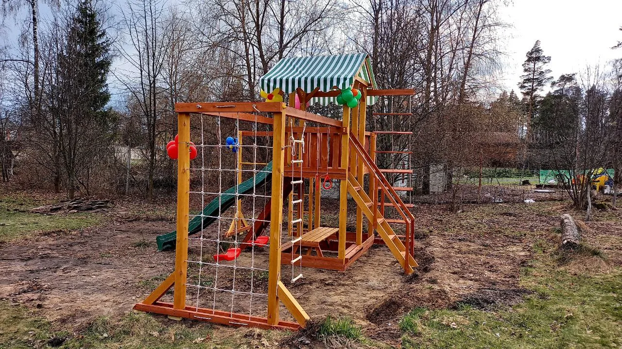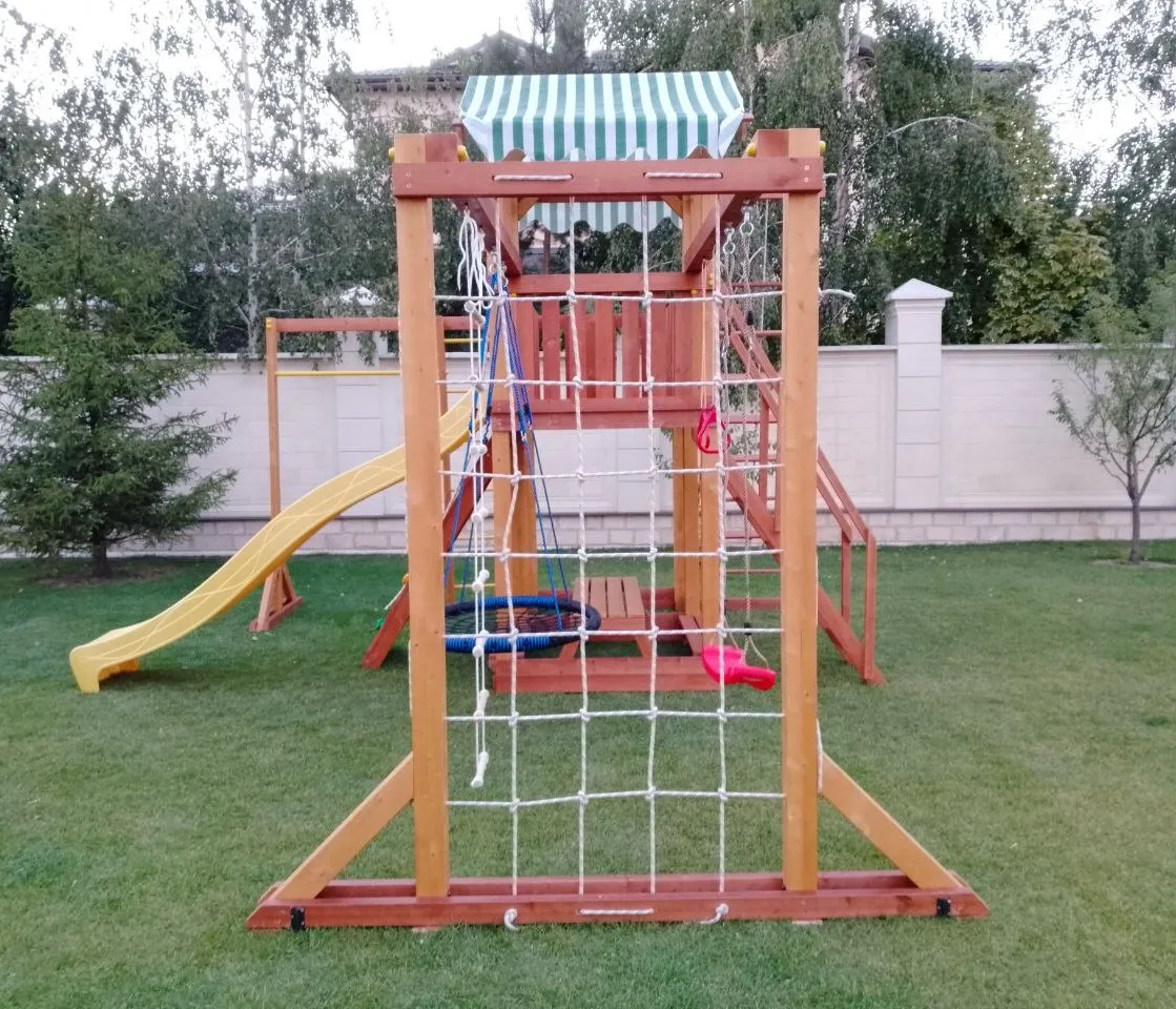Все балки и опоры соответствуют ГОСТ и выдерживают активные игры на протяжении многих лет. Площадка устойчива к влаге и морозу, подходит для круглогодичного использования.