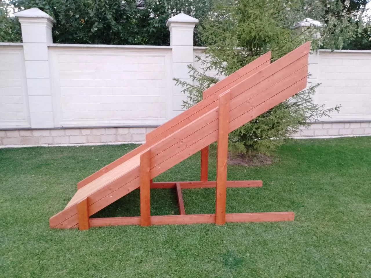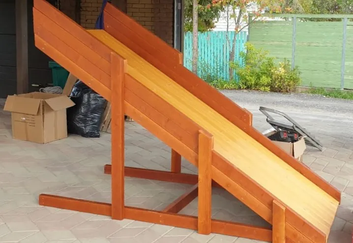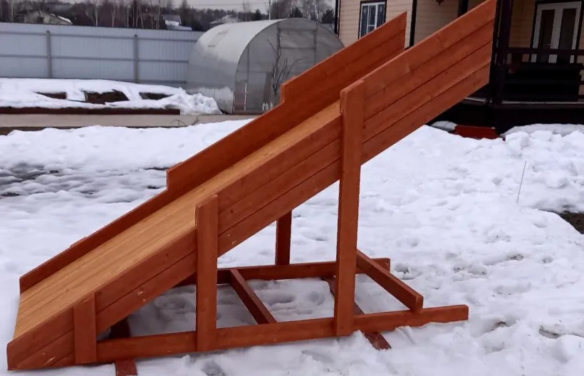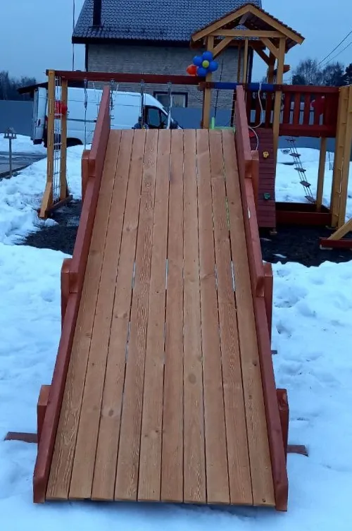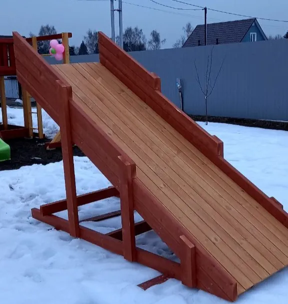 - Зимой пластиковая горка и скалодром заменяются на деревянный скат — получается ледяная горка для ватрушек.