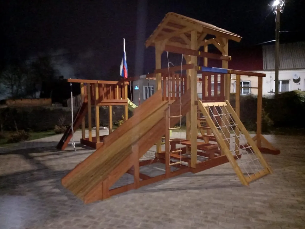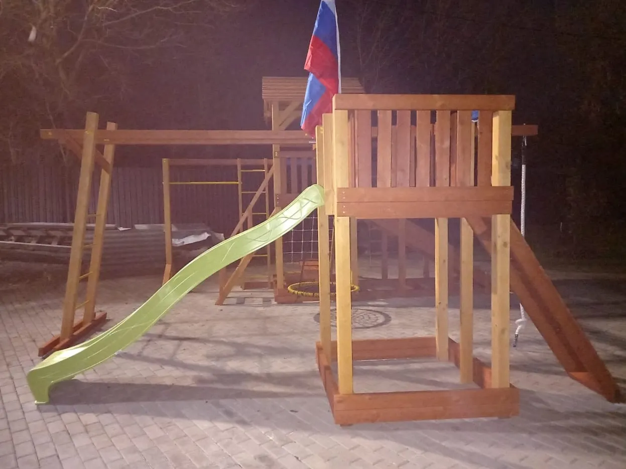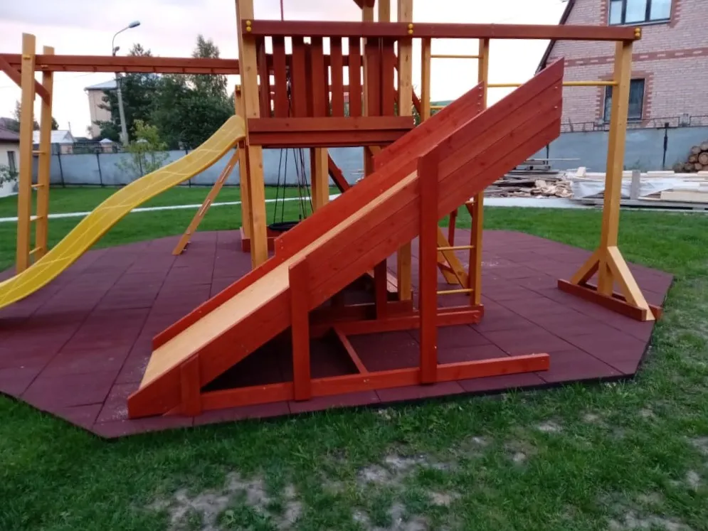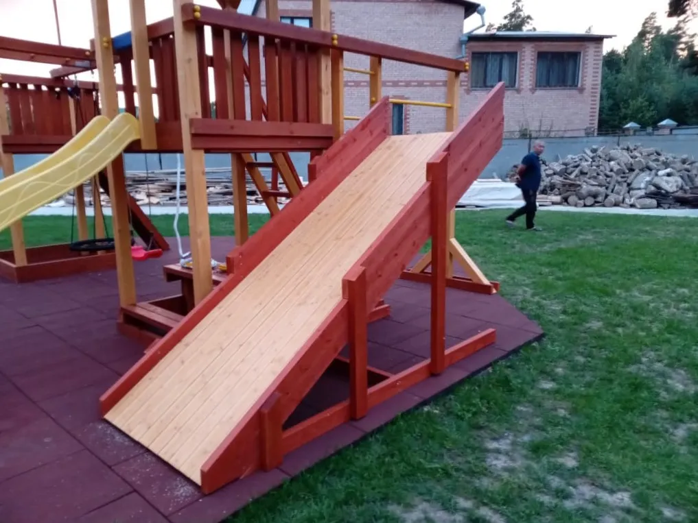 Все конструкции соответствуют ГОСТ, а краска на водной основе безопасна для детей и устойчива к осадкам. Площадка рассчитана на круглогодичное использование — зимой устанавливается широкий деревянный скат.