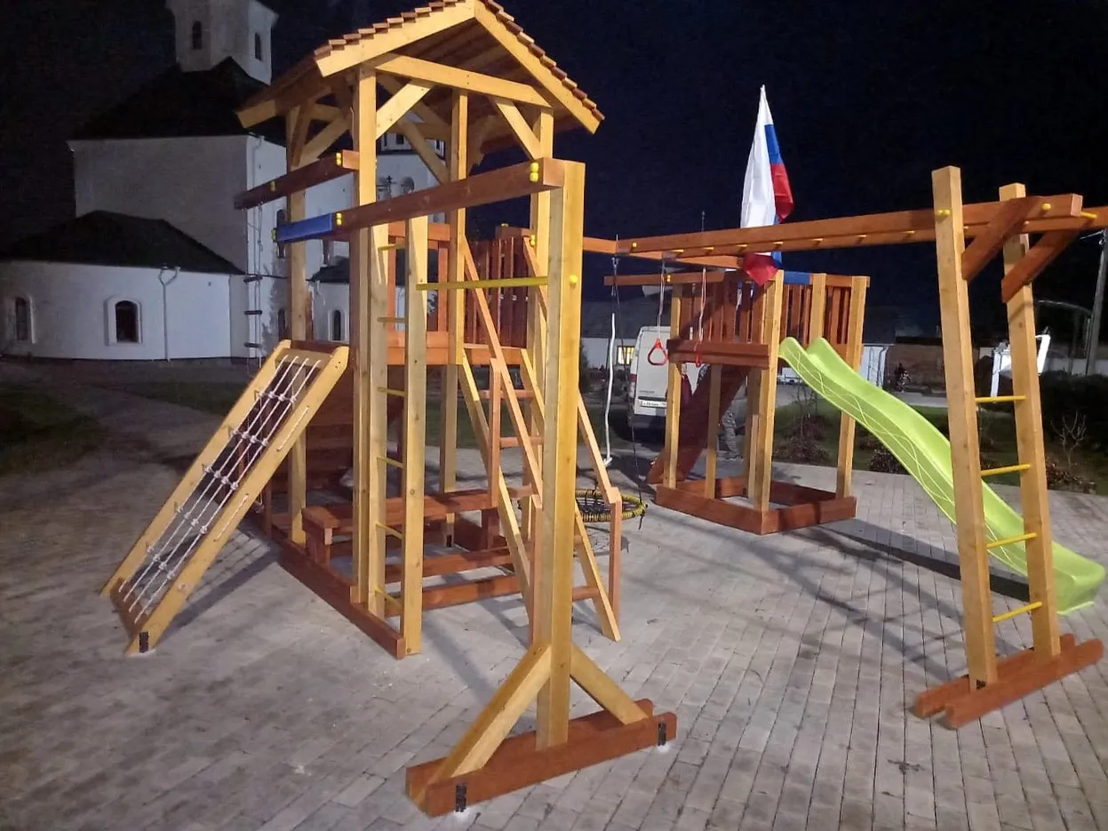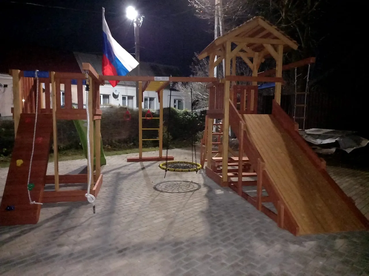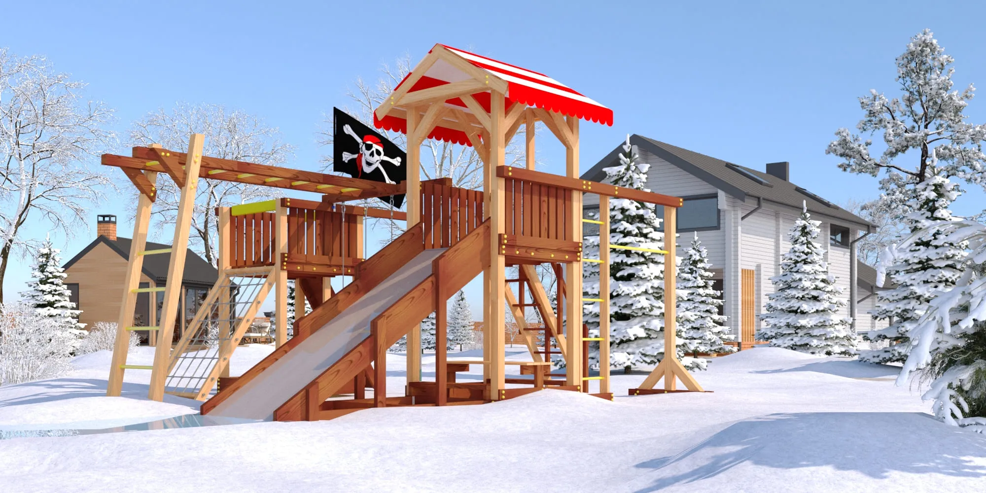 Все конструкции соответствуют ГОСТ, а краска на водной основе безопасна для детей и устойчива к осадкам. Площадка рассчитана на круглогодичное использование — зимой устанавливается широкий деревянный скат.