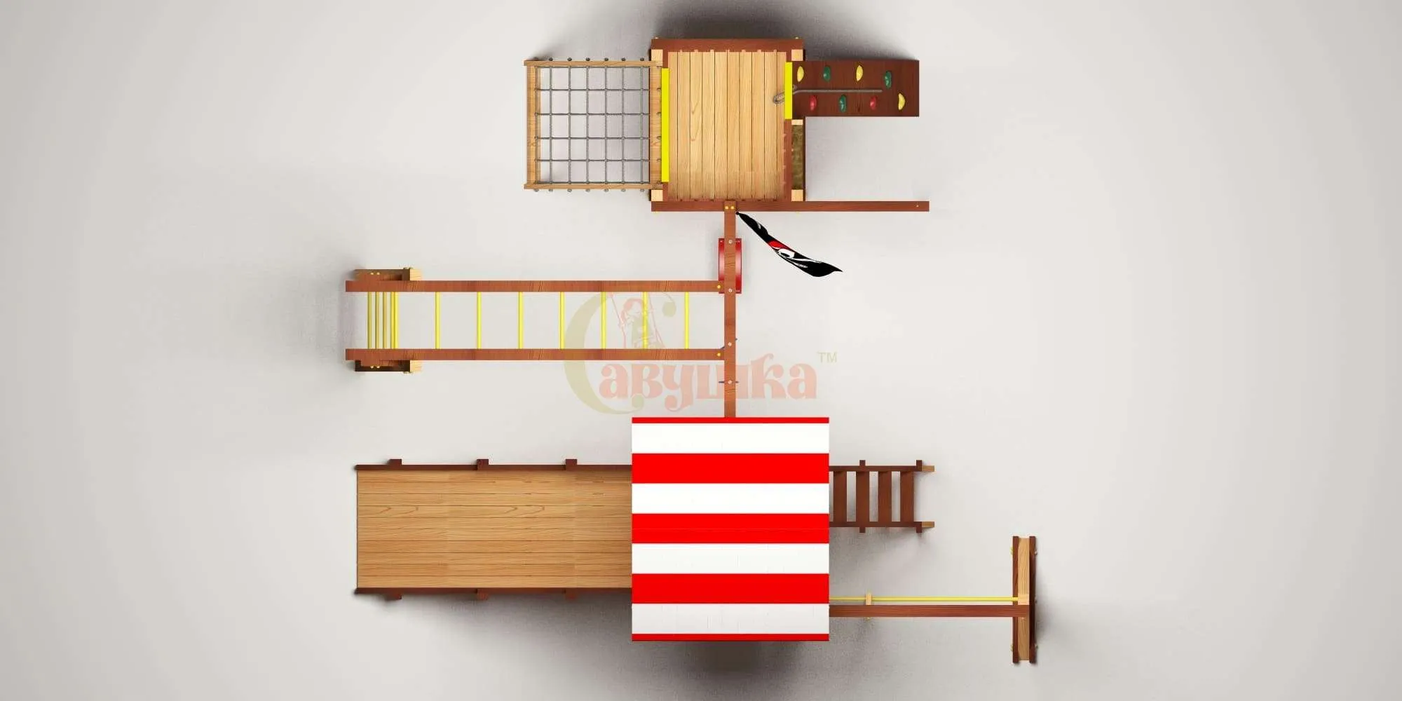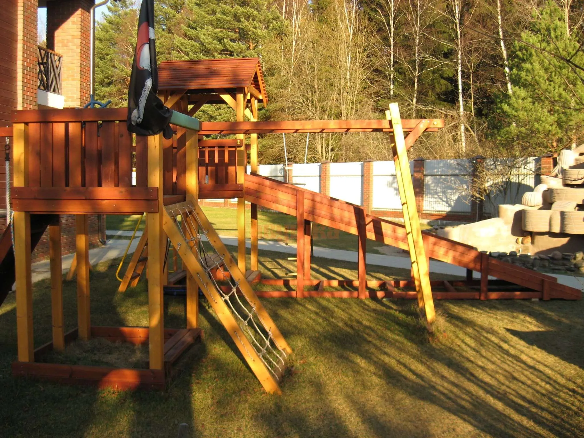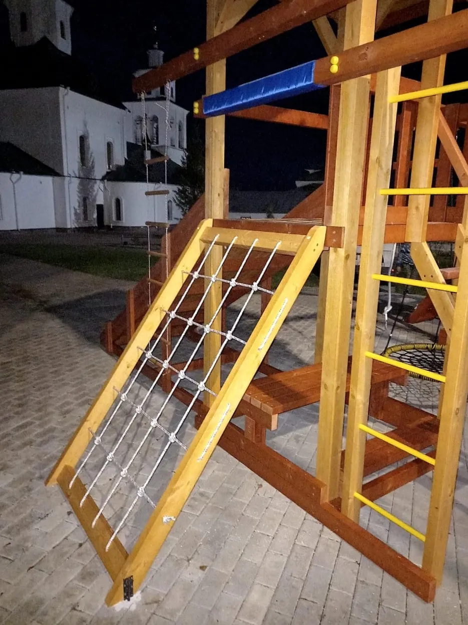 Каркас из клеёного бруса 90×90 мм не коробится со временем и выдерживает интенсивные игры. Все поверхности тщательно отшлифованы, углы скруглены, болты закрыты заглушками — 100% безопасность и комфорт.