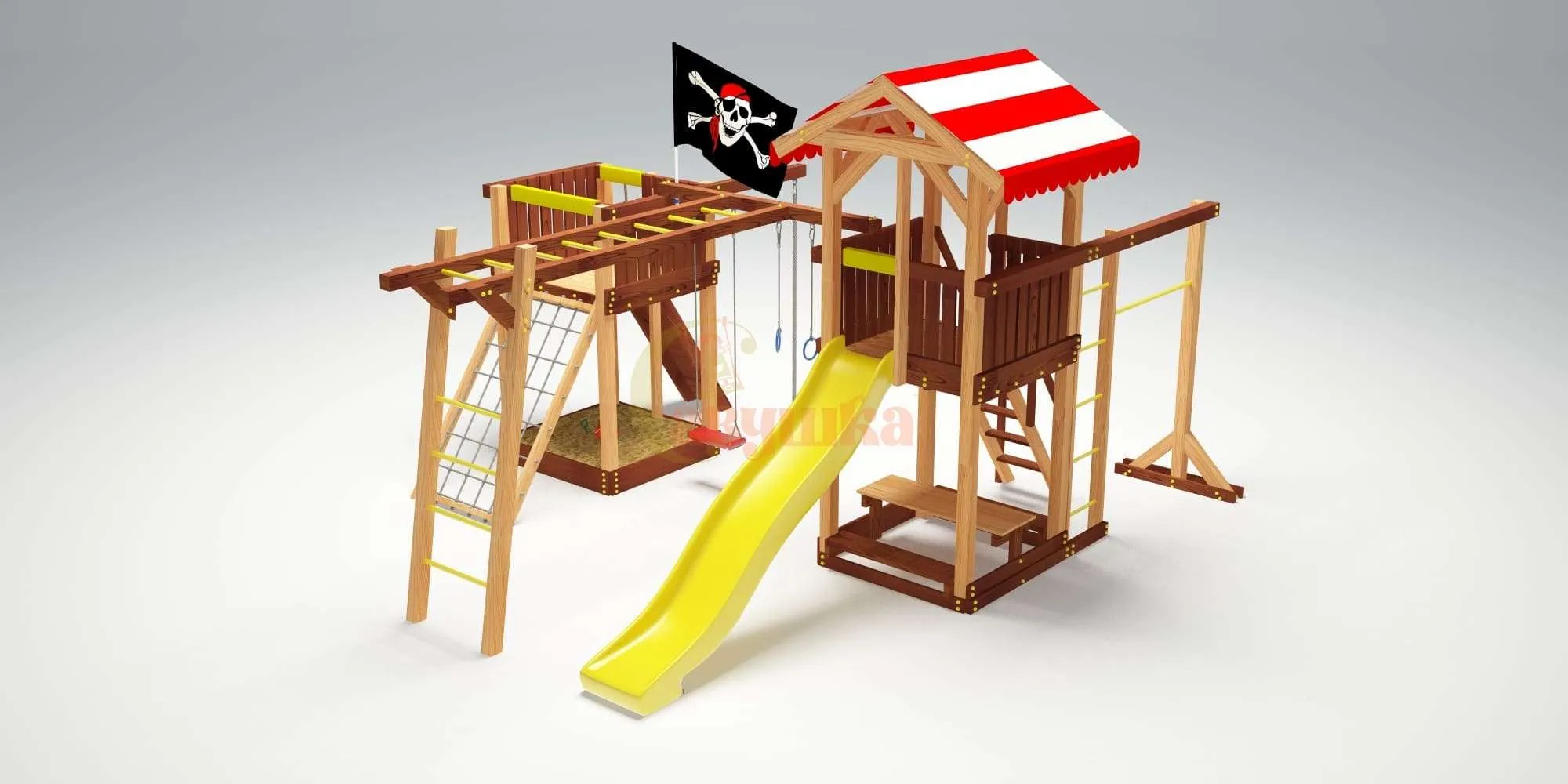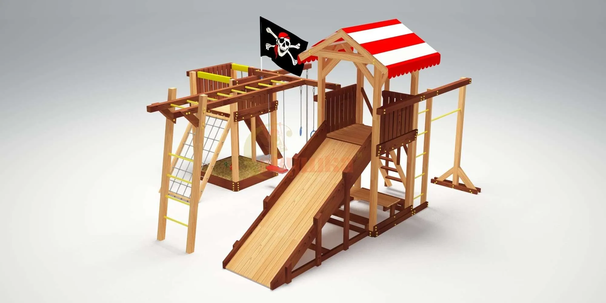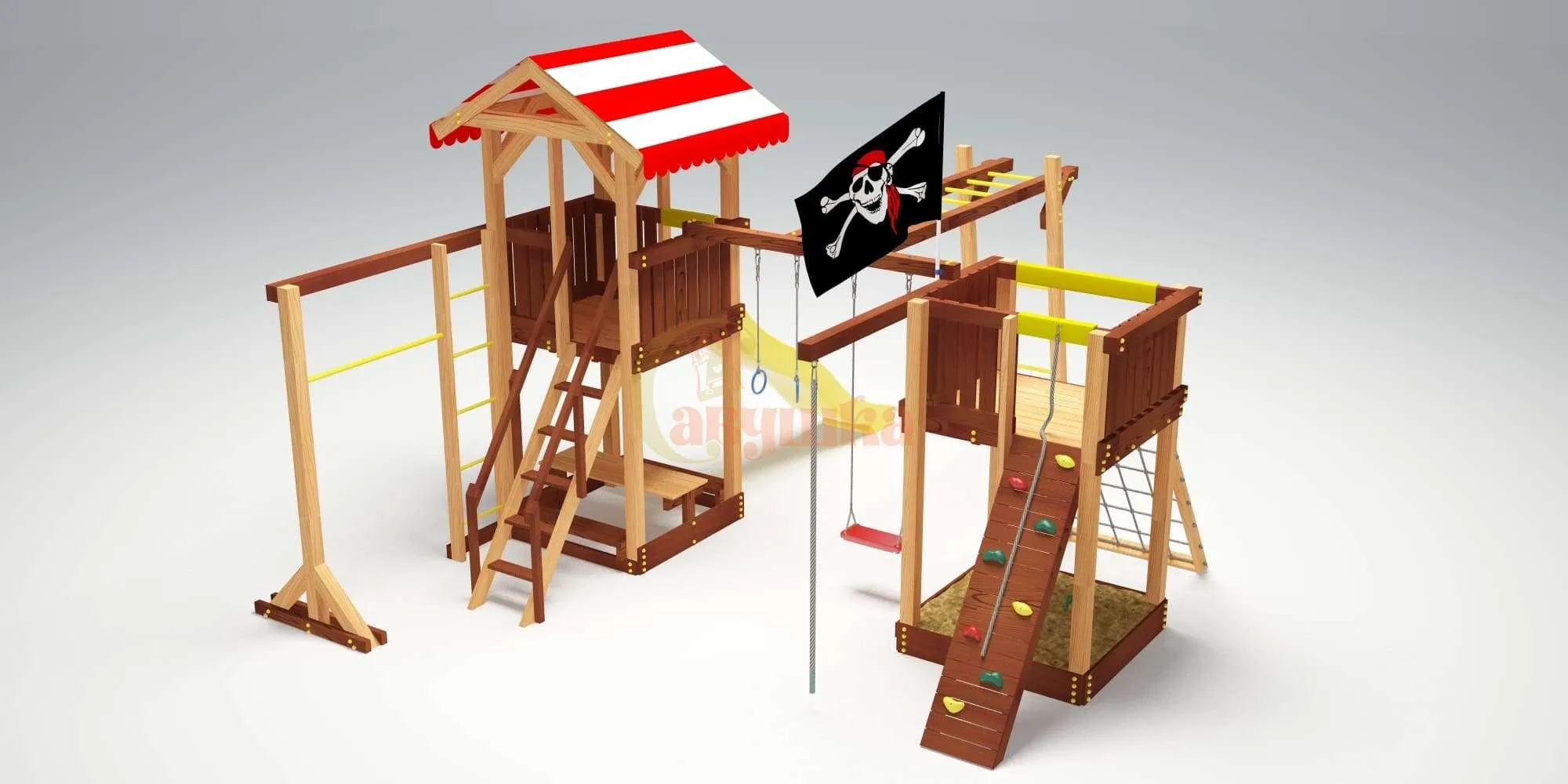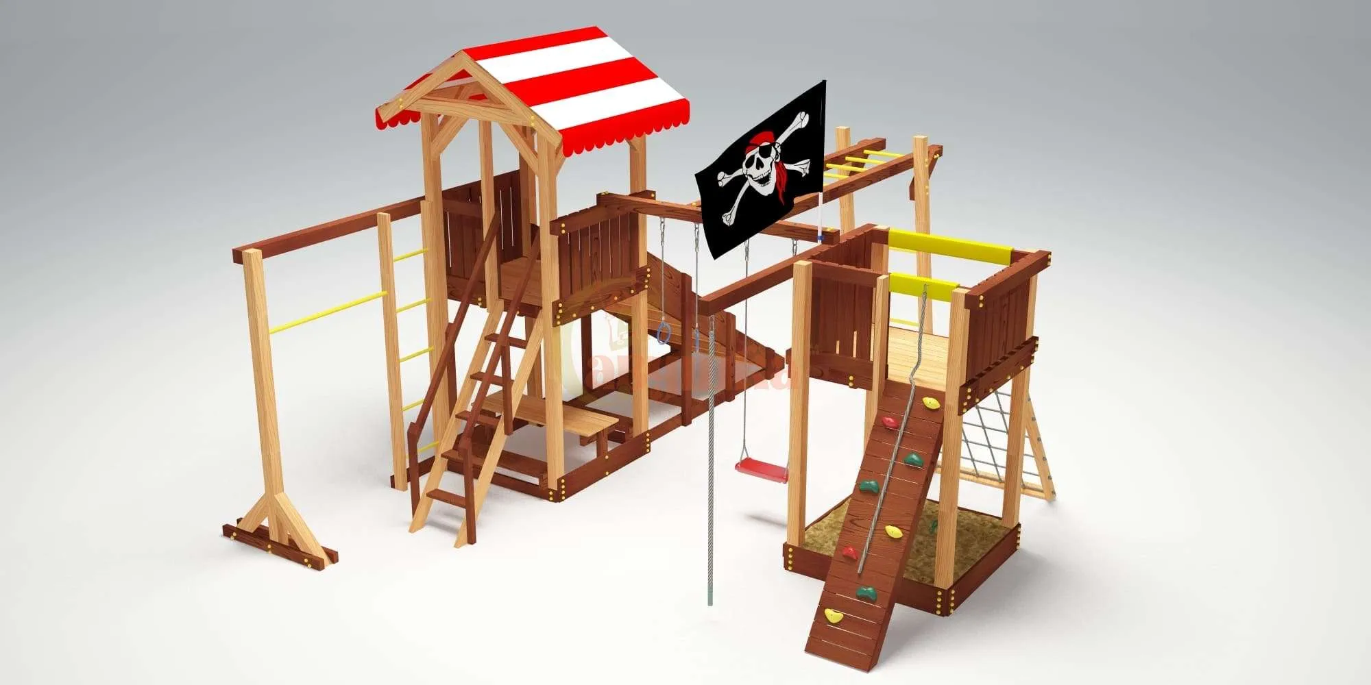 - Качели «Лодочка» и пиратский флаг создают атмосферу приключений.
