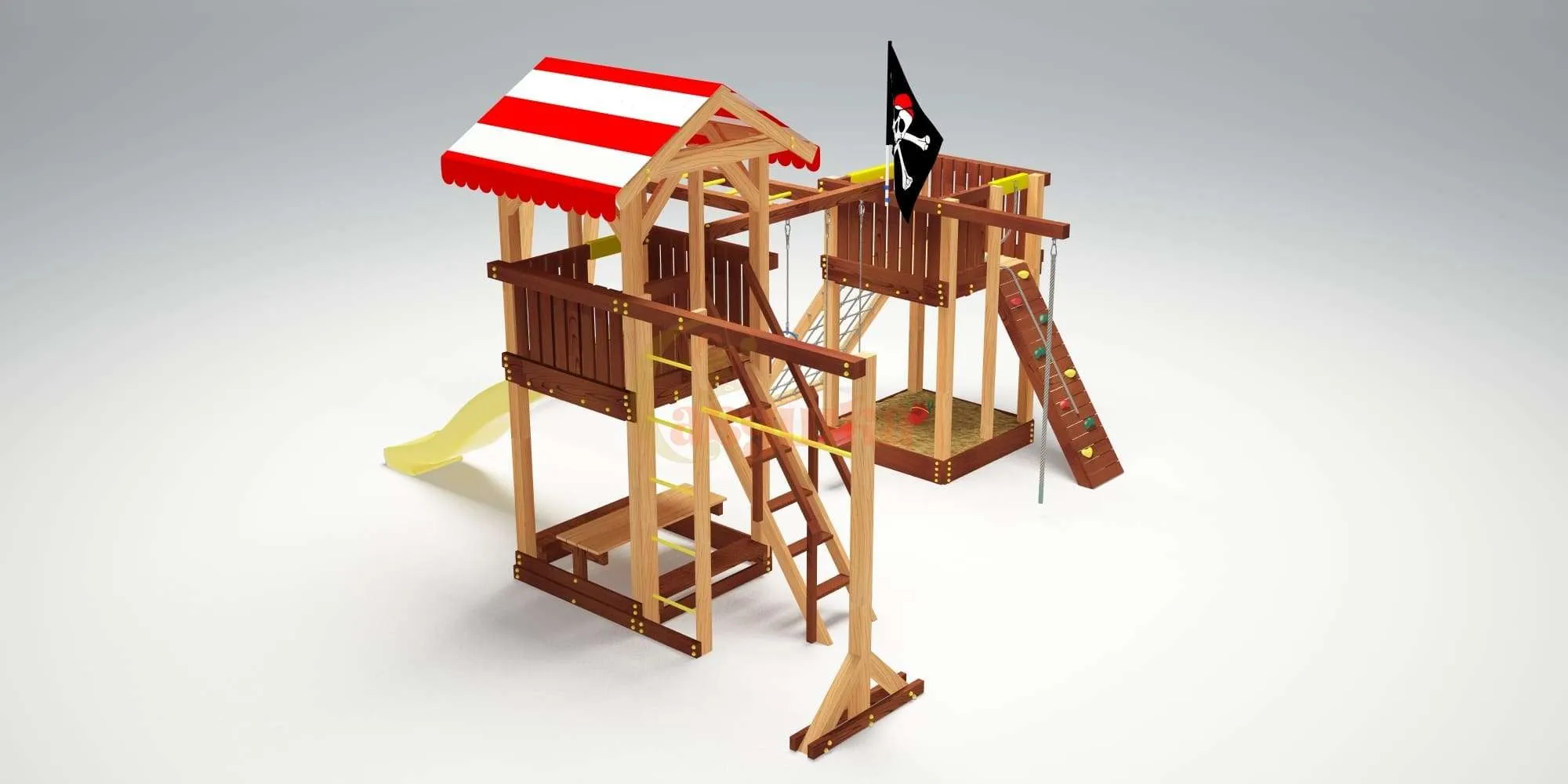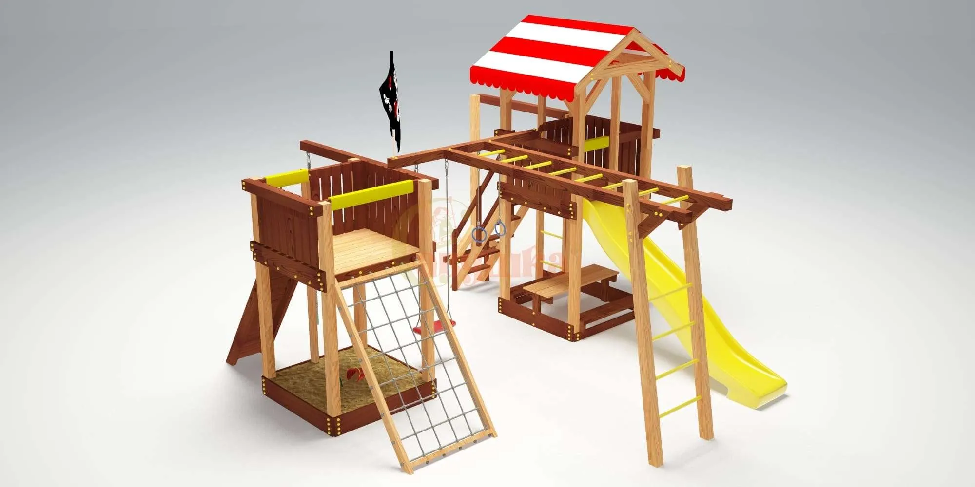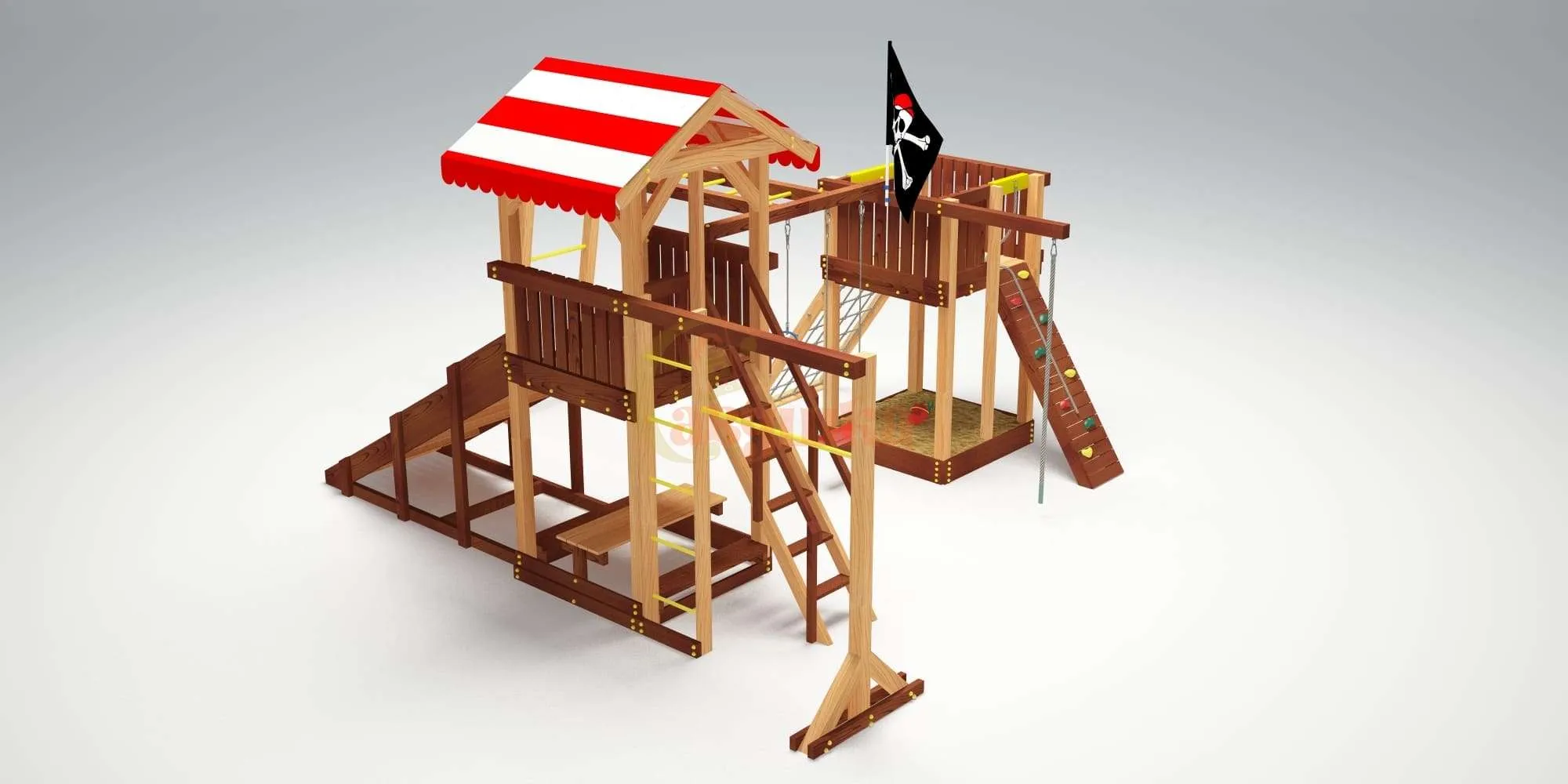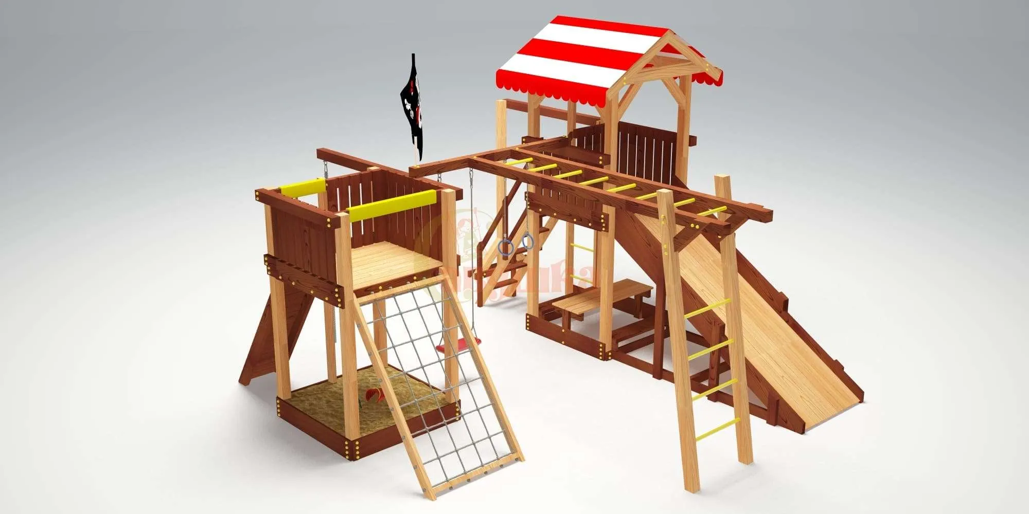 - Качели «Лодочка» и пиратский флаг создают атмосферу приключений.