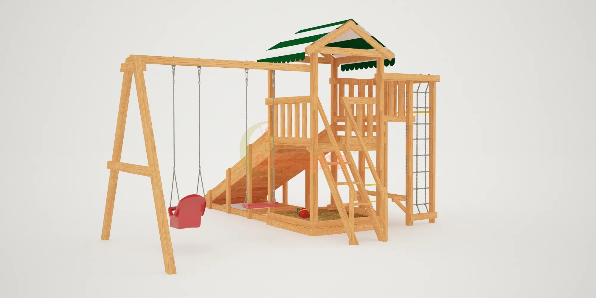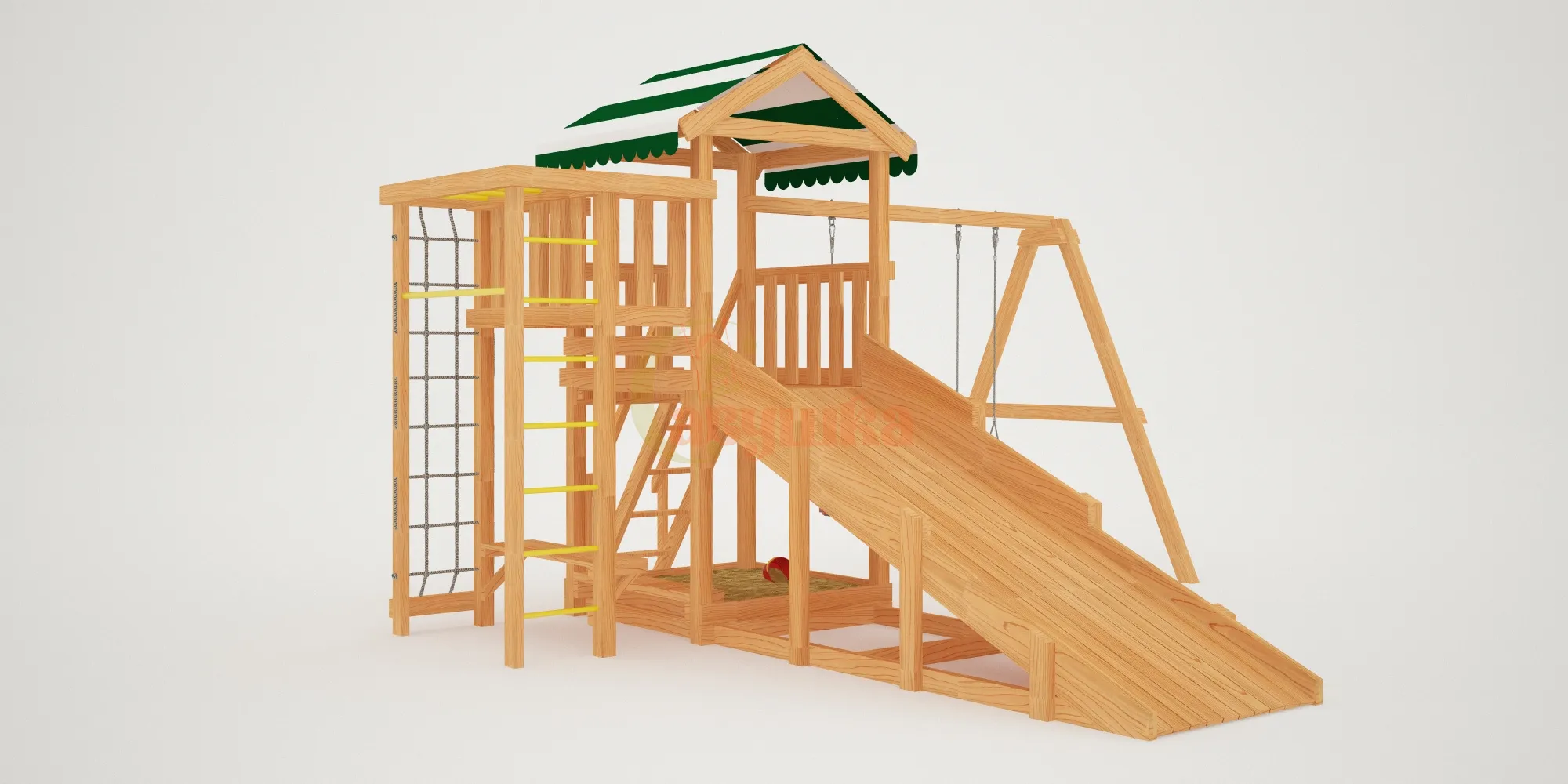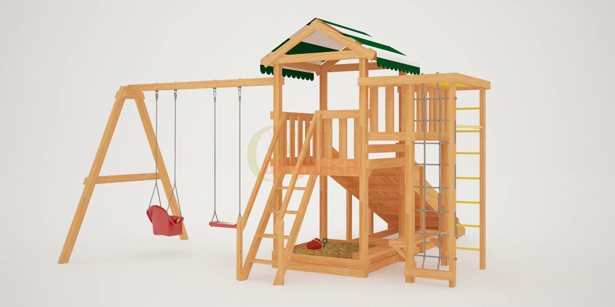 В основе — экологичный клеёный брус по ГОСТ. Все детали тщательно отшлифованы, углы скруглены, болты закрыты заглушками. Конструкция устойчива к перепадам температуры и влаге, безопасна для детей.