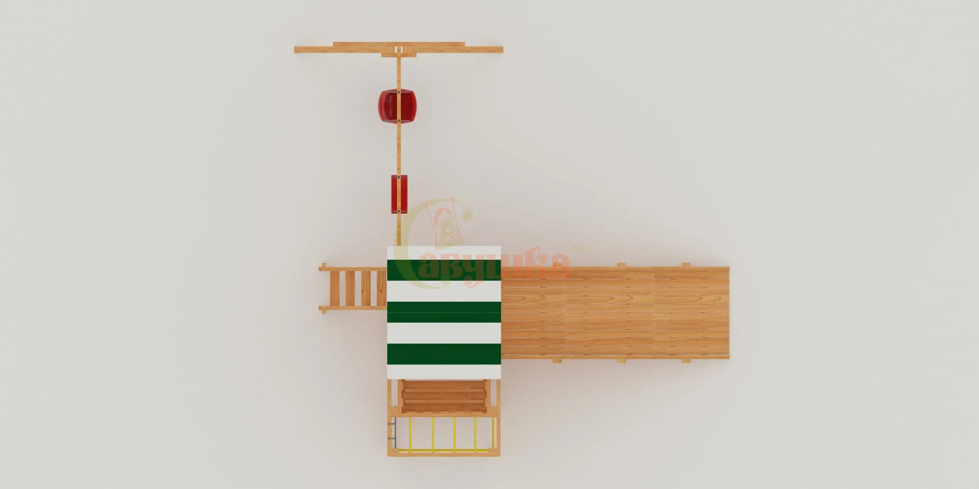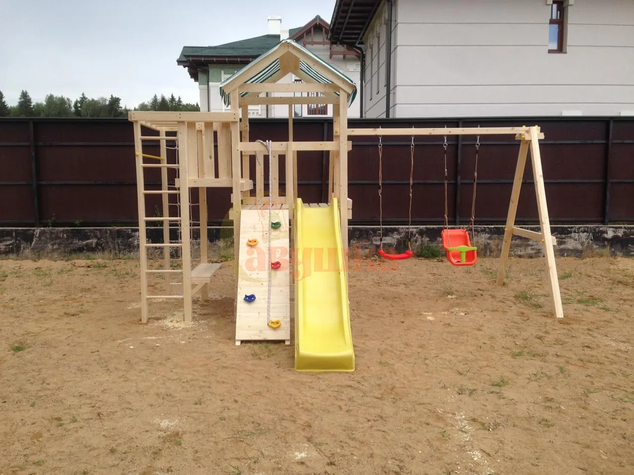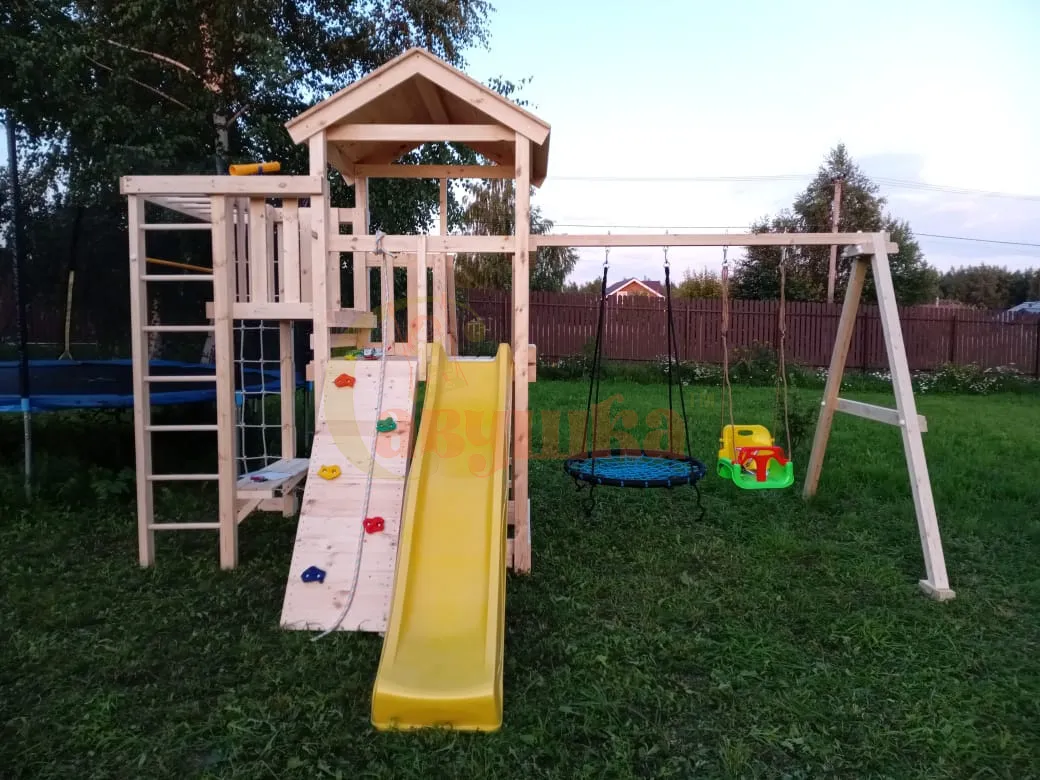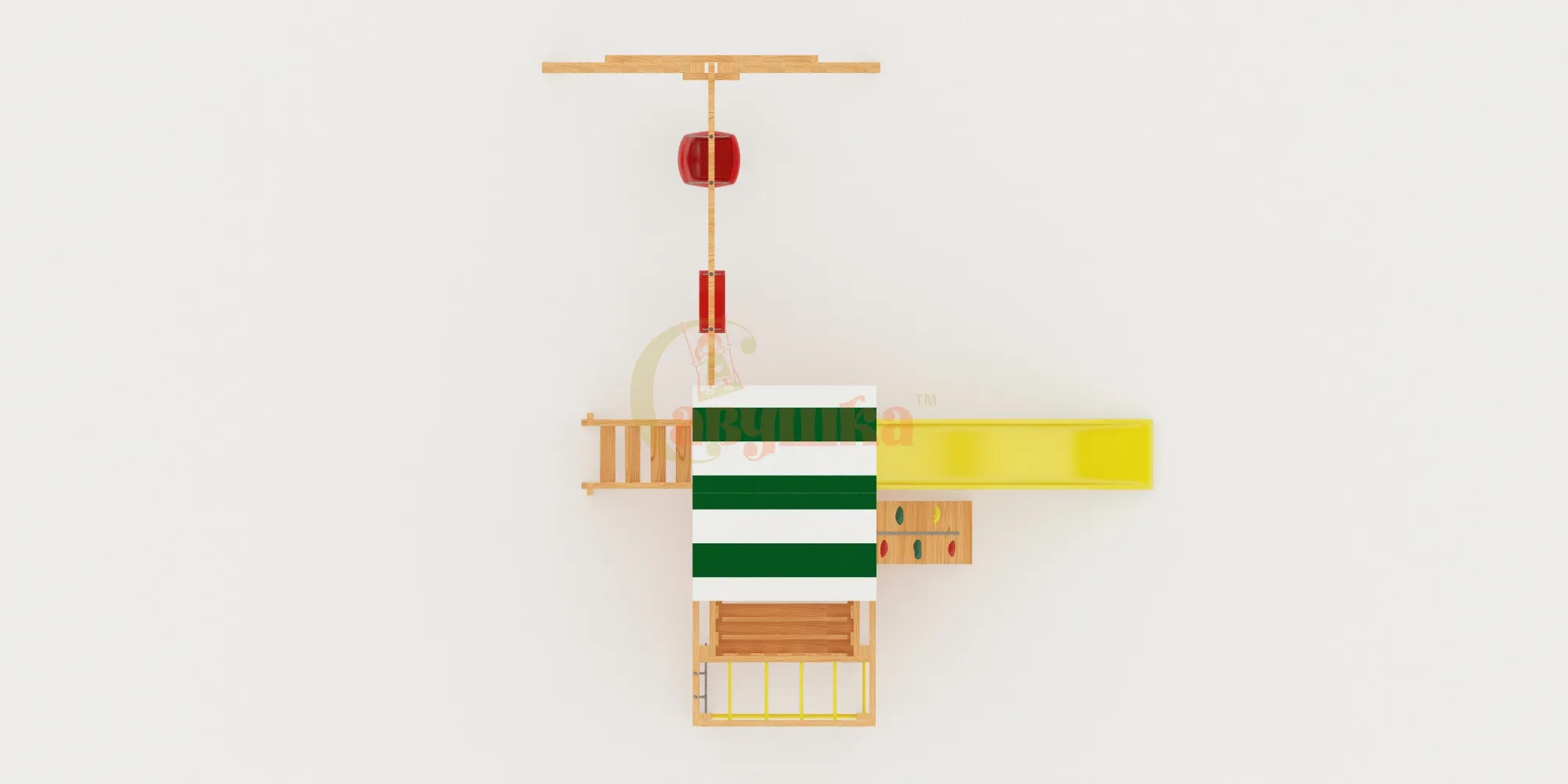 В основе — экологичный клеёный брус по ГОСТ. Все детали тщательно отшлифованы, углы скруглены, болты закрыты заглушками. Конструкция устойчива к перепадам температуры и влаге, безопасна для детей.