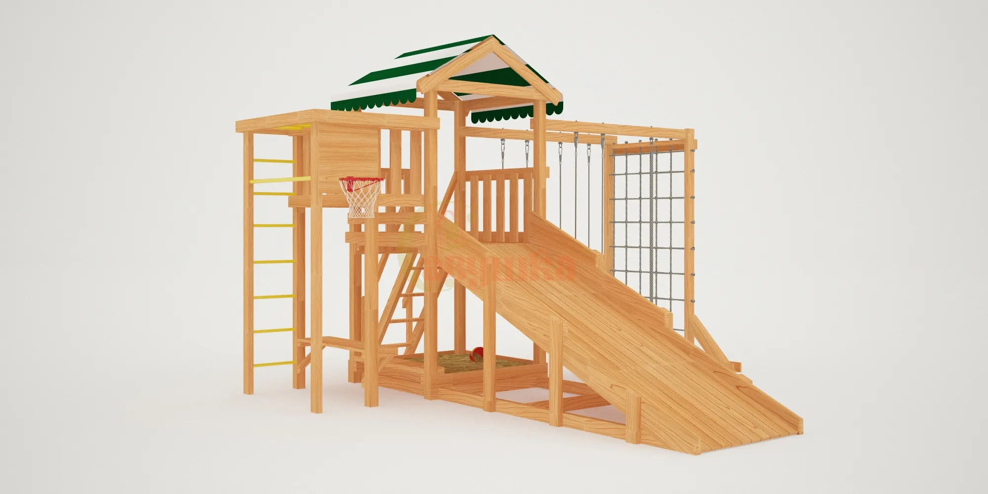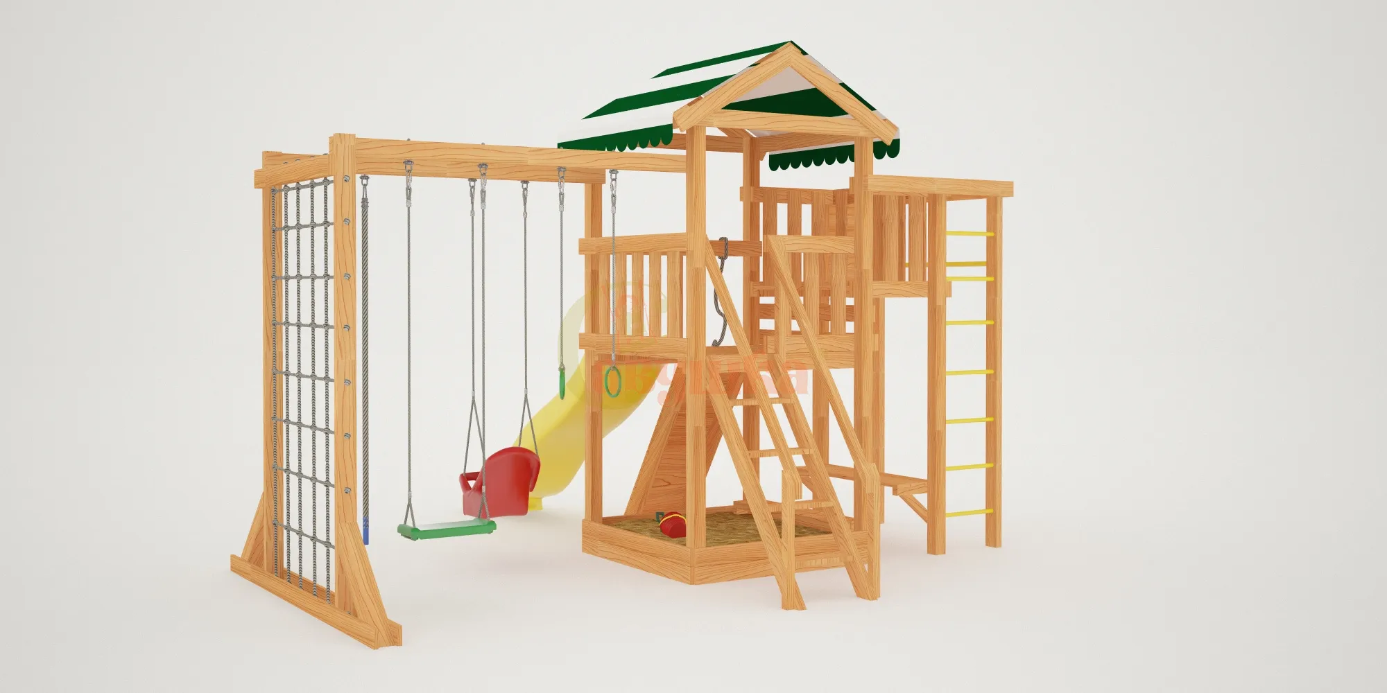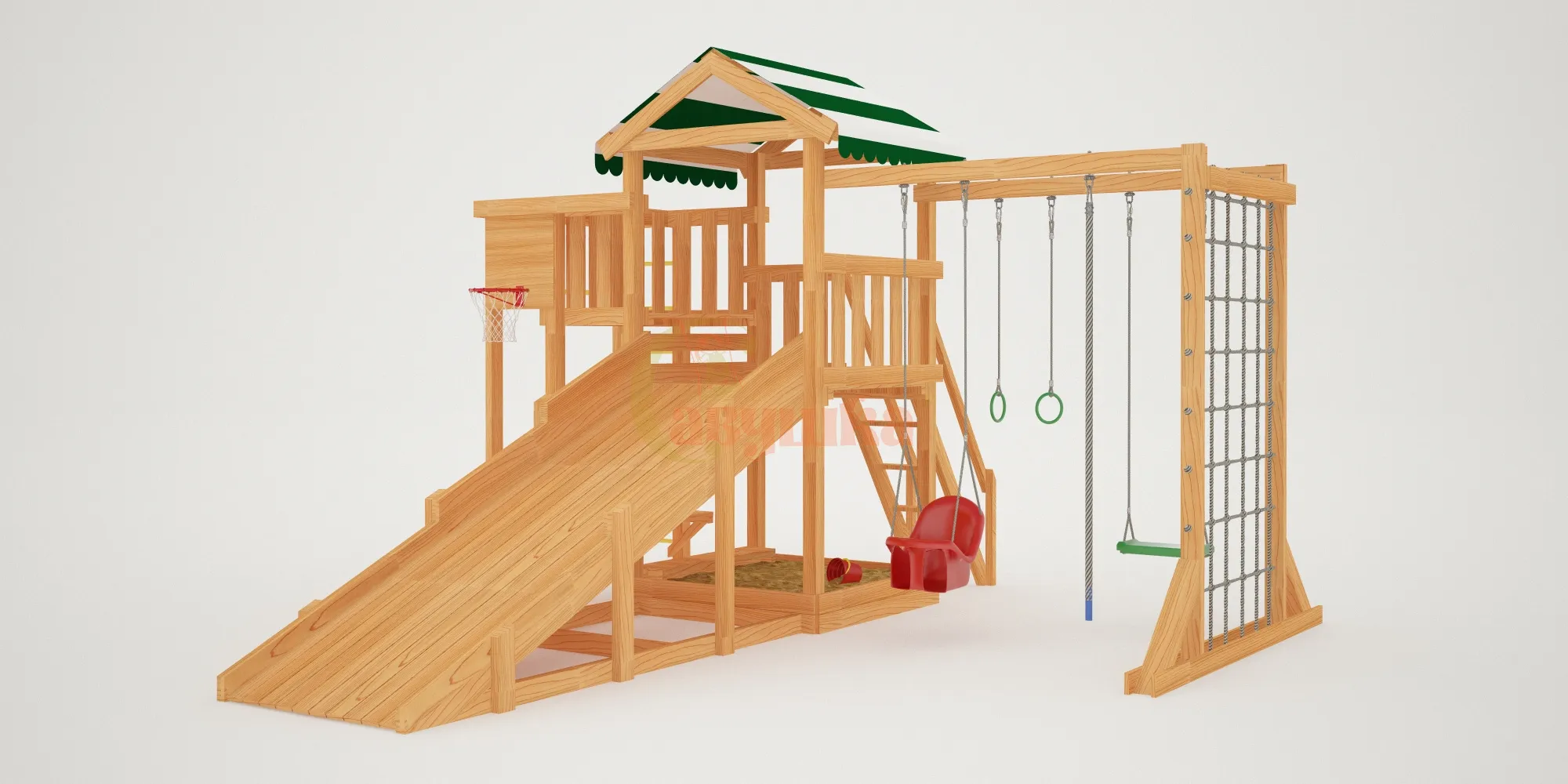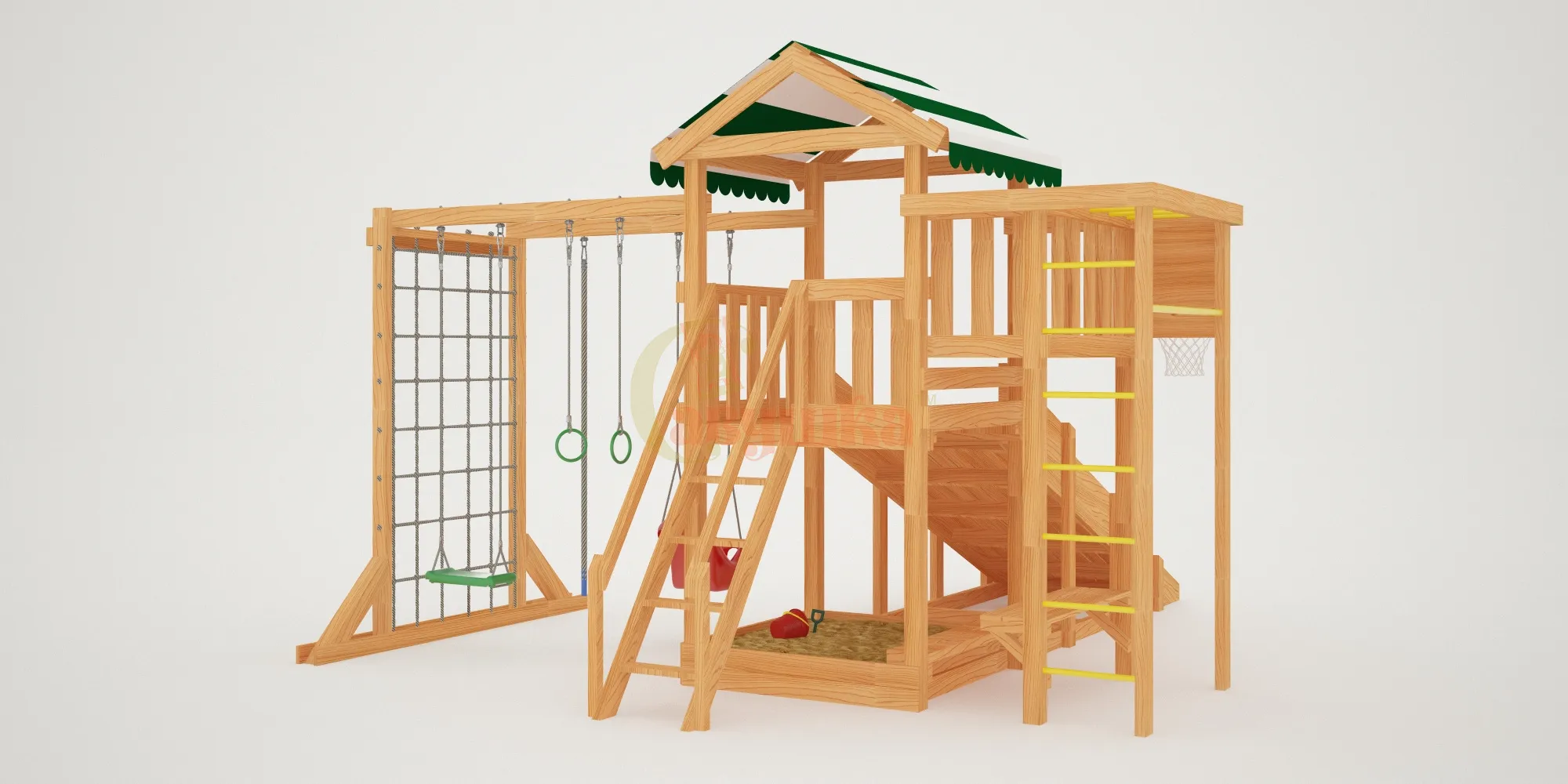 Каркас изготовлен из натурального клеёного бруса, прошедшего двойную шлифовку. Все углы скруглены, болтовые соединения закрыты заглушками. Конструкция соответствует ГОСТ 52169-2012 и гарантирует полную безопасность детей.