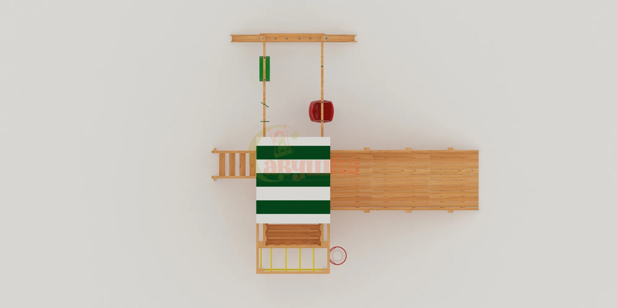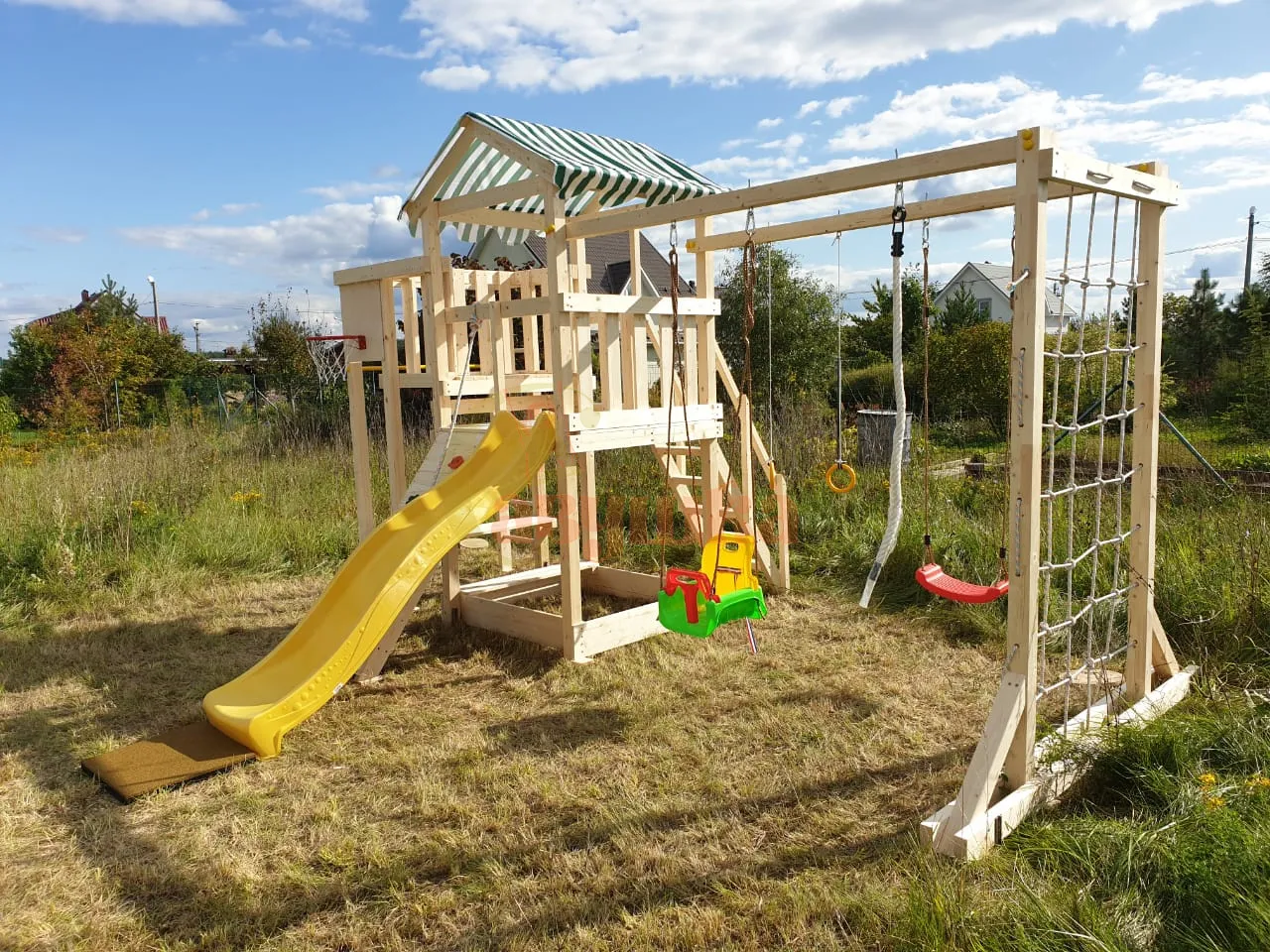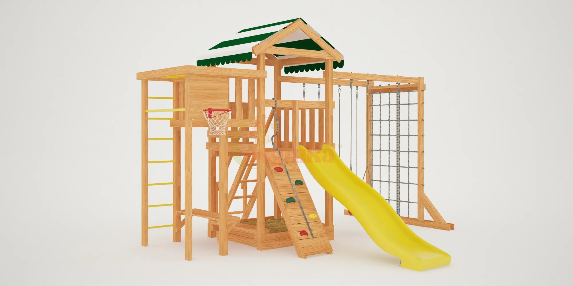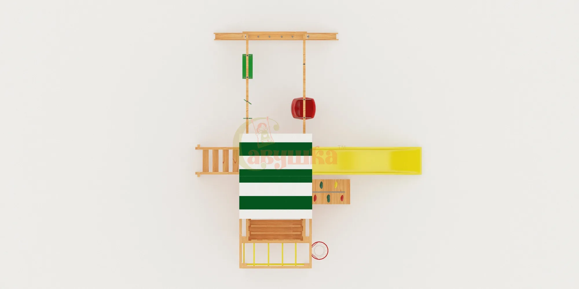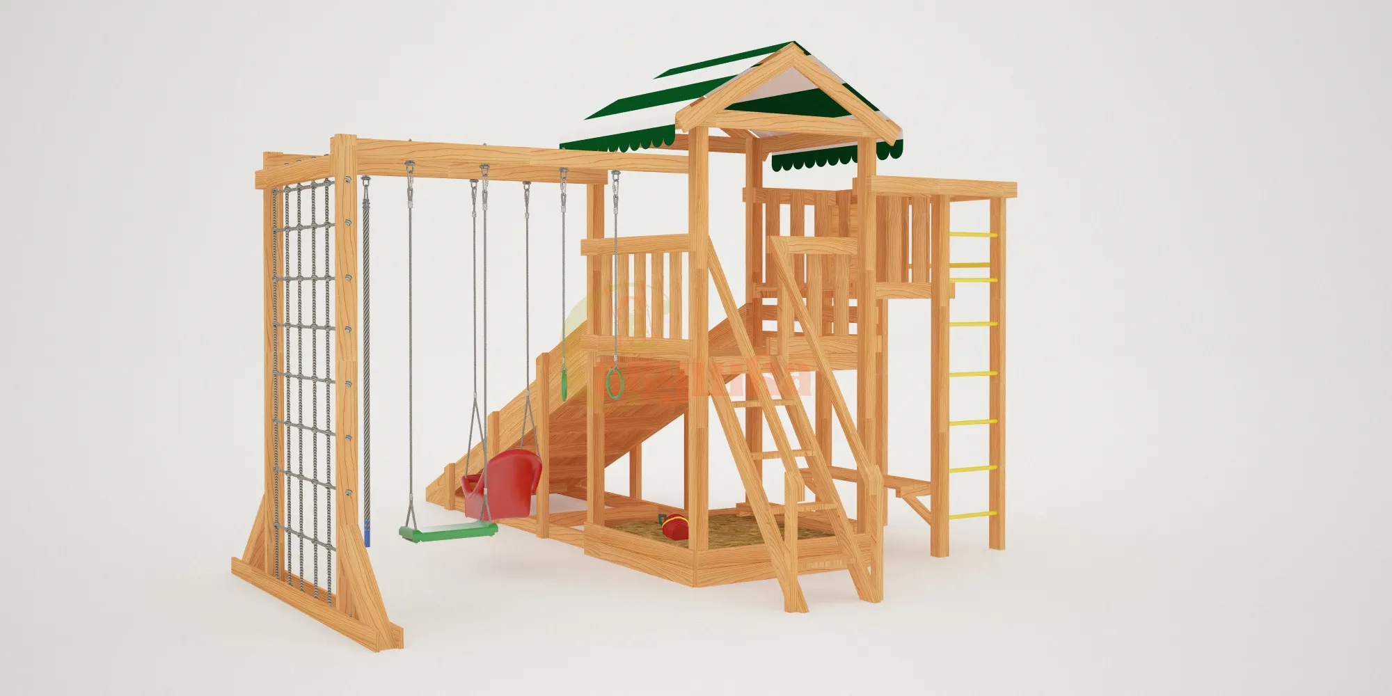 Каркас изготовлен из натурального клеёного бруса, прошедшего двойную шлифовку. Все углы скруглены, болтовые соединения закрыты заглушками. Конструкция соответствует ГОСТ 52169-2012 и гарантирует полную безопасность детей.