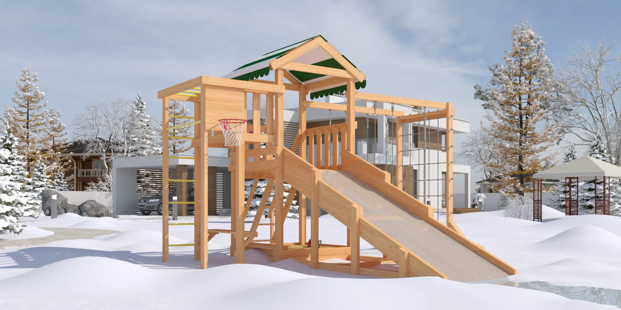- Всесезонная конструкция: горка + зимний скат.