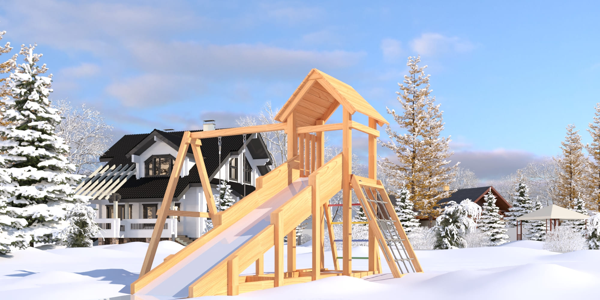 Прочная конструкция из клееного бруса, безопасные углы, сертификация по ГОСТ — это гарантия долговечности и надёжности. Площадка выдержит активные игры и любую погоду.