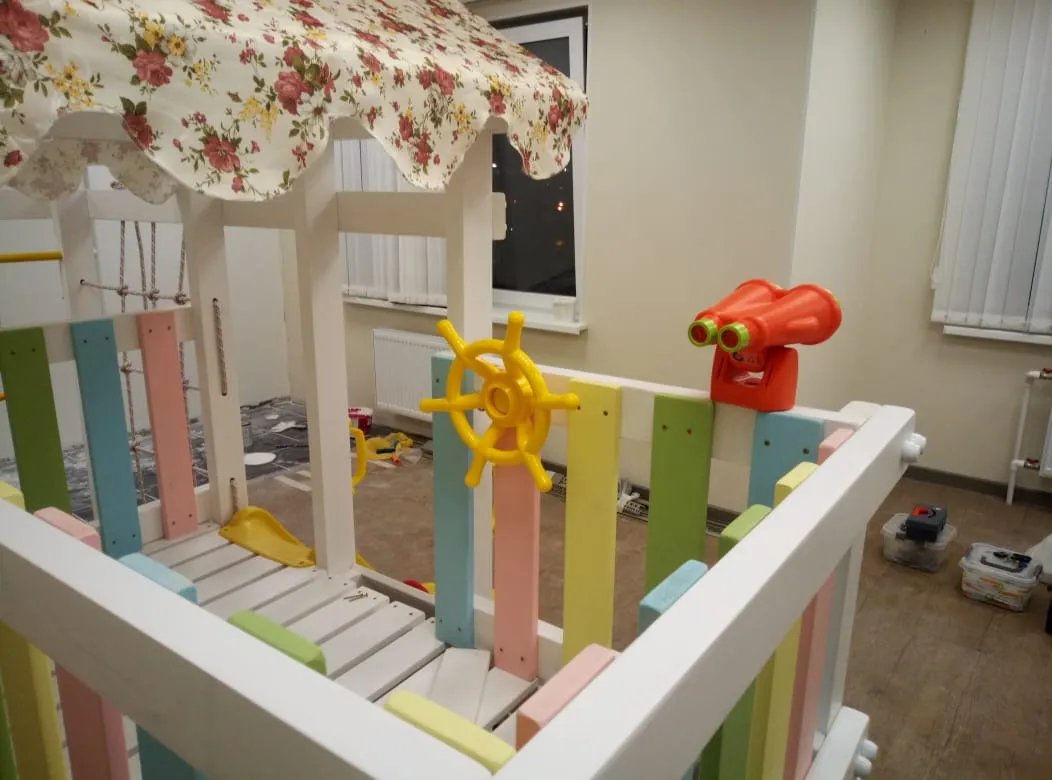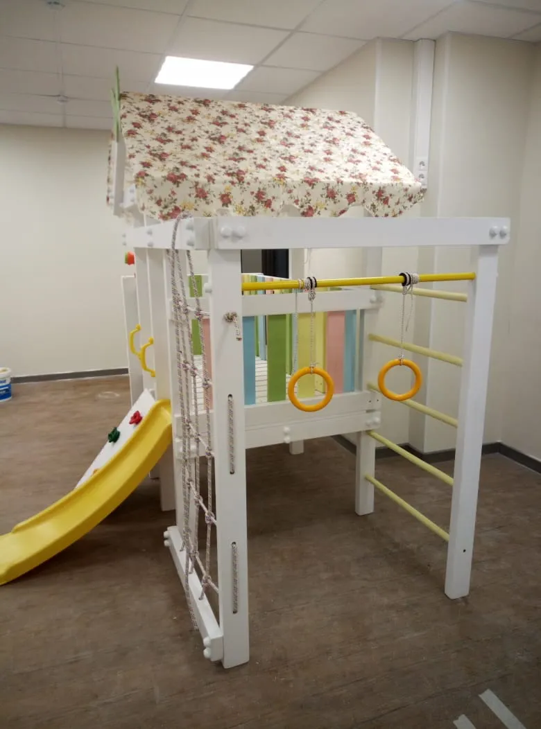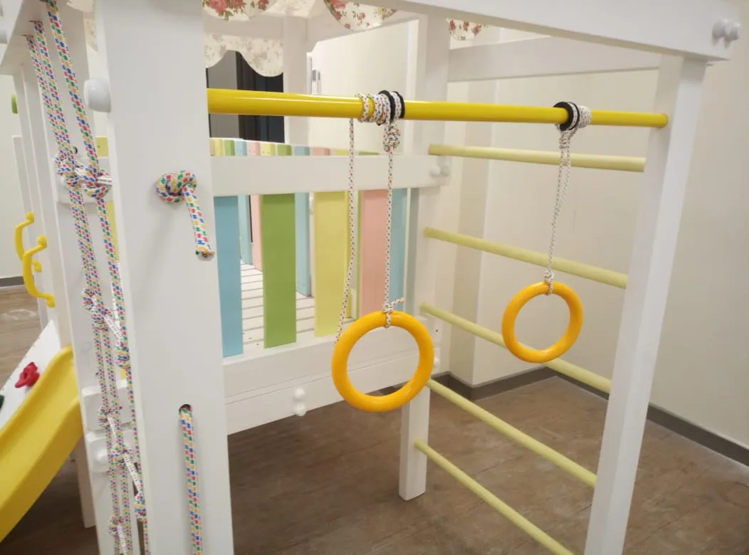 Площадка оснащена современным спортивным и игральным оборудованием из Бельгии, без острых углов и с крепкими соединениями.